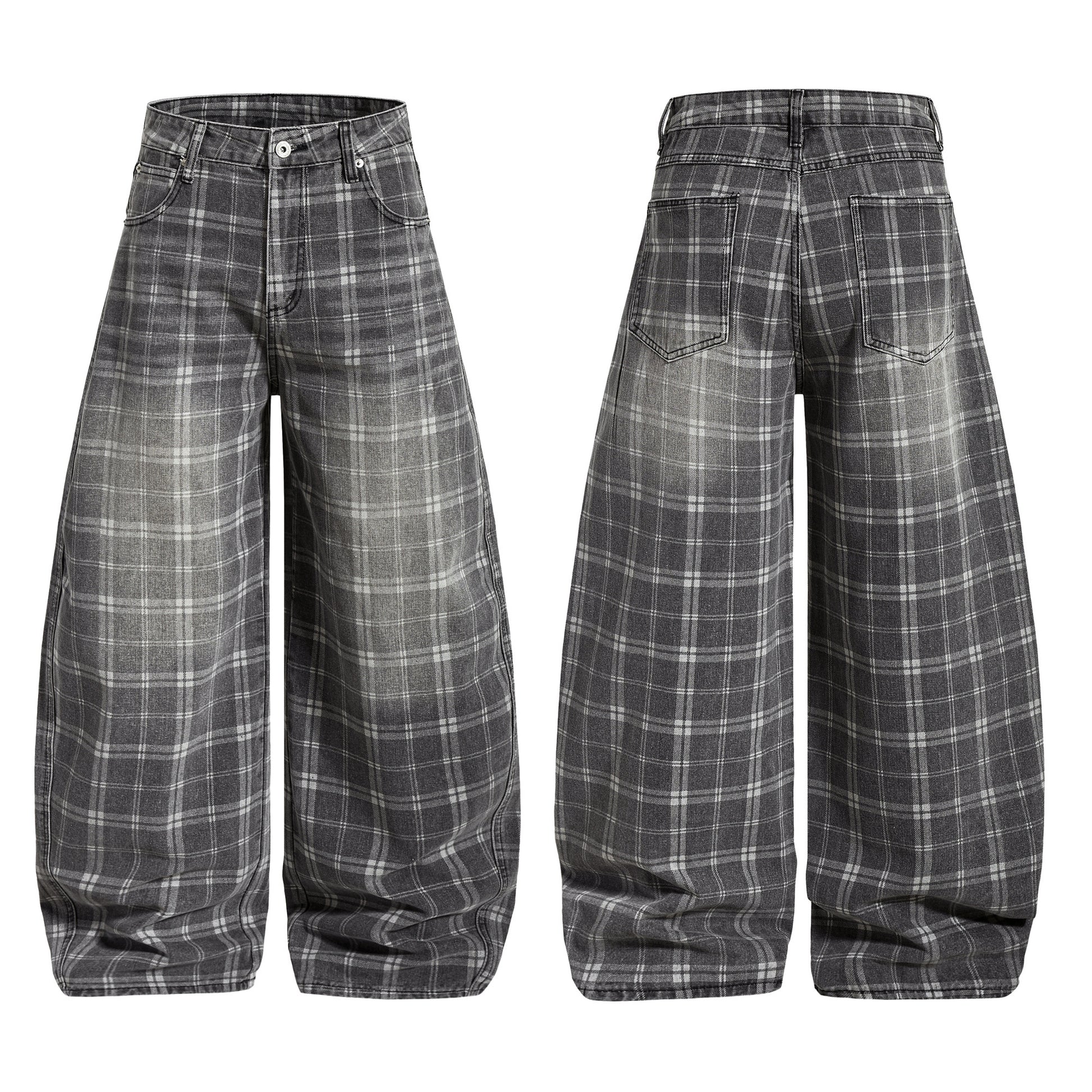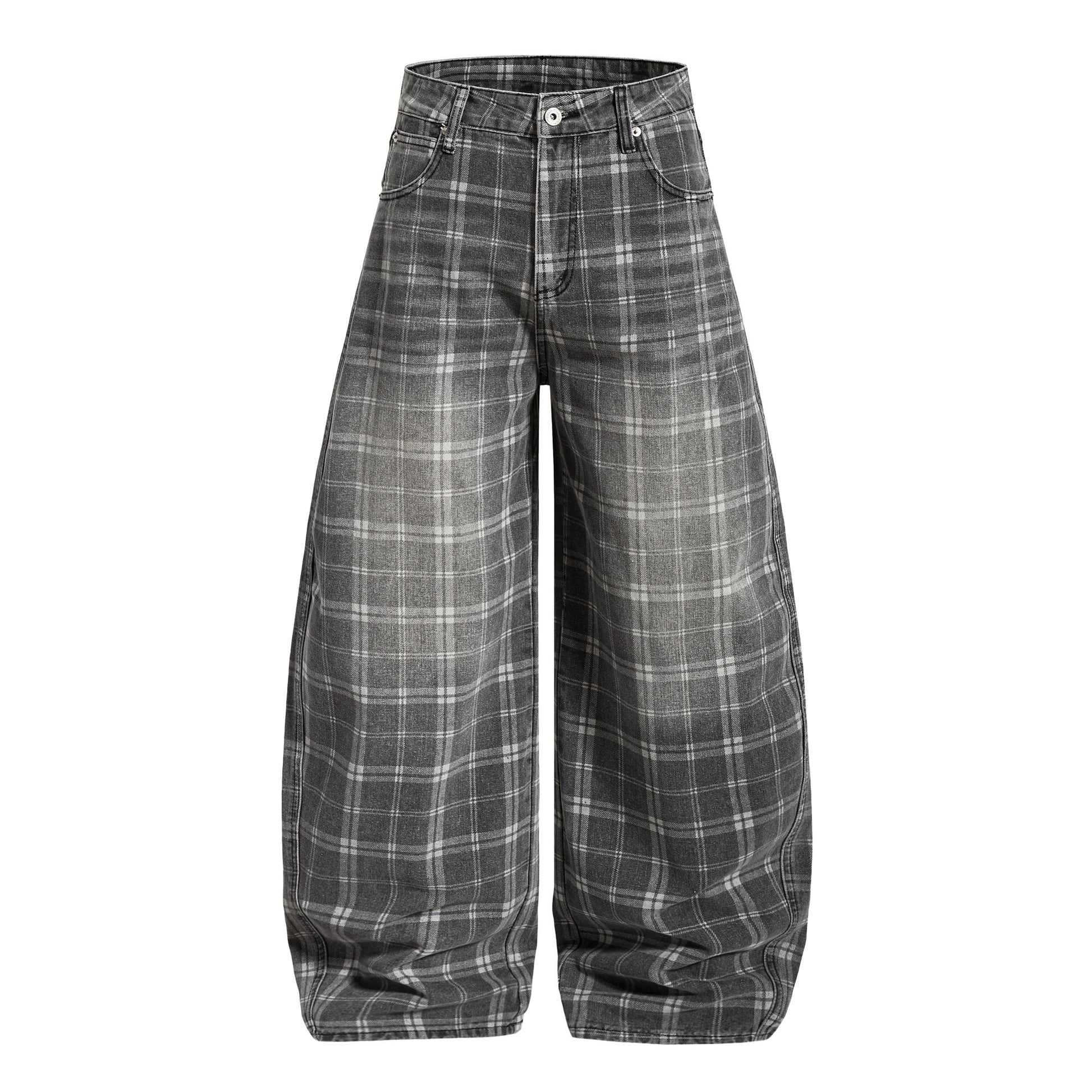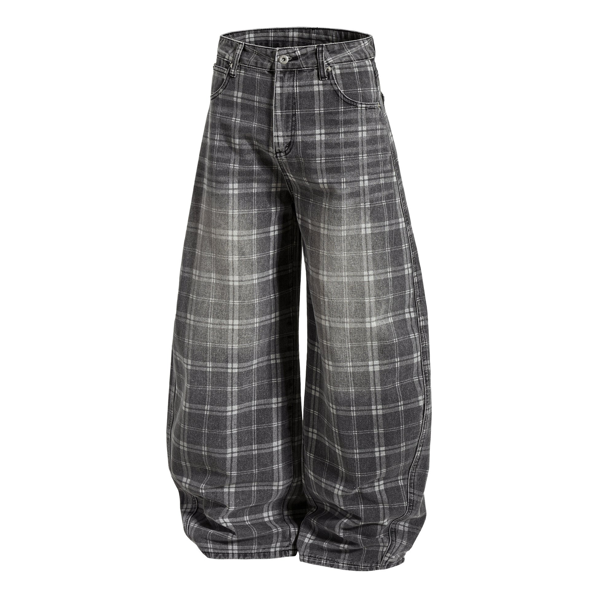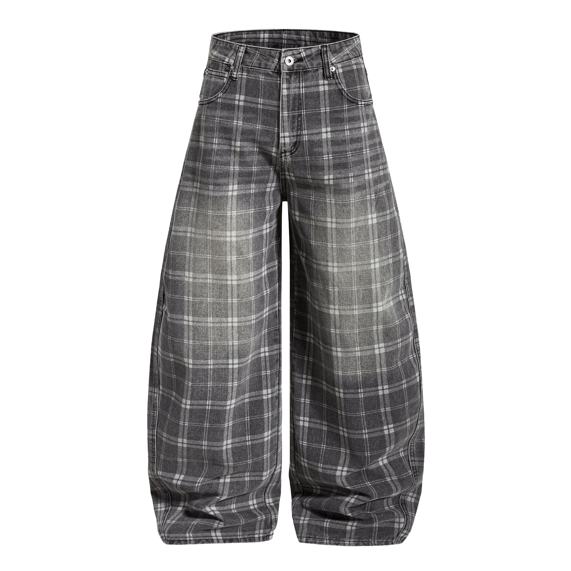 Clothing details: Oversized wide-leg silhouette, vintage grey plaid pattern, structured waistband, classic five-pocket construction, reinforced stitching, stacked leg finish, relaxed street fit.