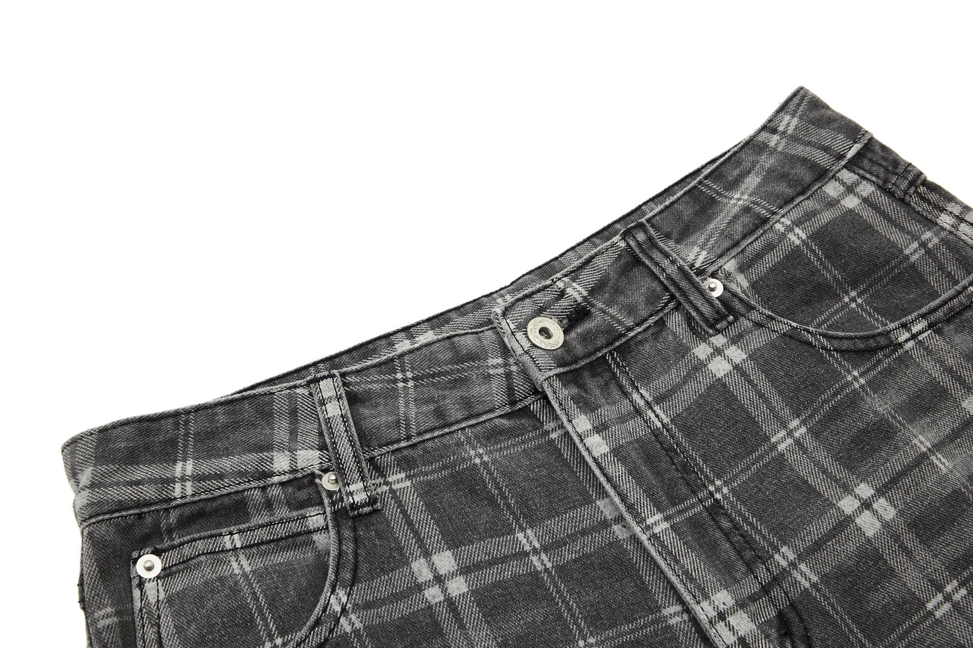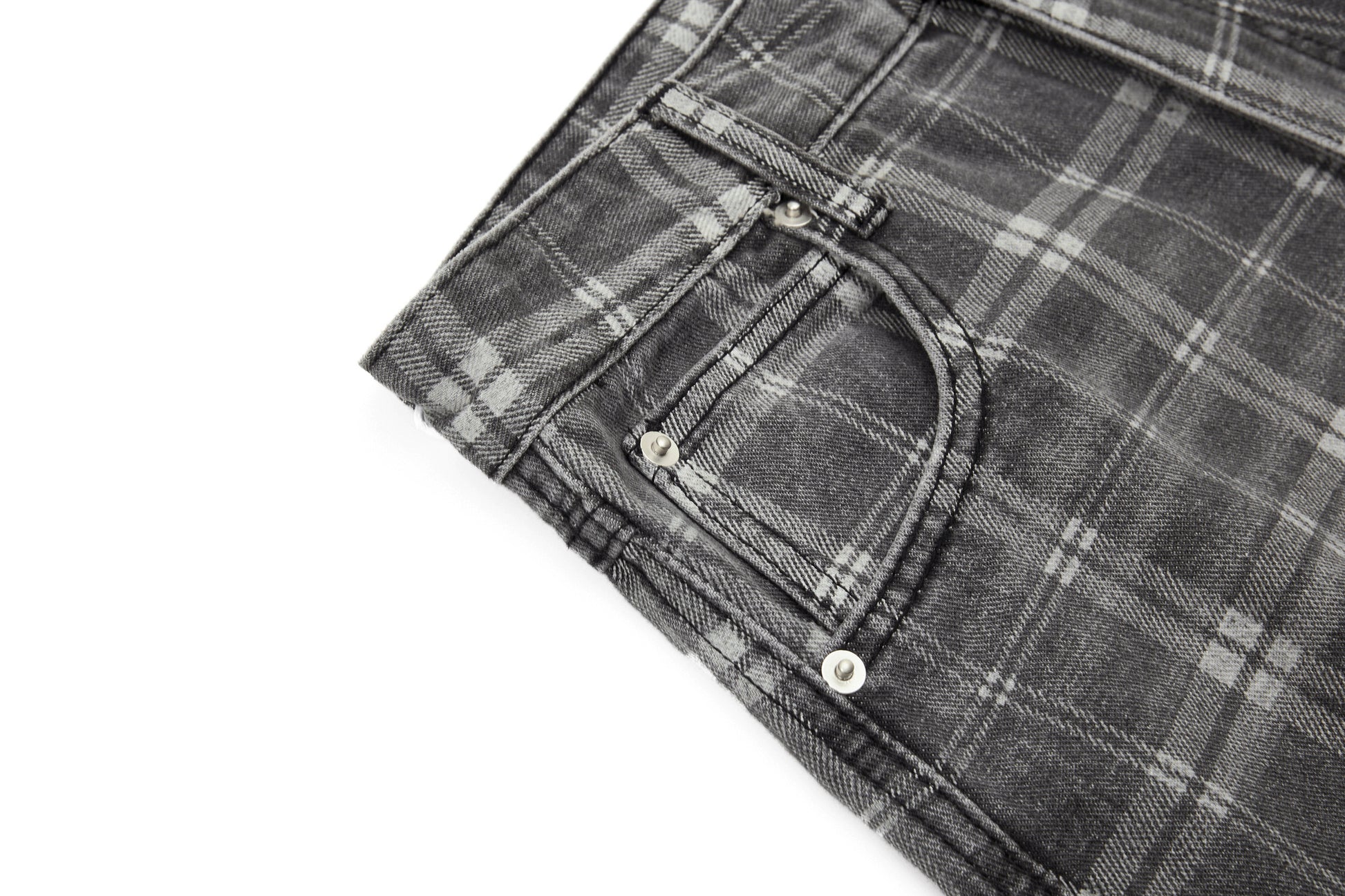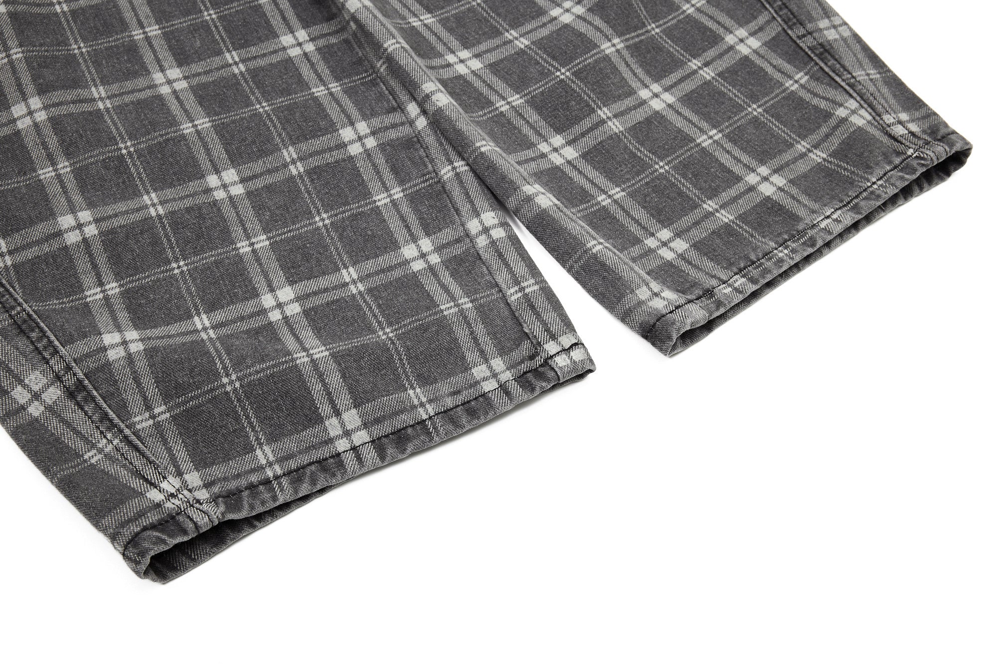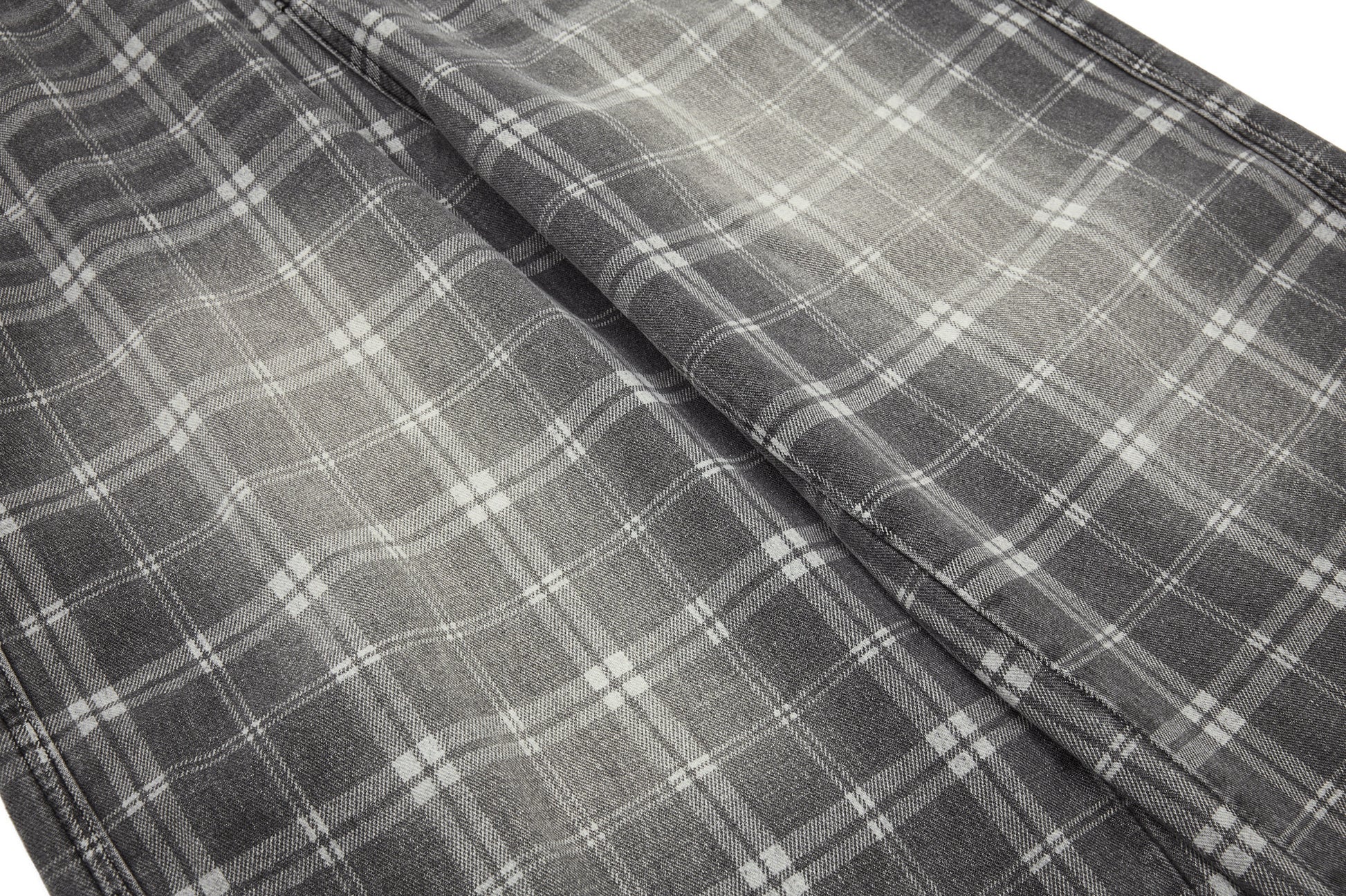 Clothing details: Oversized wide-leg silhouette, vintage grey plaid pattern, structured waistband, classic five-pocket construction, reinforced stitching, stacked leg finish, relaxed street fit.