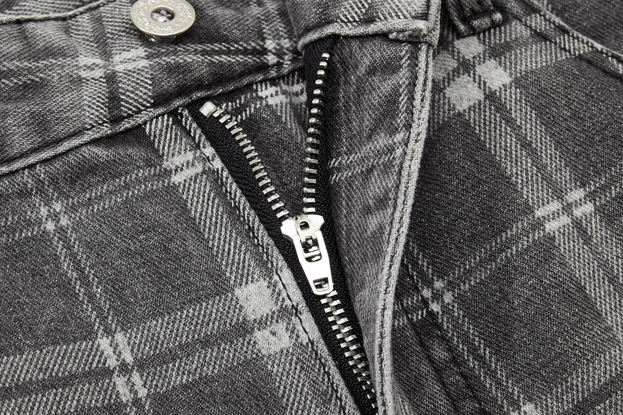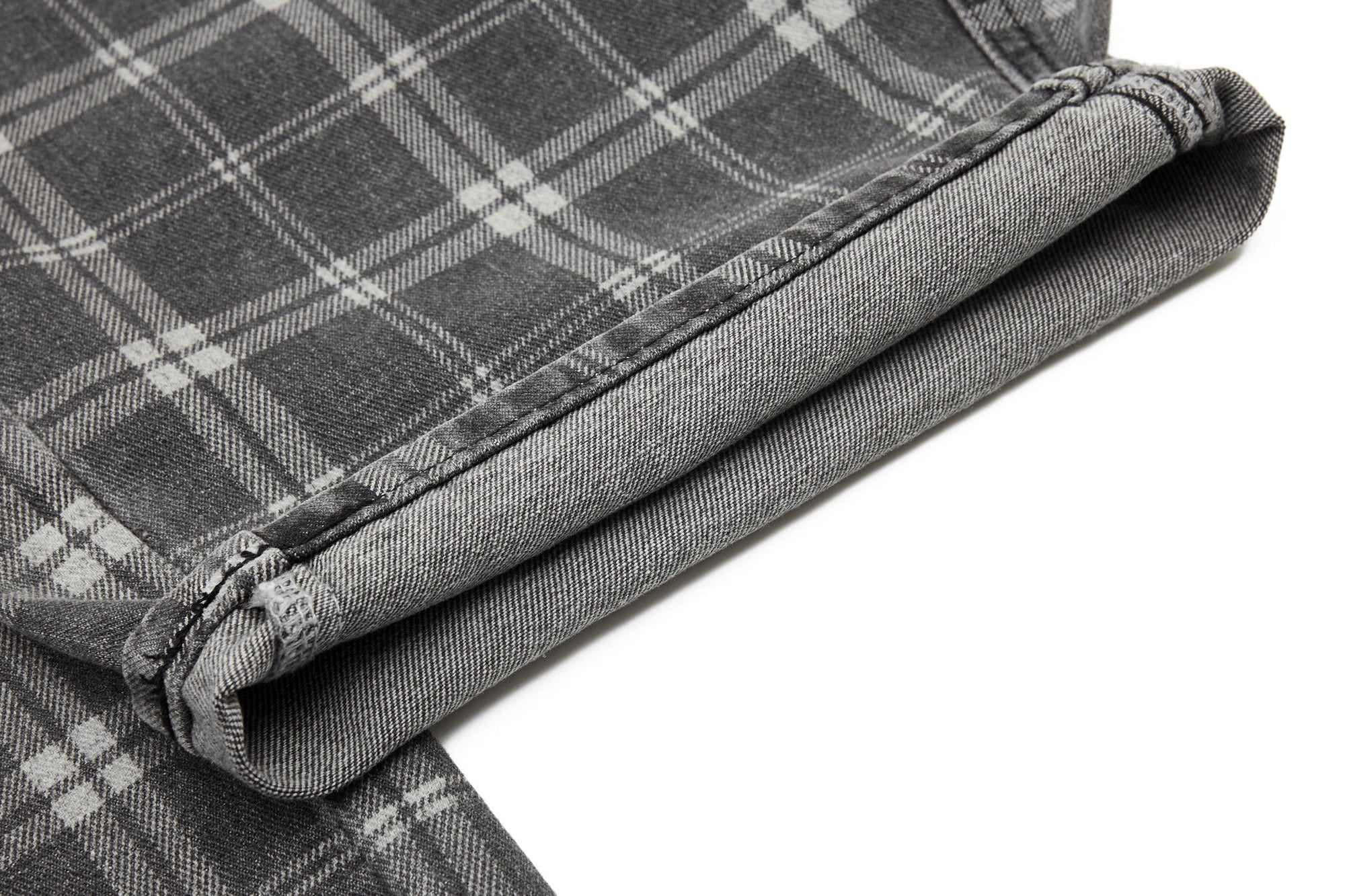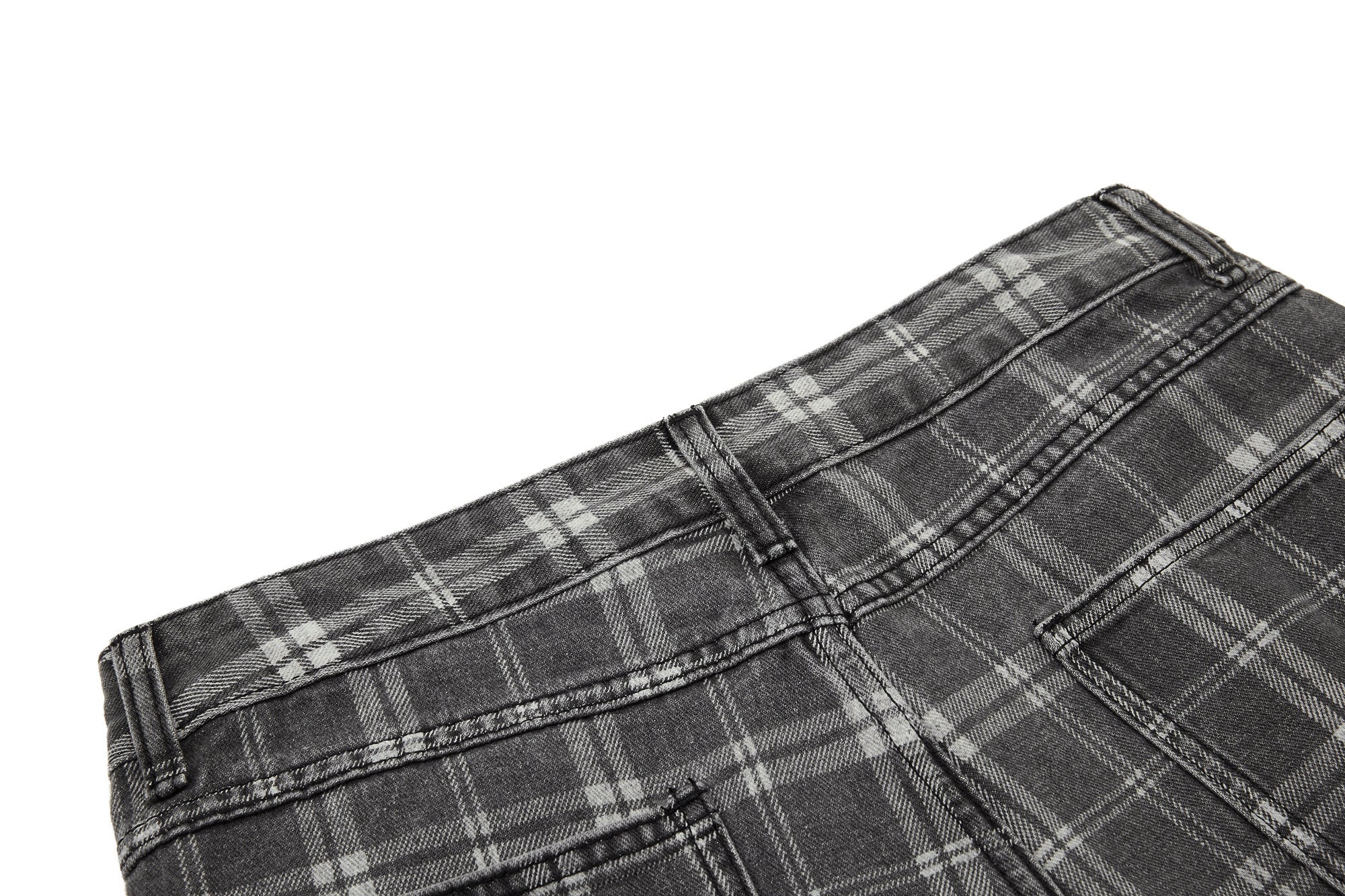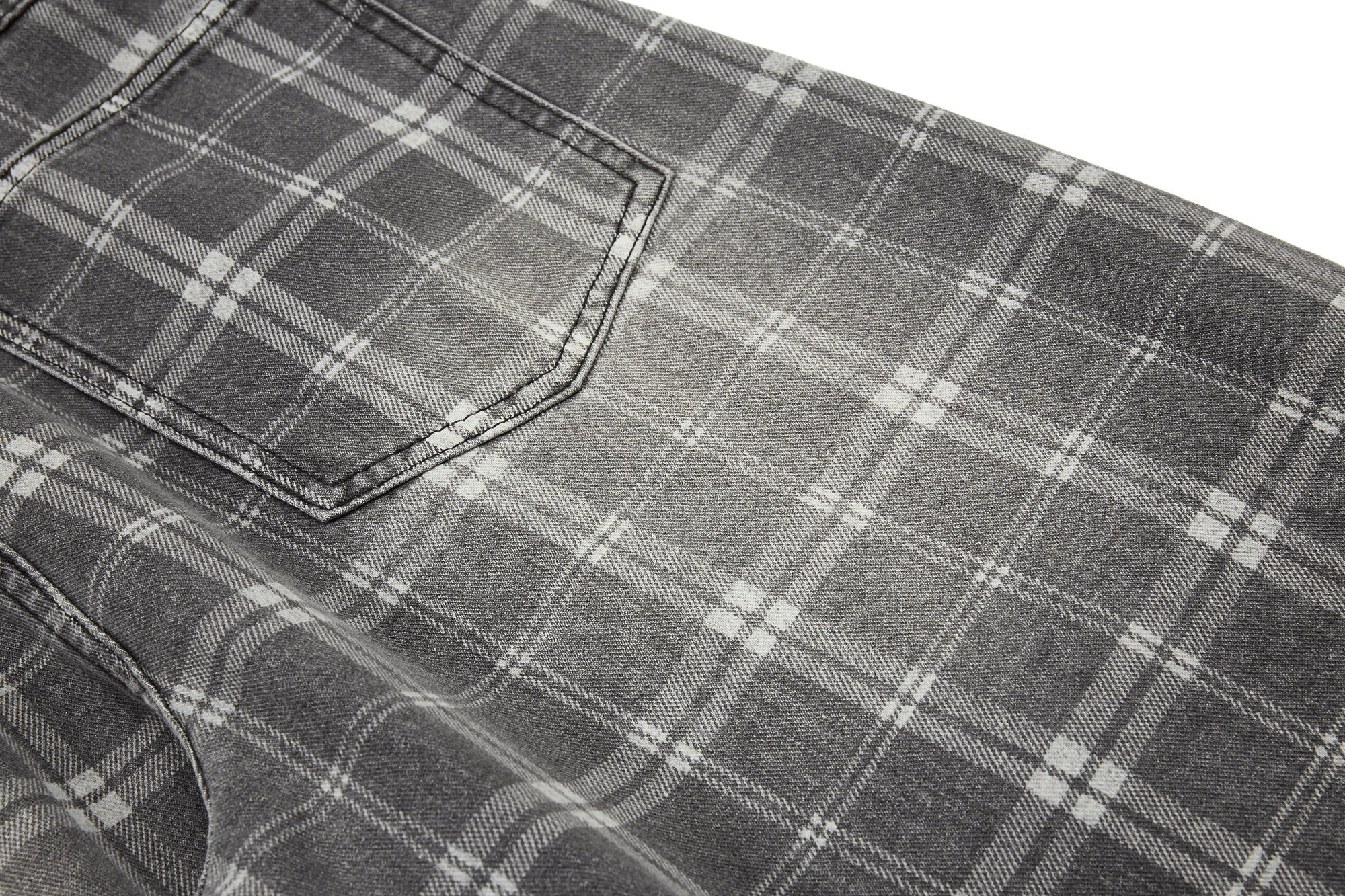 Clothing details: Oversized wide-leg silhouette, vintage grey plaid pattern, structured waistband, classic five-pocket construction, reinforced stitching, stacked leg finish, relaxed street fit.