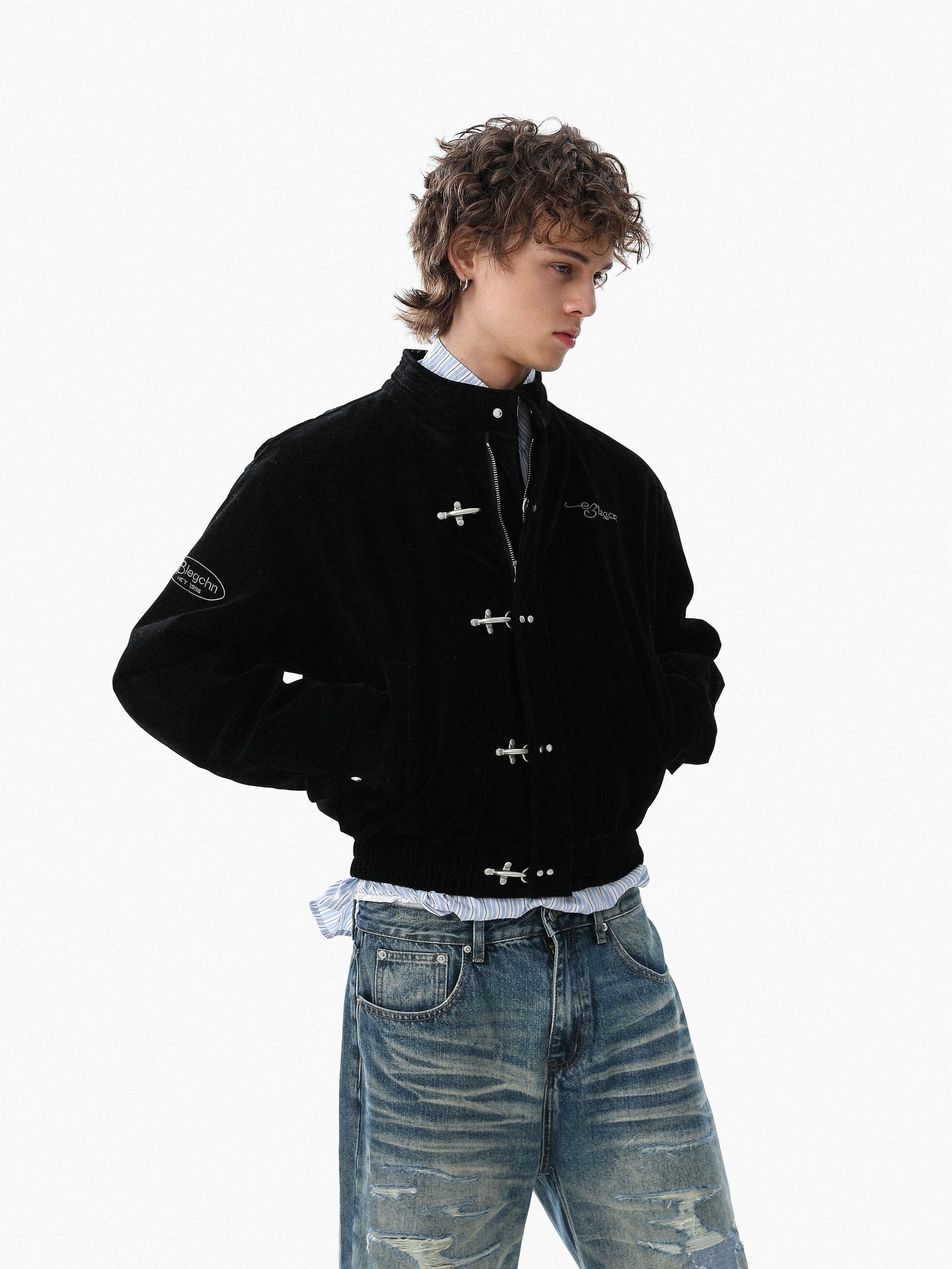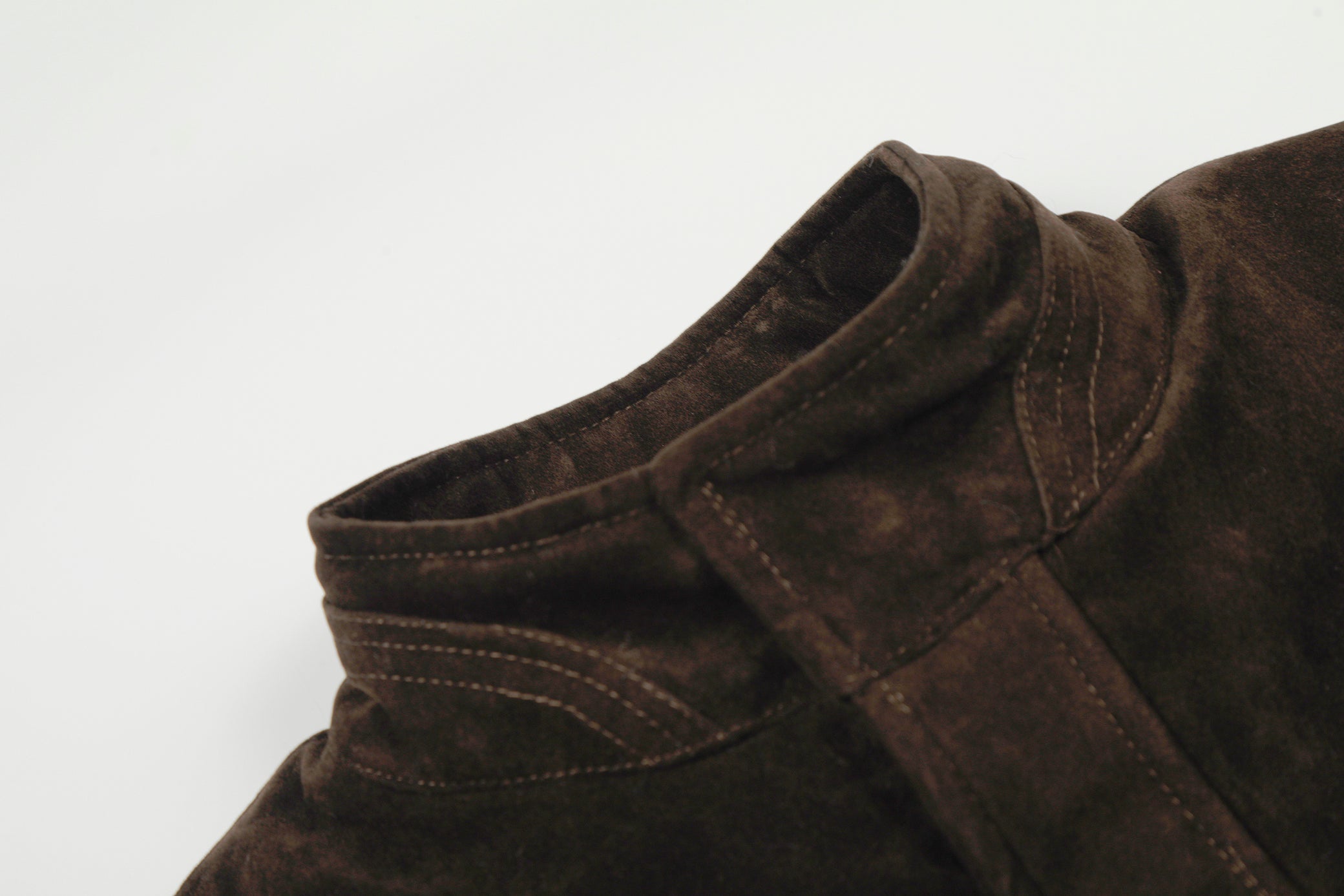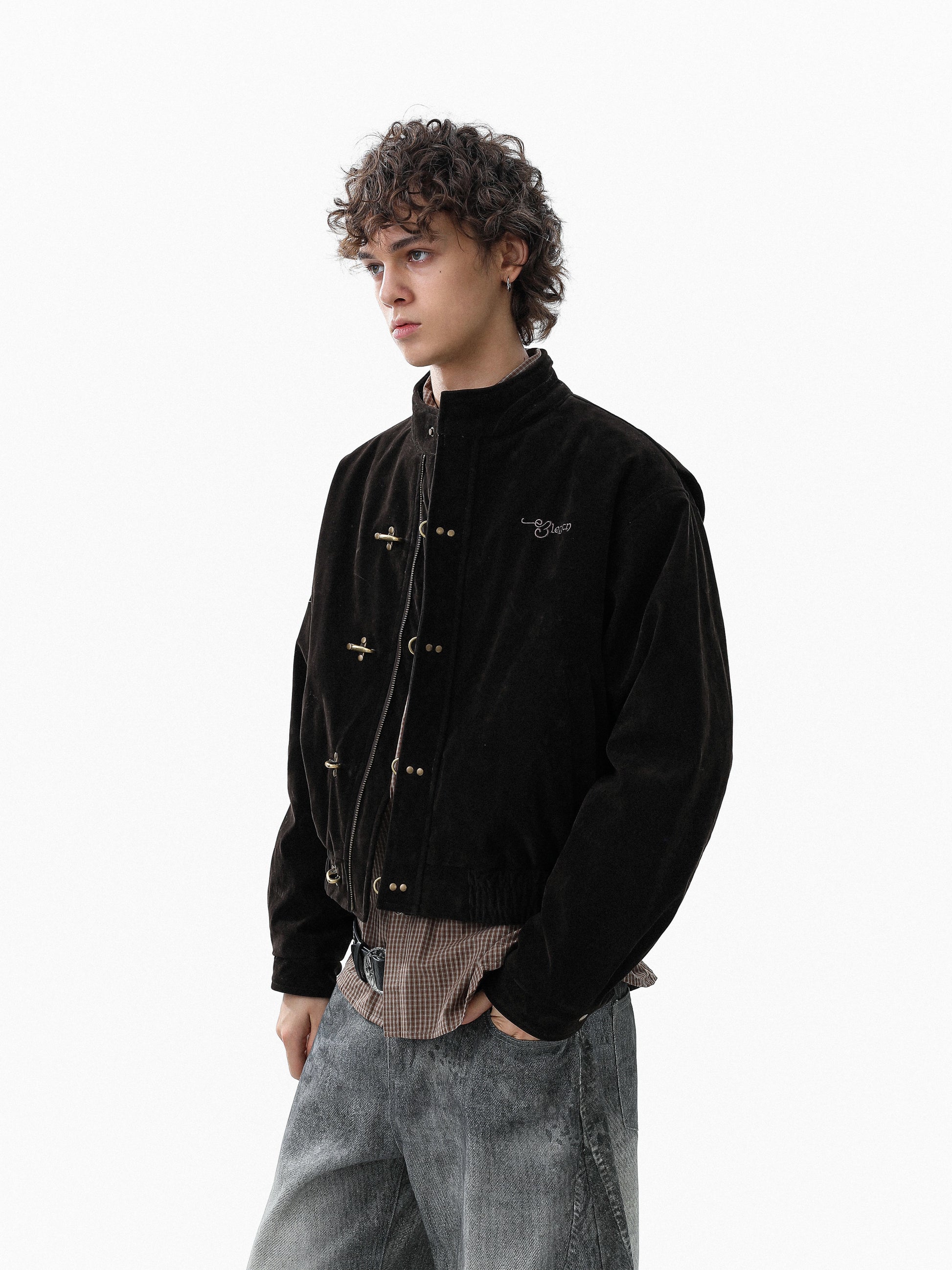 Clothing details: Suede-textured fabric, stand collar, metal clasp fasteners, detailed back embroidery, elastic hem and cuffs
