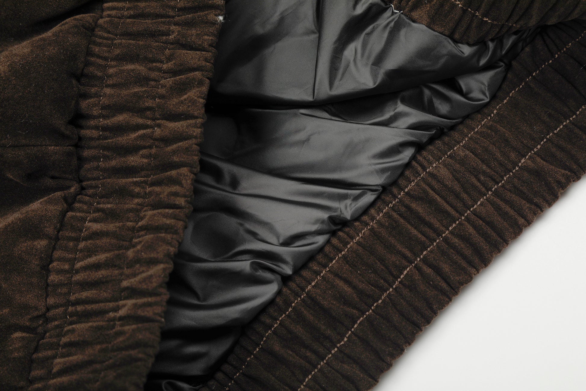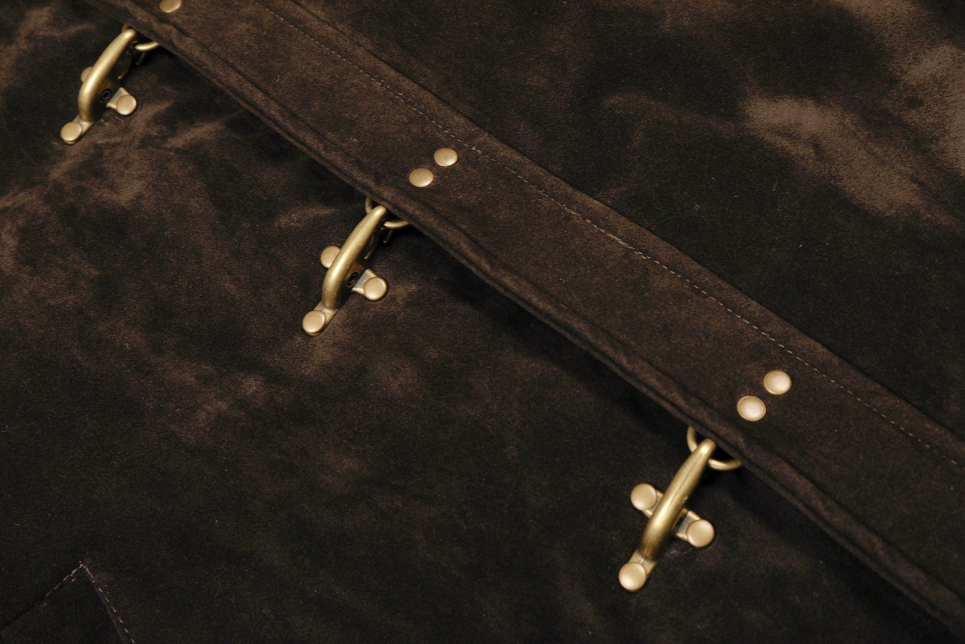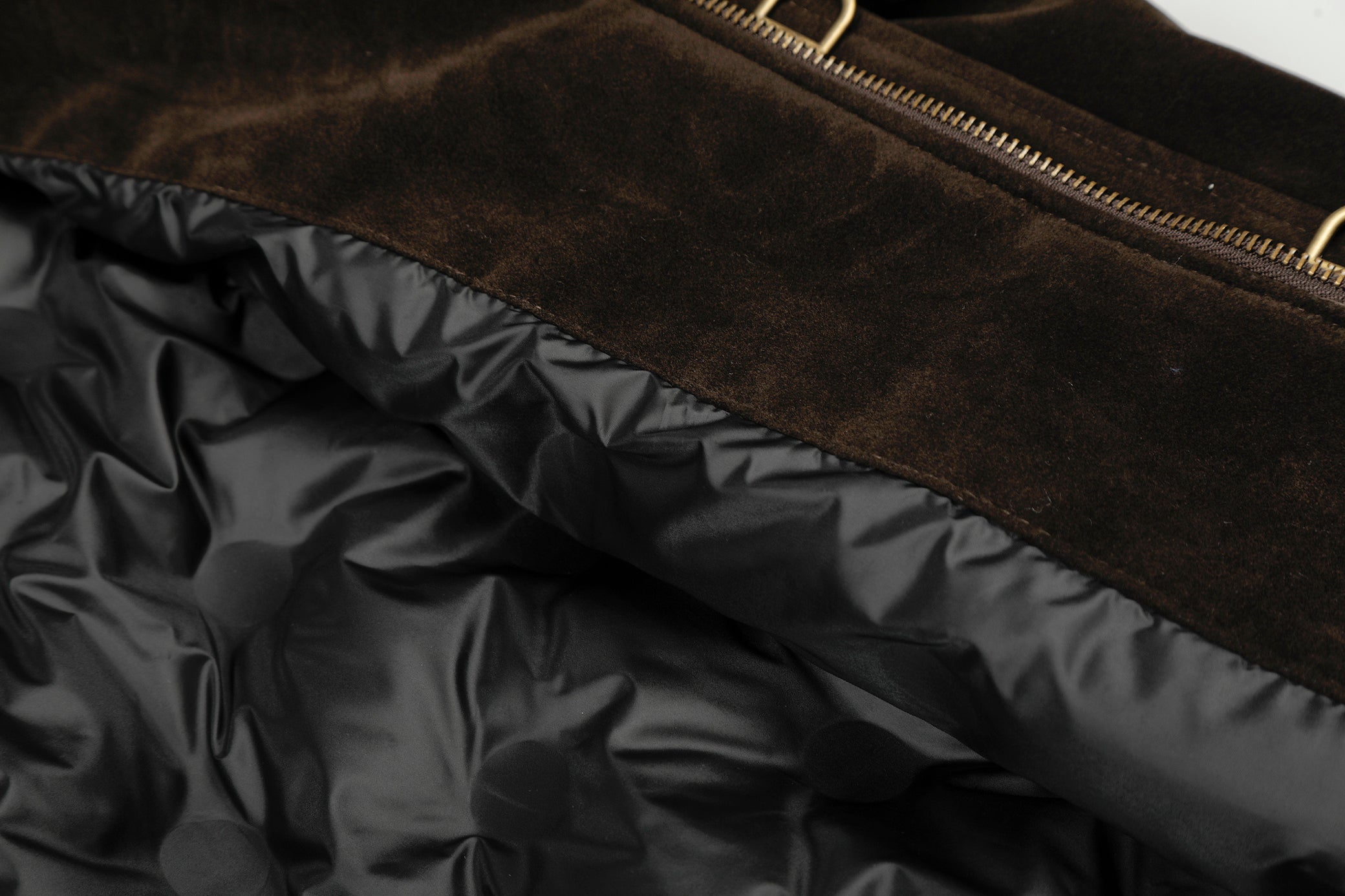 Clothing details: Suede-textured fabric, stand collar, metal clasp fasteners, detailed back embroidery, elastic hem and cuffs