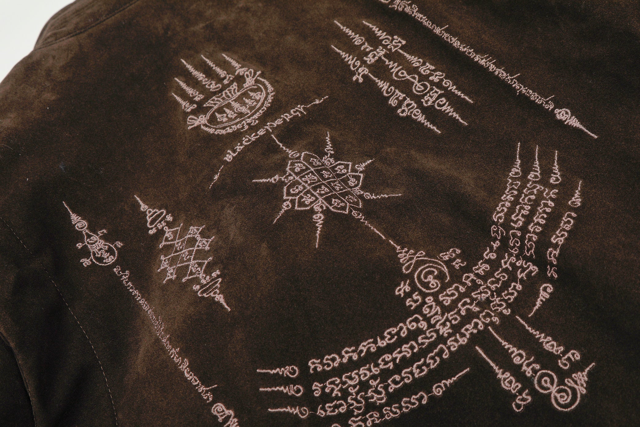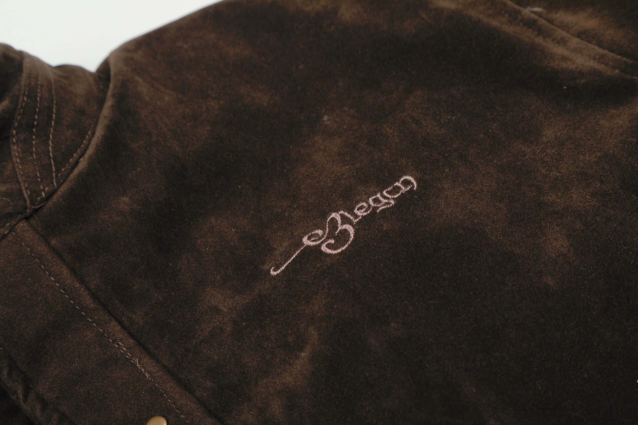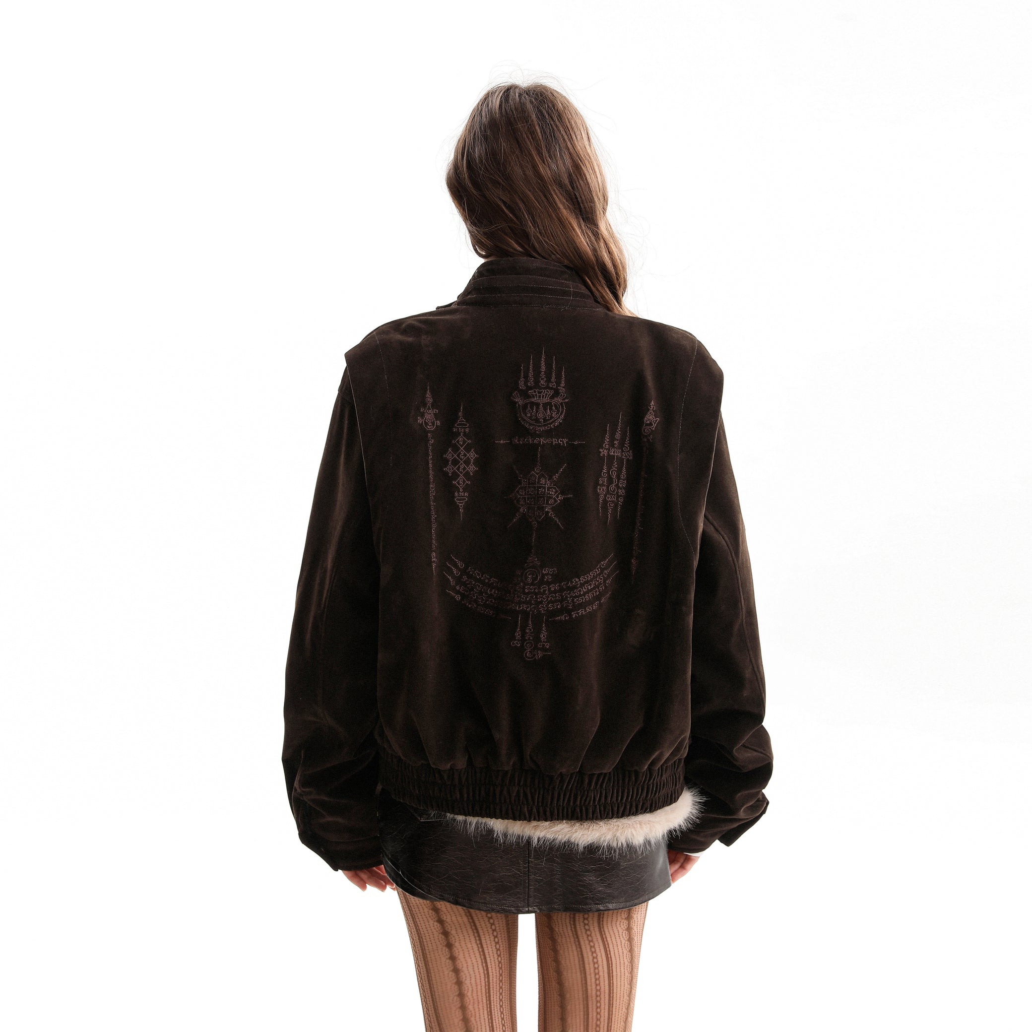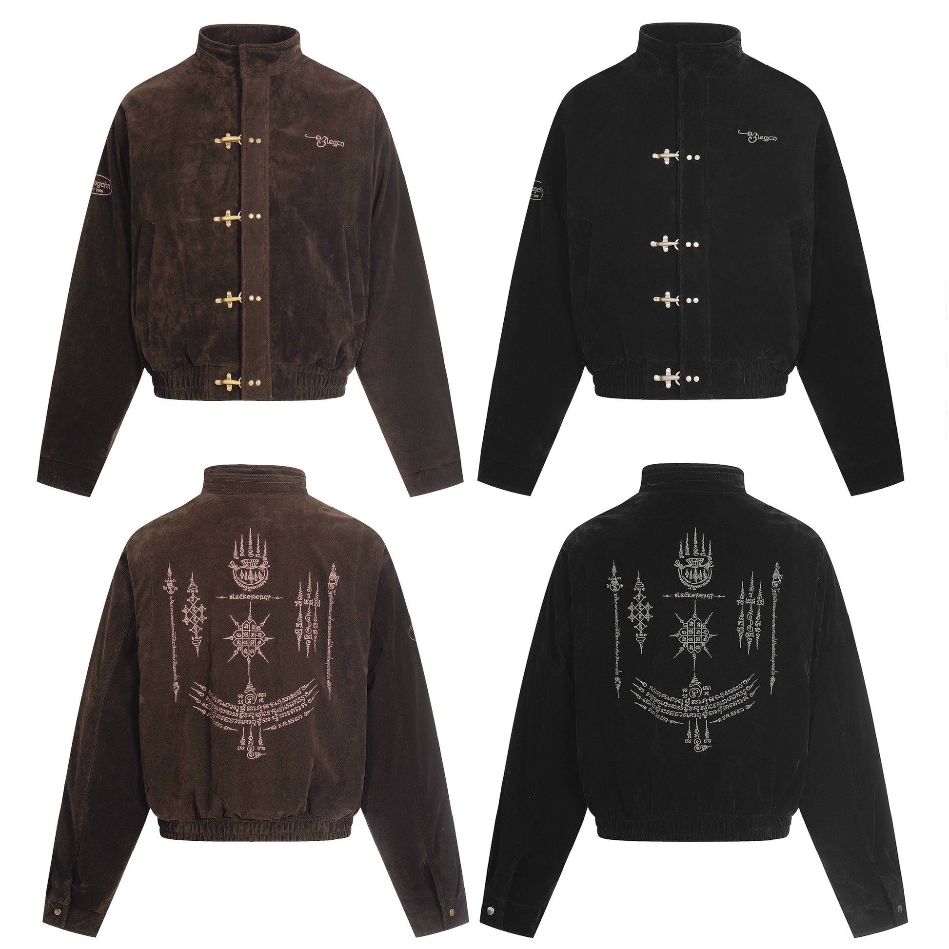 The Omirad Embroidered Suede Metal Clasp Jacket fuses vintage suede texture with bold gothic embroidery. Crafted from a soft stretch blend, it offers a structured yet comfortable fit. The jacket features metal clasp fasteners down the front, a high stand collar, and intricate embroidery artwork across the back — combining streetwear attitude with refined craftsmanship.