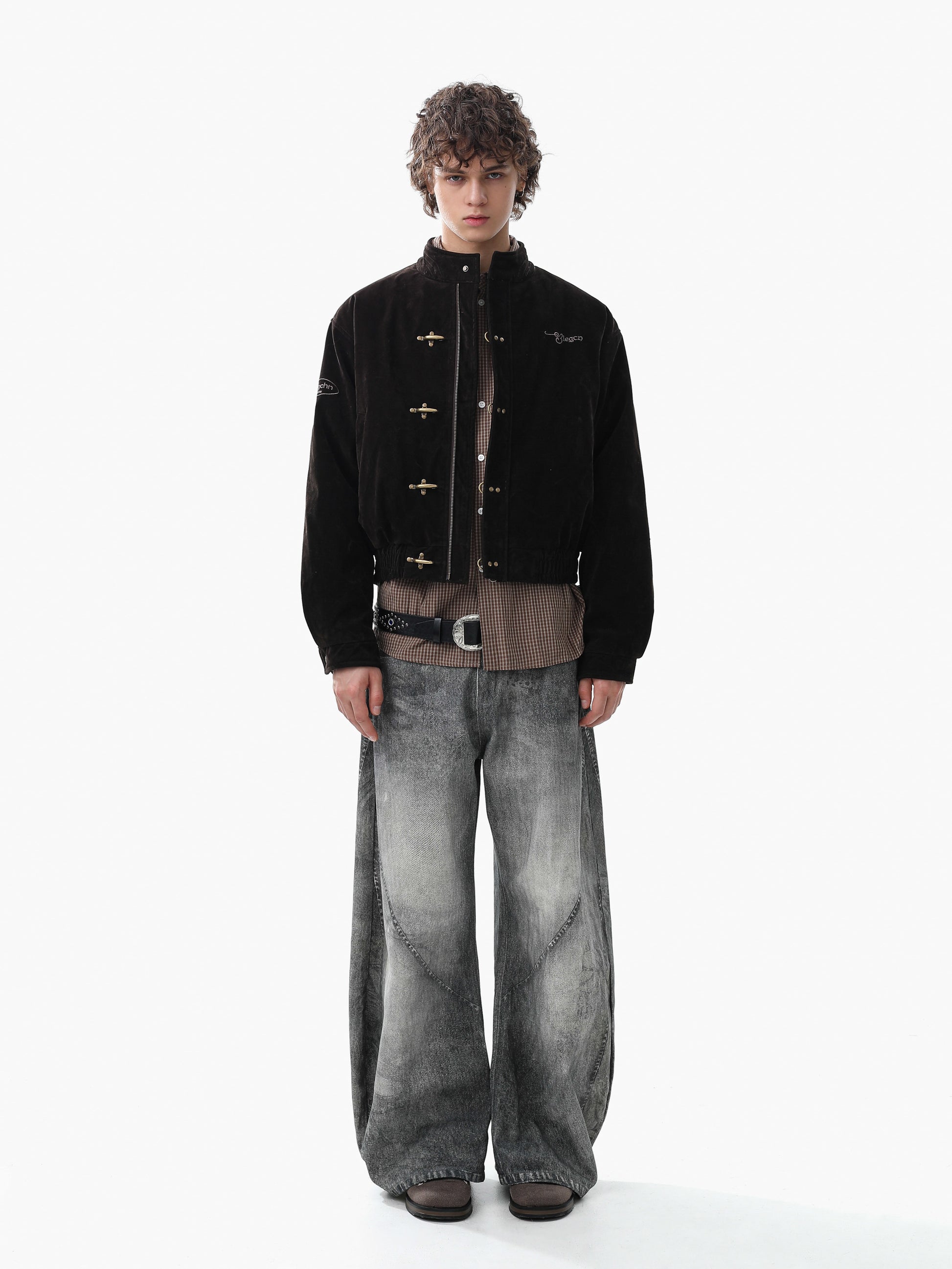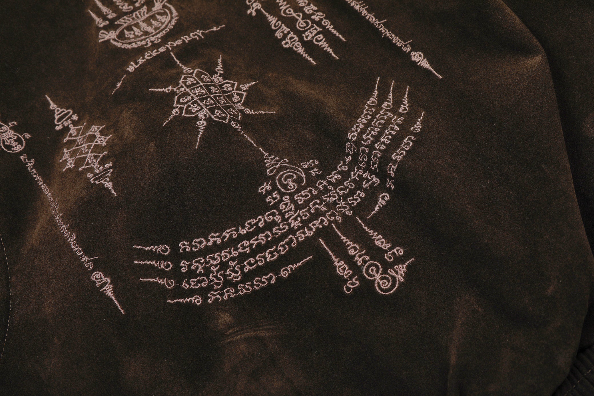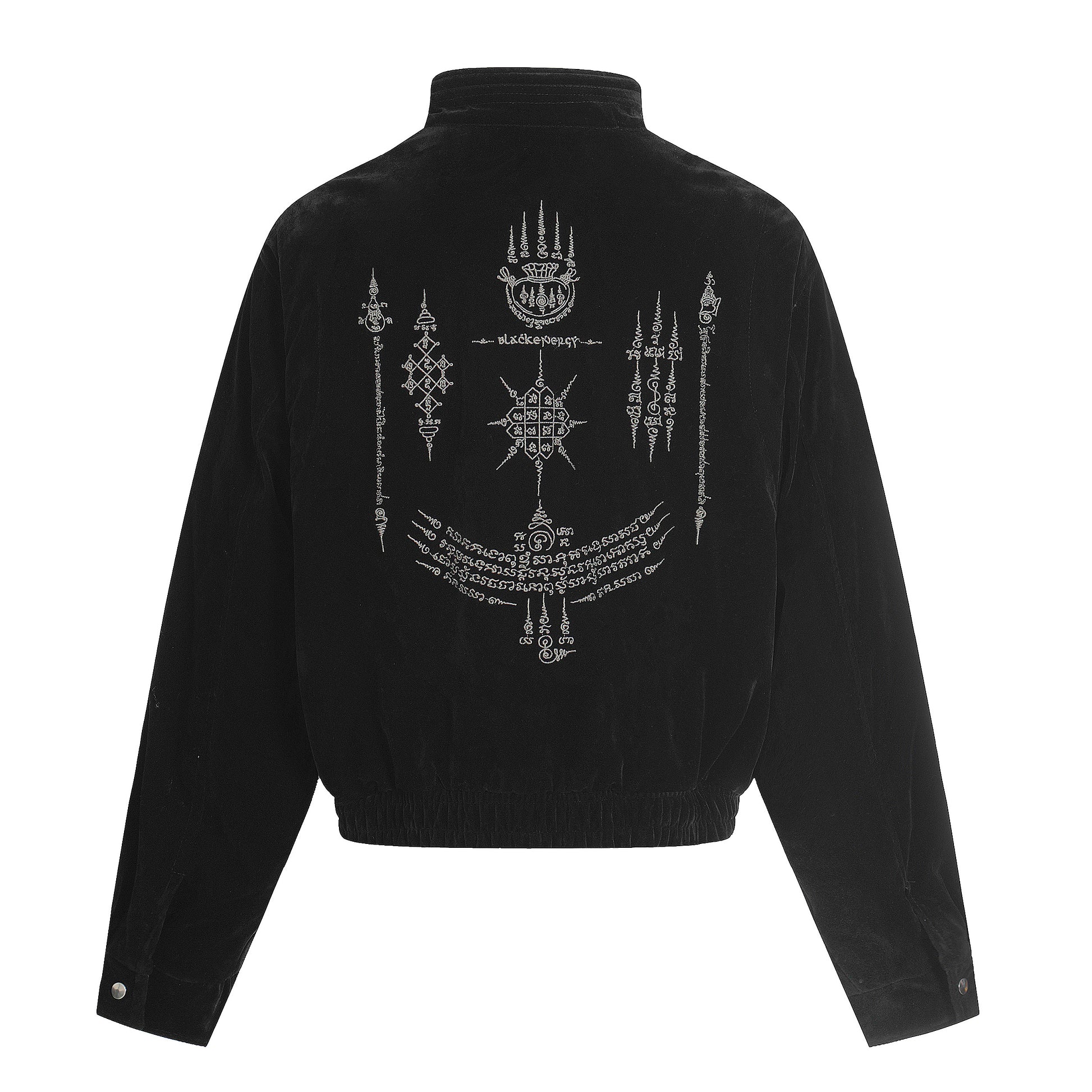 The Omirad Embroidered Suede Metal Clasp Jacket fuses vintage suede texture with bold gothic embroidery. Crafted from a soft stretch blend, it offers a structured yet comfortable fit. The jacket features metal clasp fasteners down the front, a high stand collar, and intricate embroidery artwork across the back — combining streetwear attitude with refined craftsmanship.