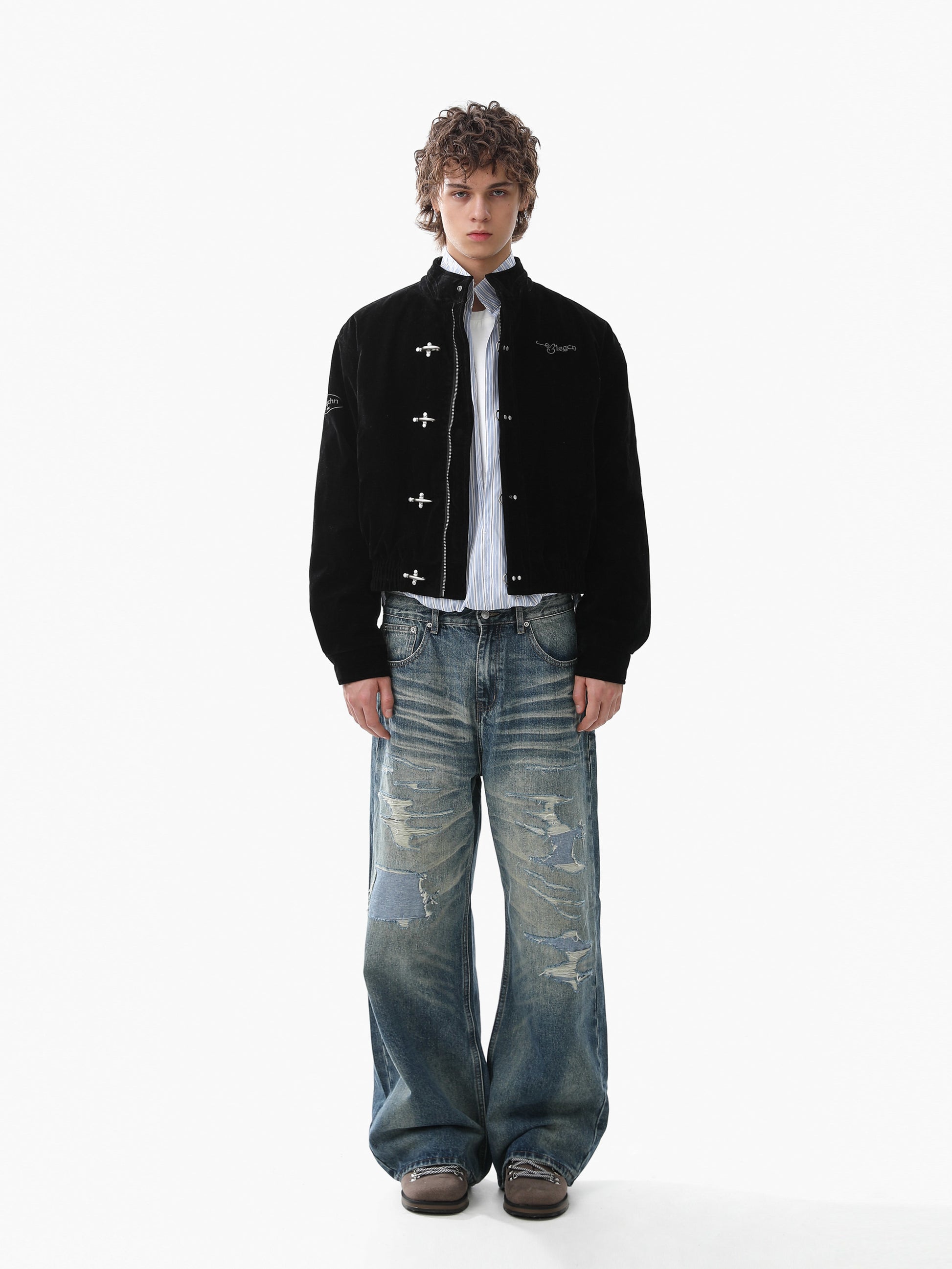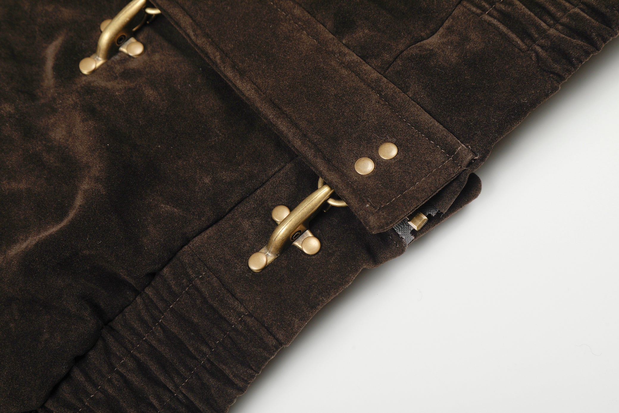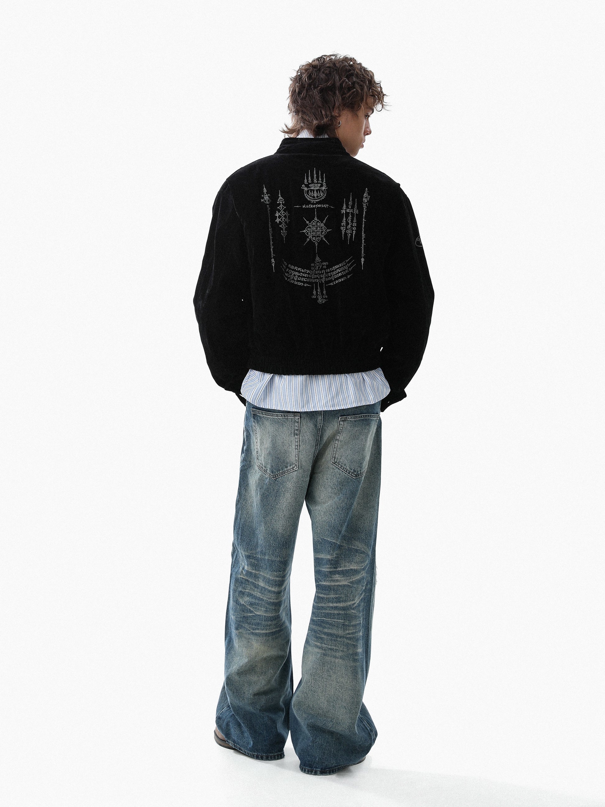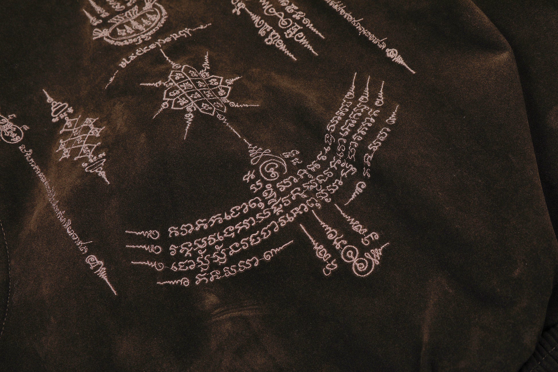 The Omirad Embroidered Suede Metal Clasp Jacket fuses vintage suede texture with bold gothic embroidery. Crafted from a soft stretch blend, it offers a structured yet comfortable fit. The jacket features metal clasp fasteners down the front, a high stand collar, and intricate embroidery artwork across the back — combining streetwear attitude with refined craftsmanship.