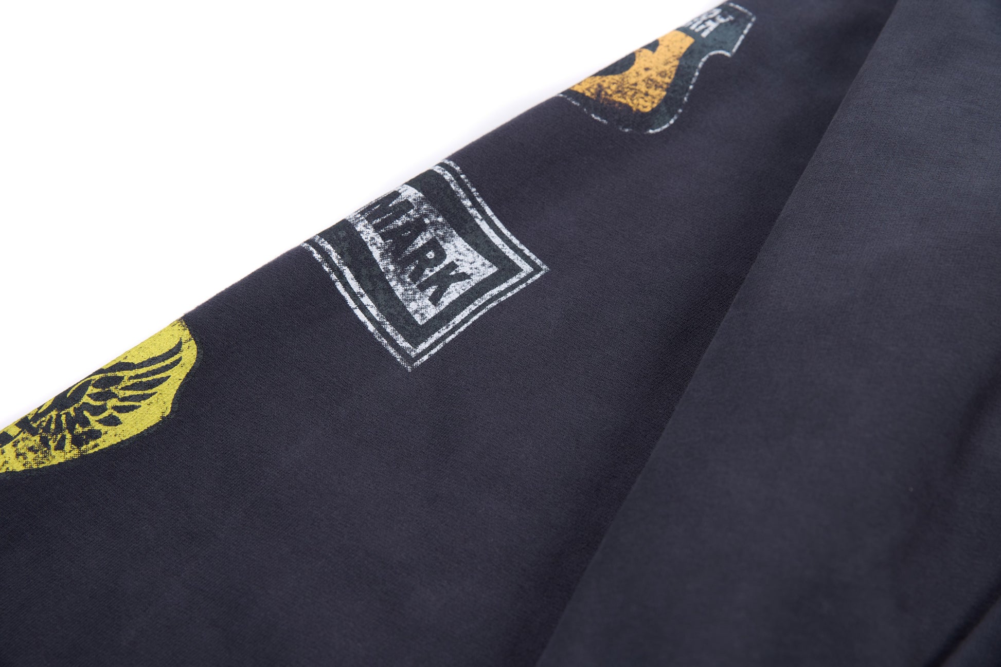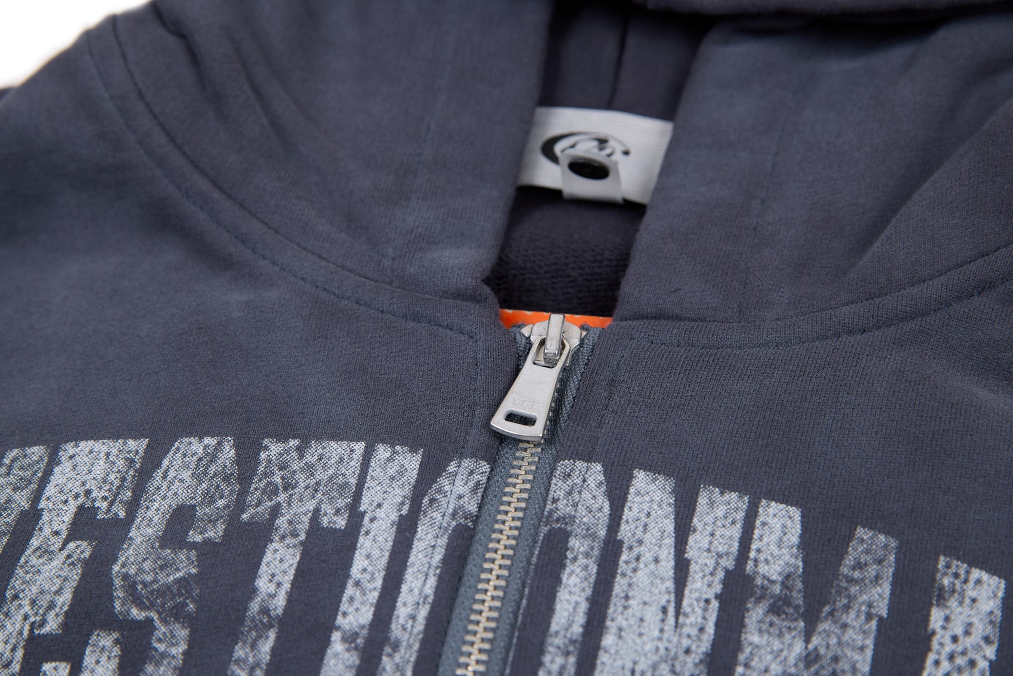 Clothing Details: Washed vintage finish, multi-print patch graphics, full zip closure, kangaroo pocket, ribbed cuffs and hem