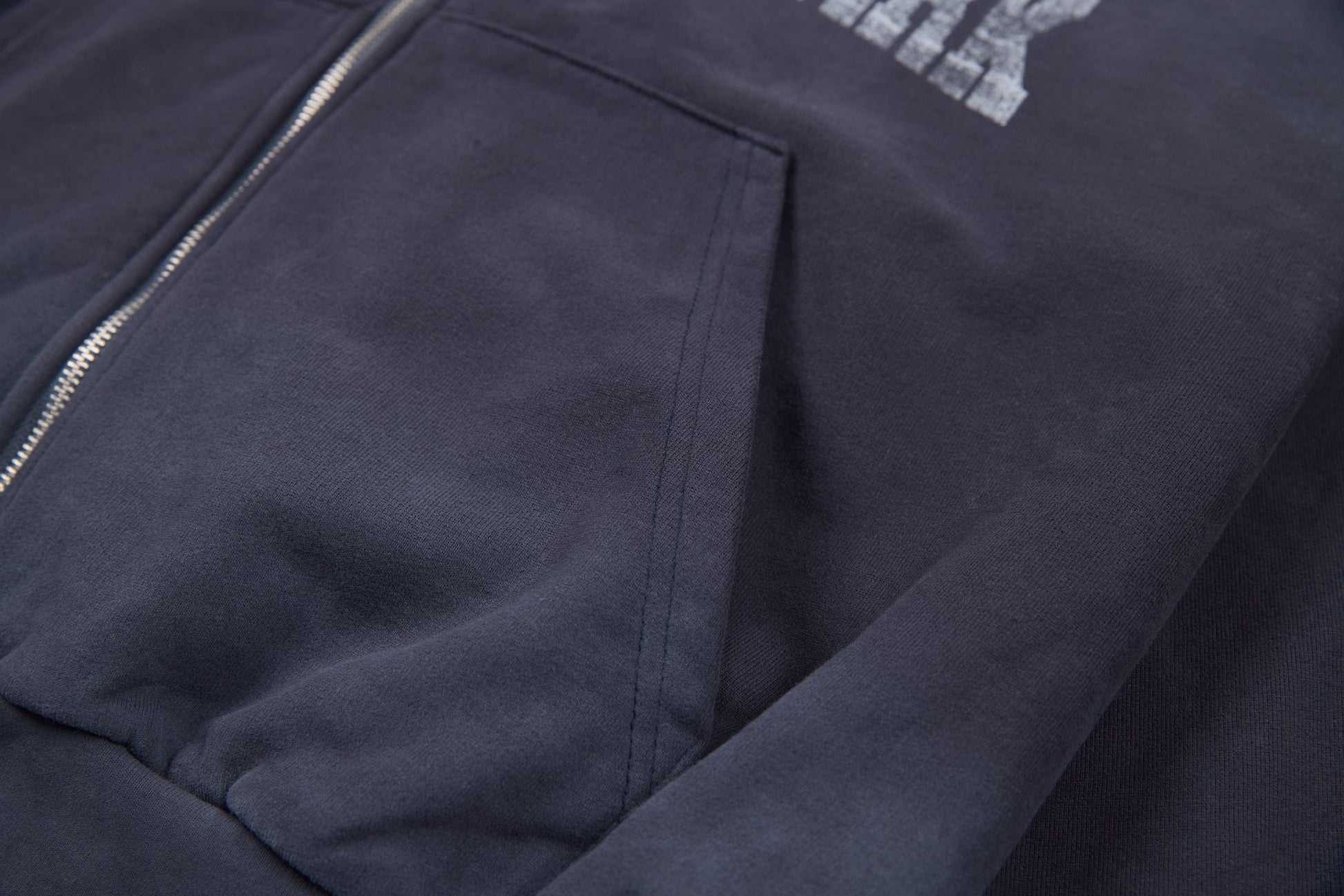 The chest and sleeves are decorated with distressed-style prints and patch-inspired graphics, giving the piece a retro, collectible feel. A full-length metal zipper, ribbed cuffs, and a spacious kangaroo pocket complete the design, making it an easy go-to for daily layering.