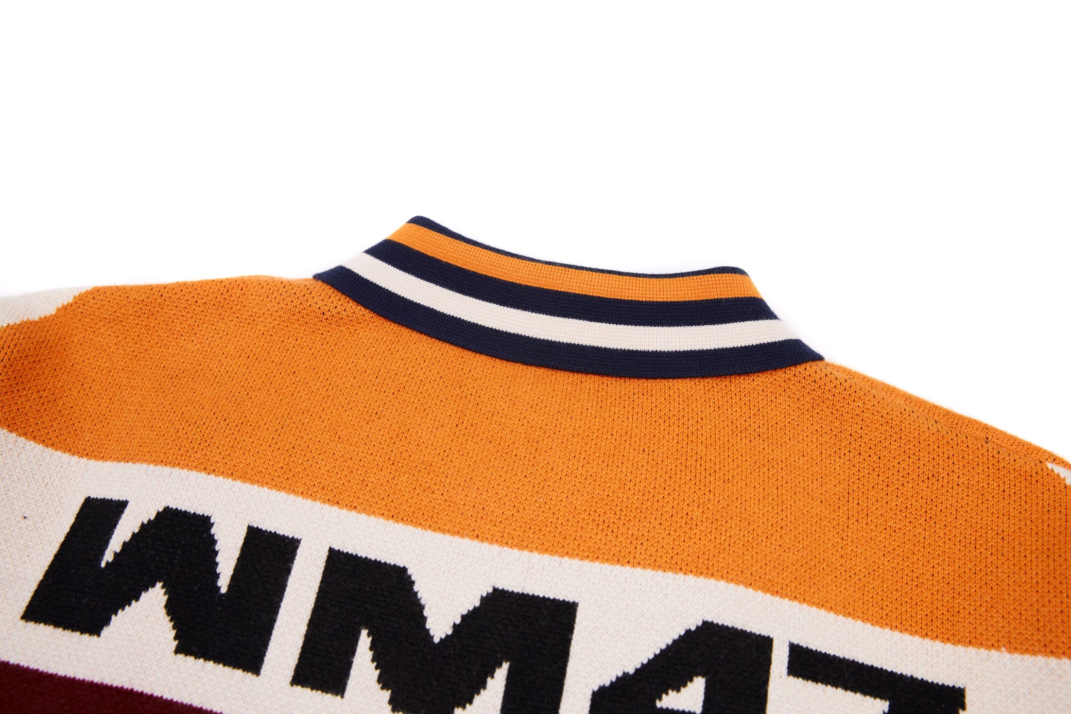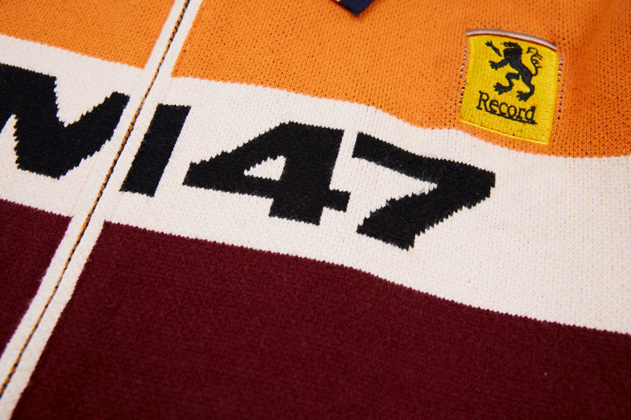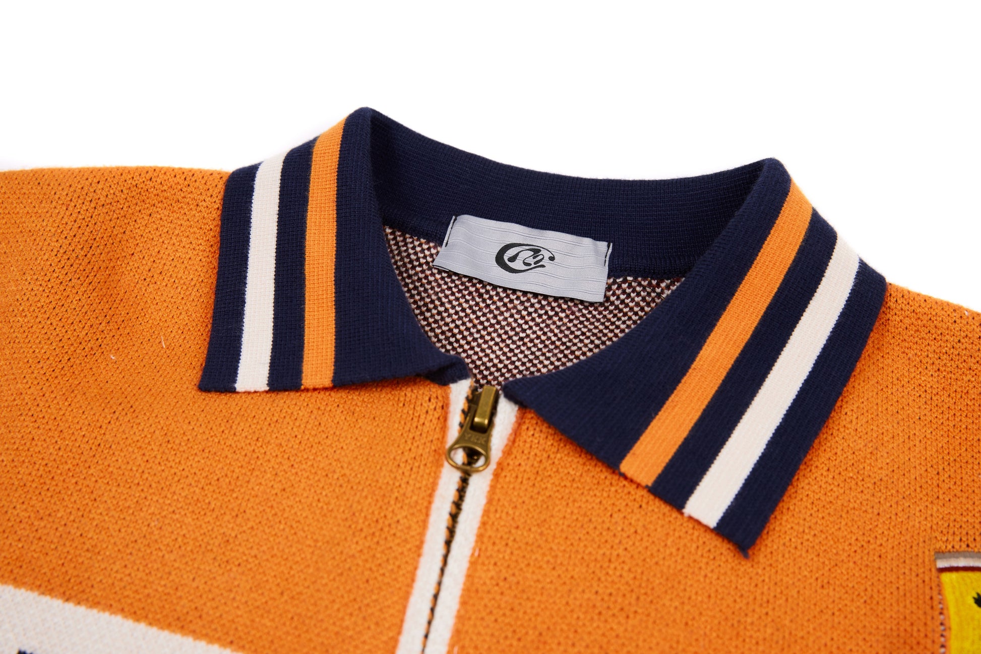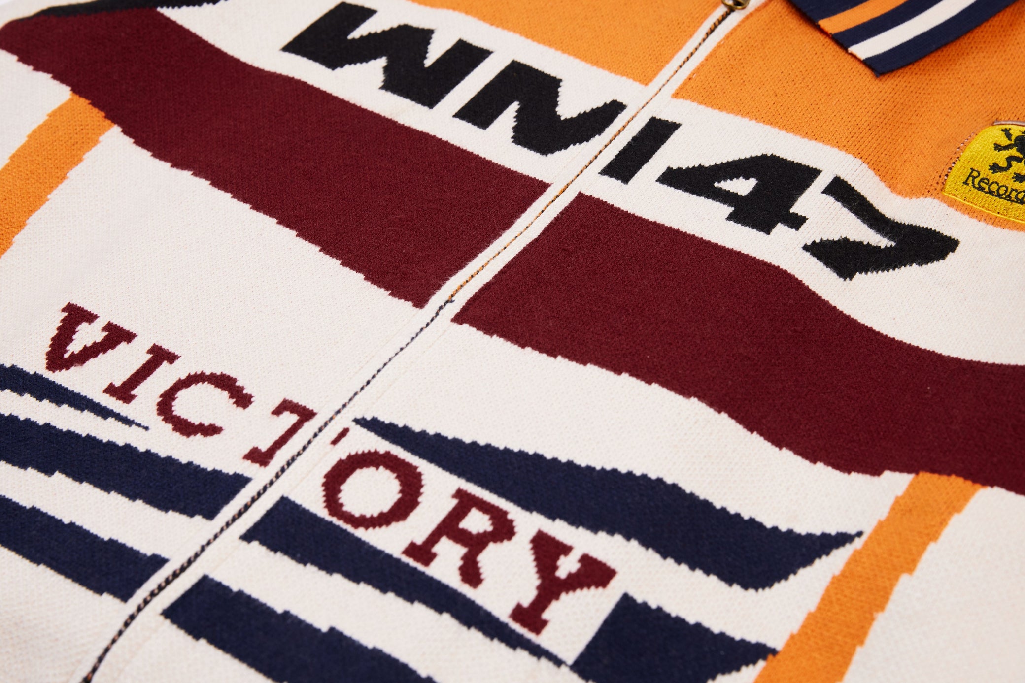 Clothing details: Knitted racing graphics, varsity collar, full zip closure, woven chest patch