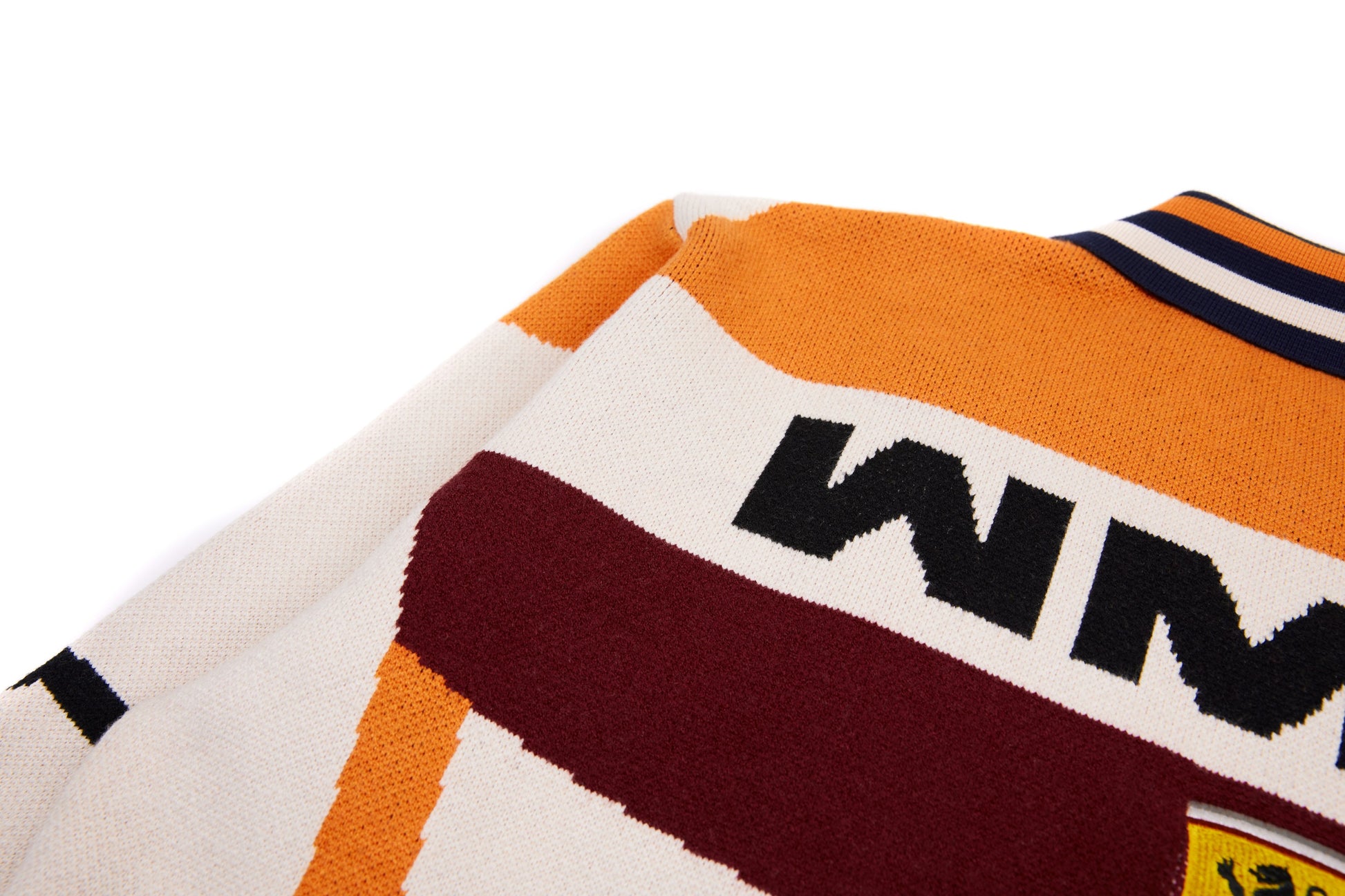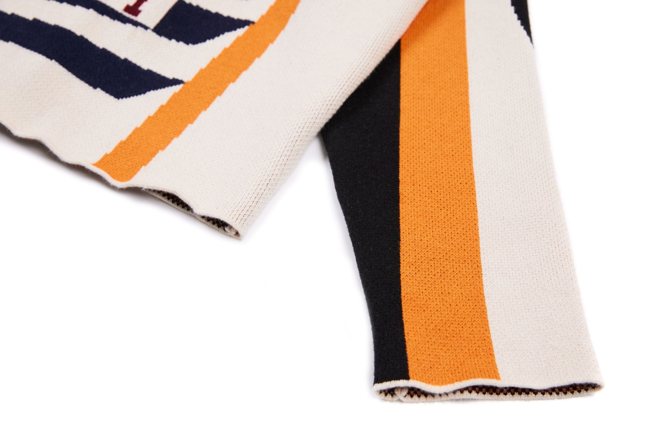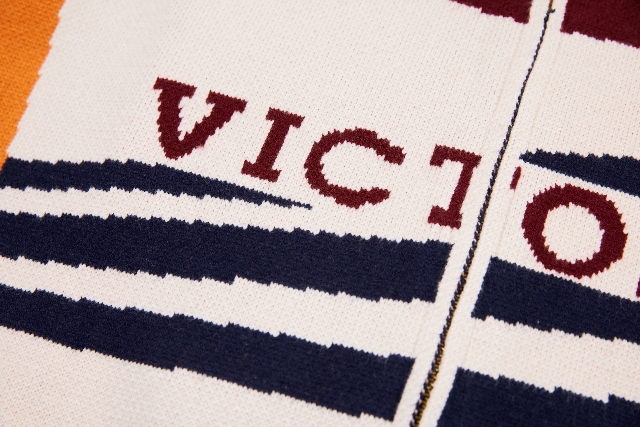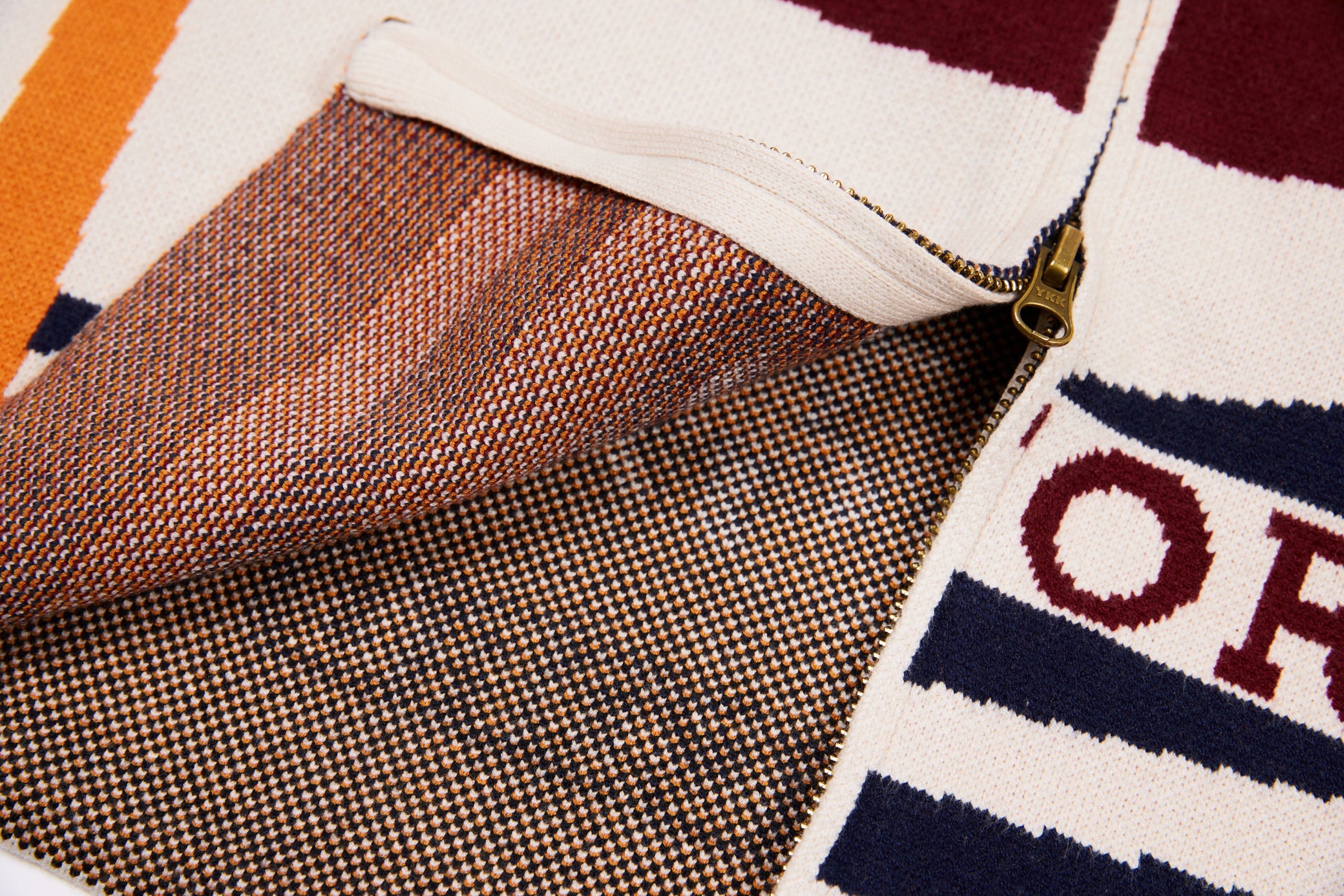 Clothing details: Knitted racing graphics, varsity collar, full zip closure, woven chest patch