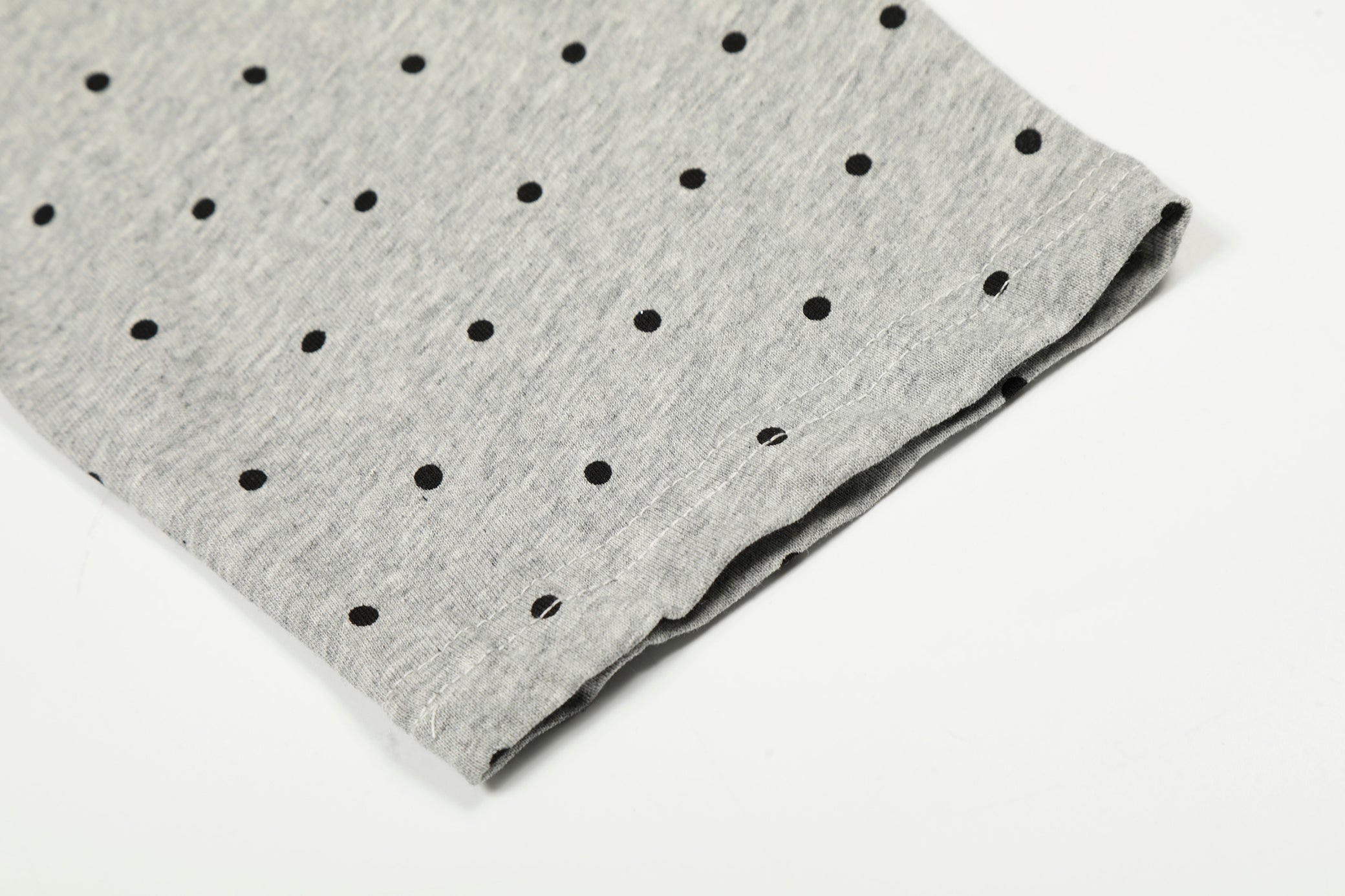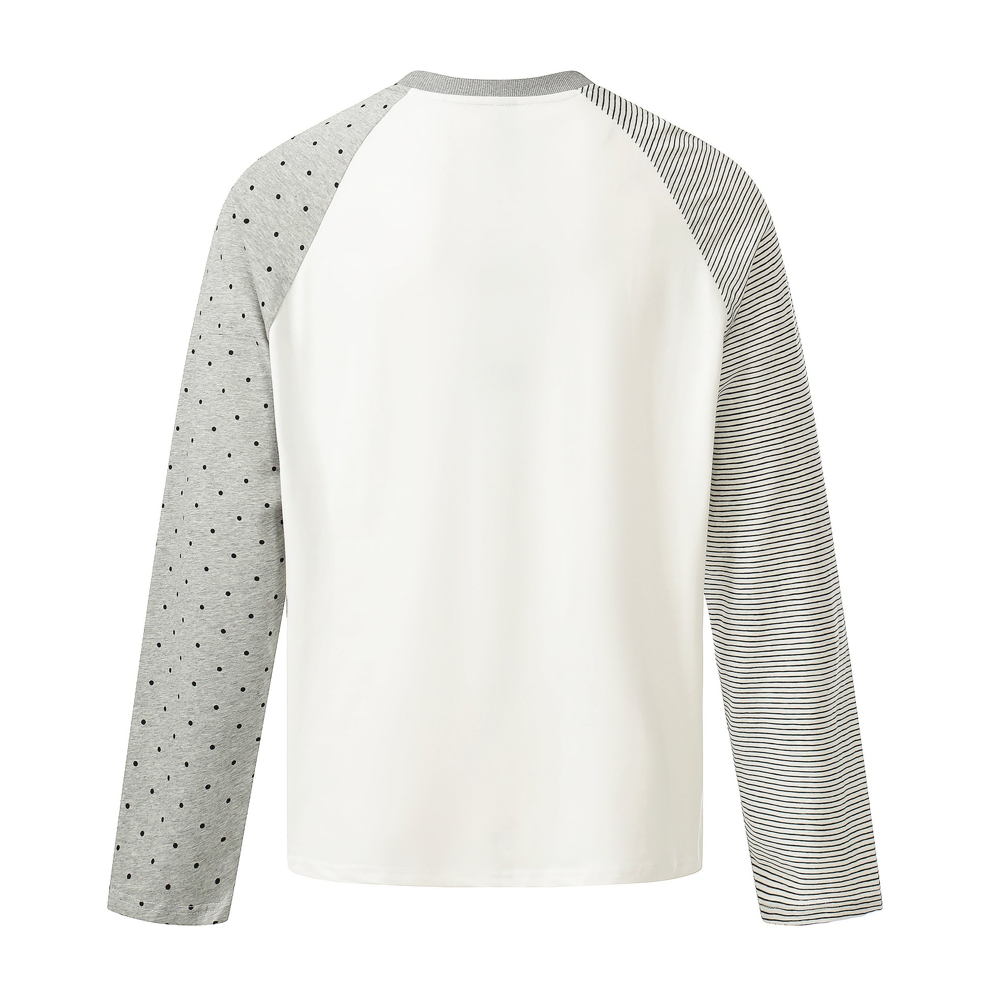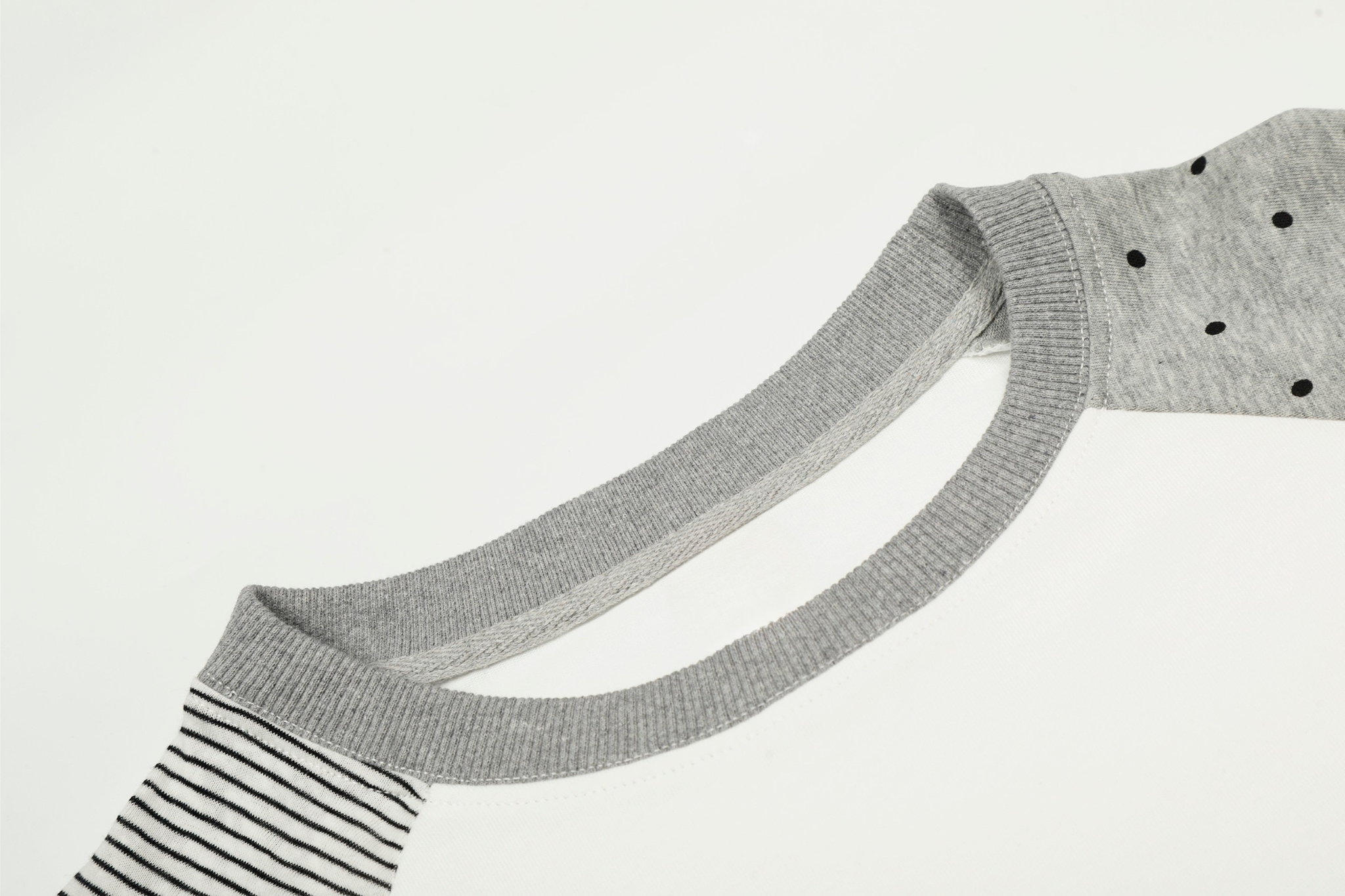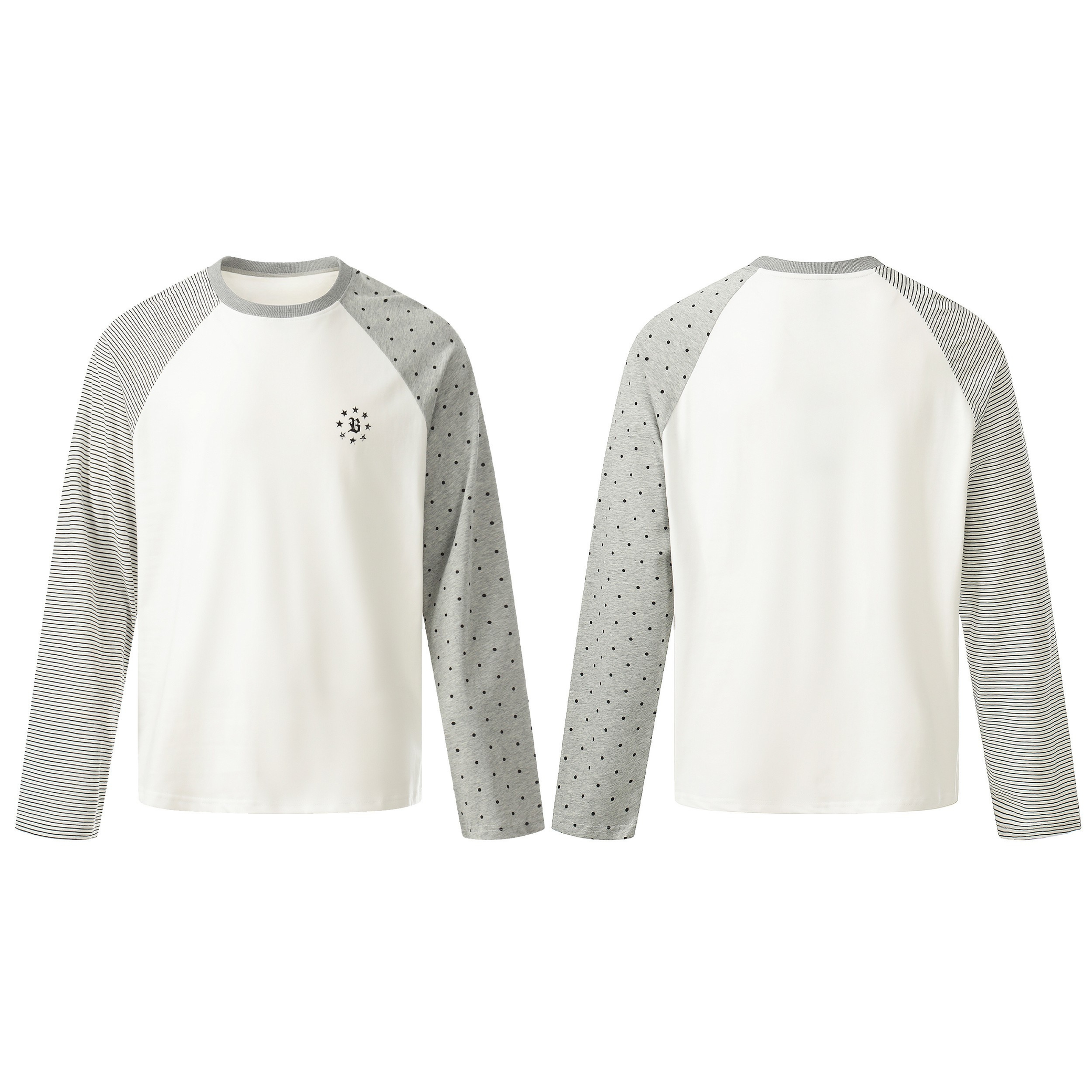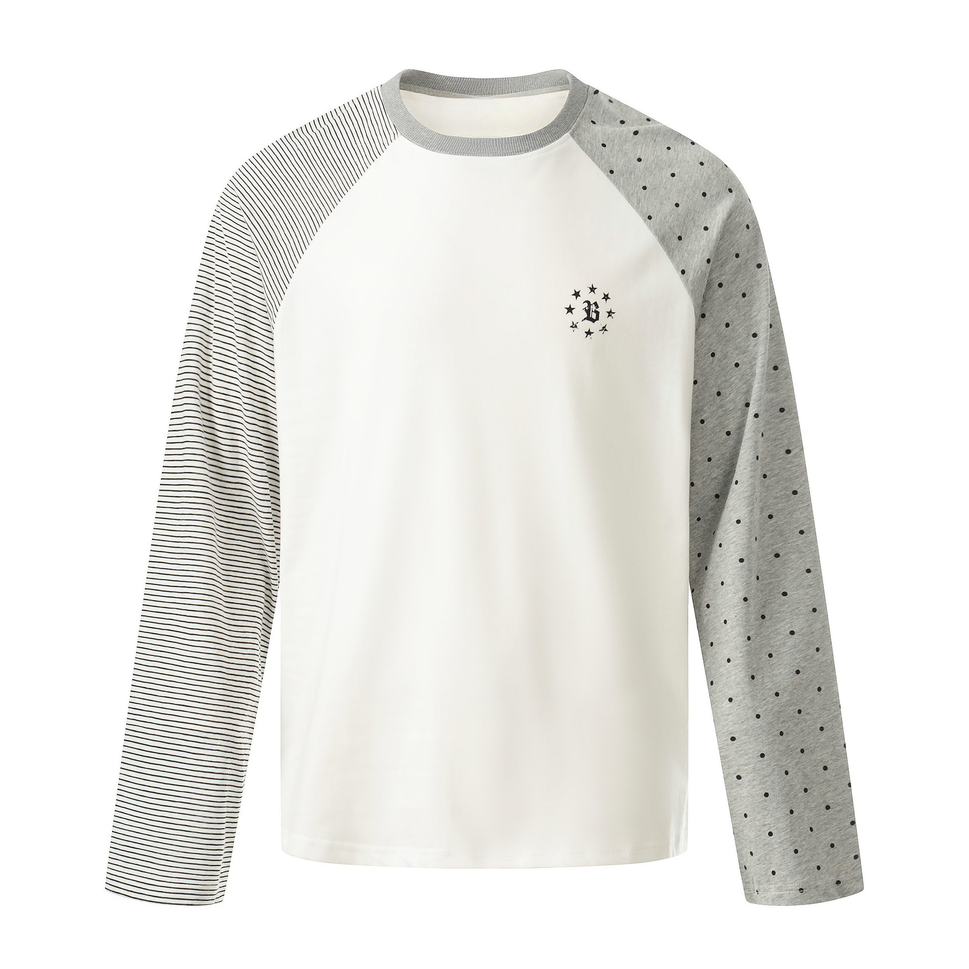 Clothing details: Raglan sleeve construction, contrast striped and dotted sleeves, minimalist chest emblem, long-sleeve silhouette.