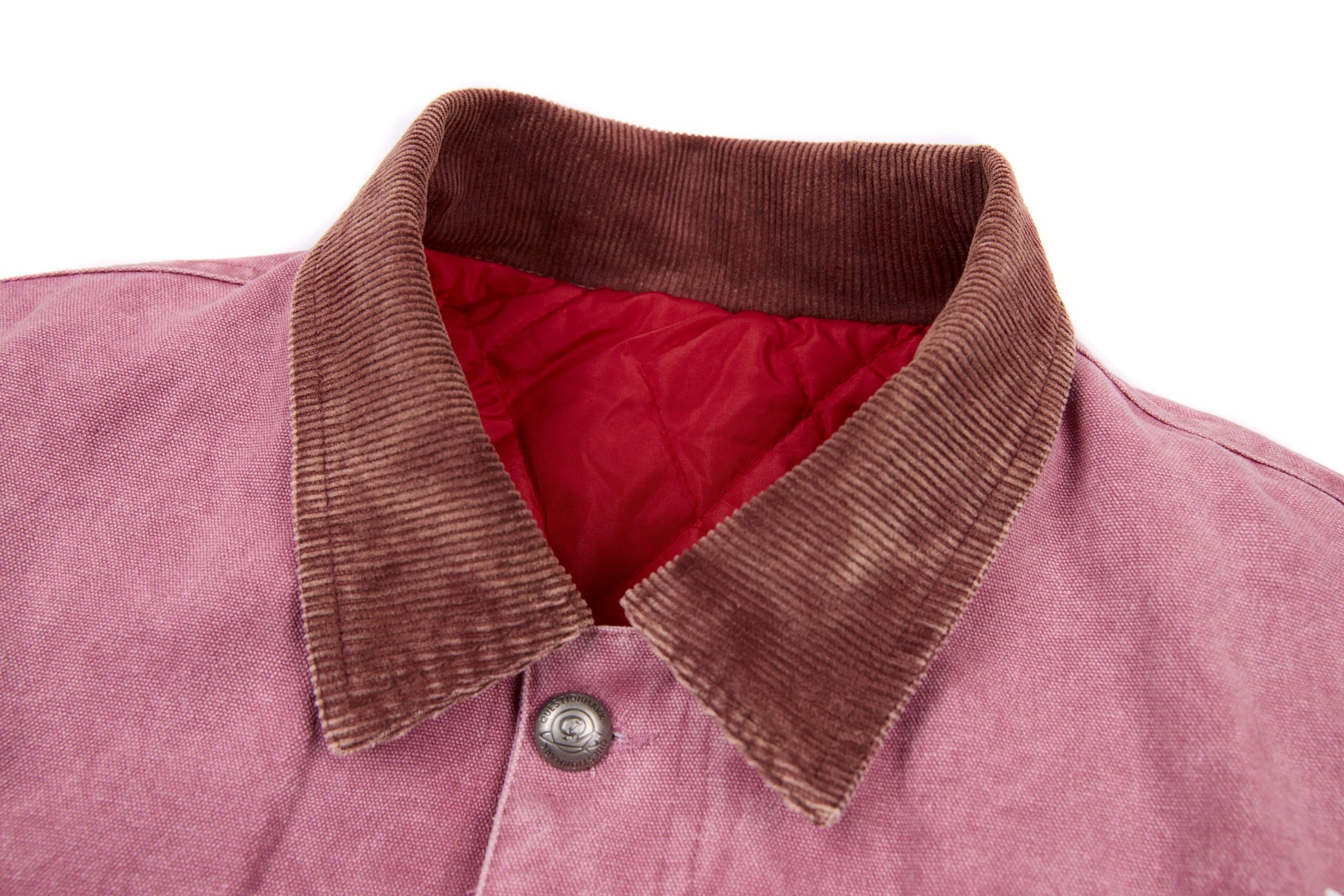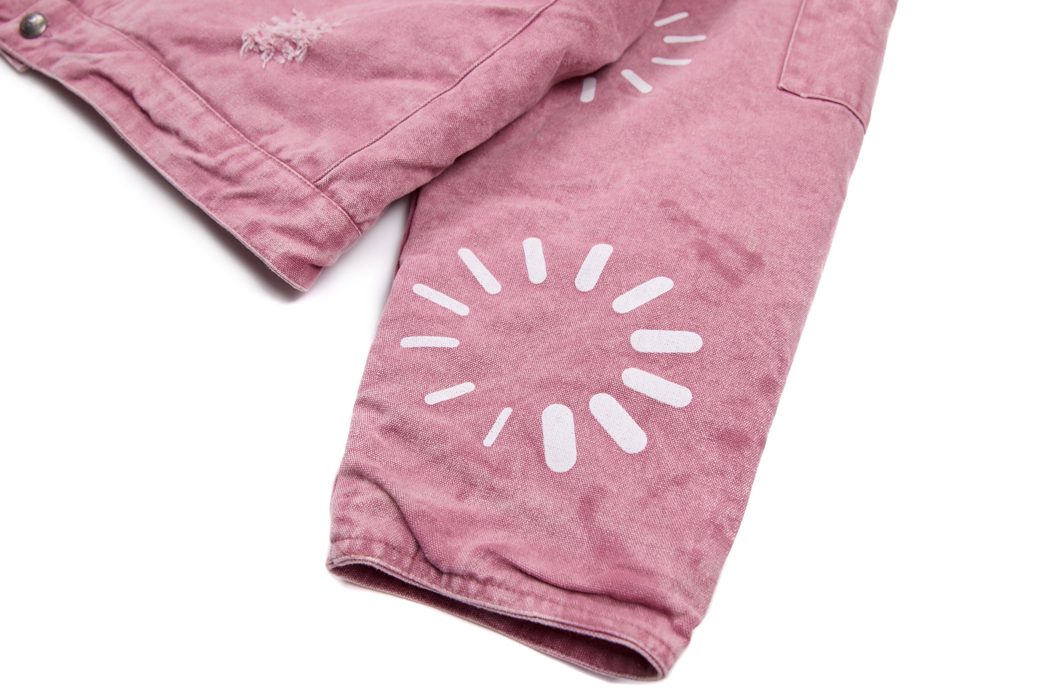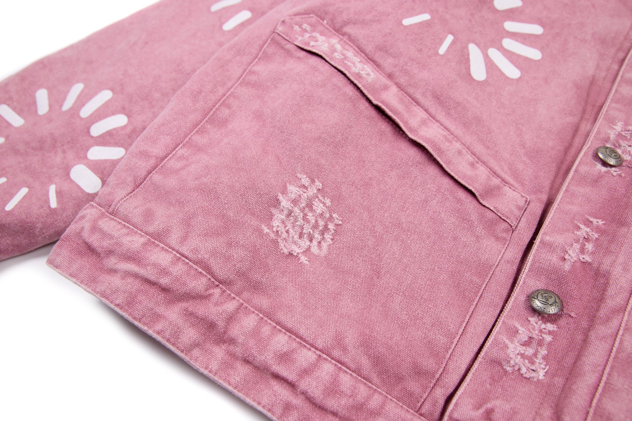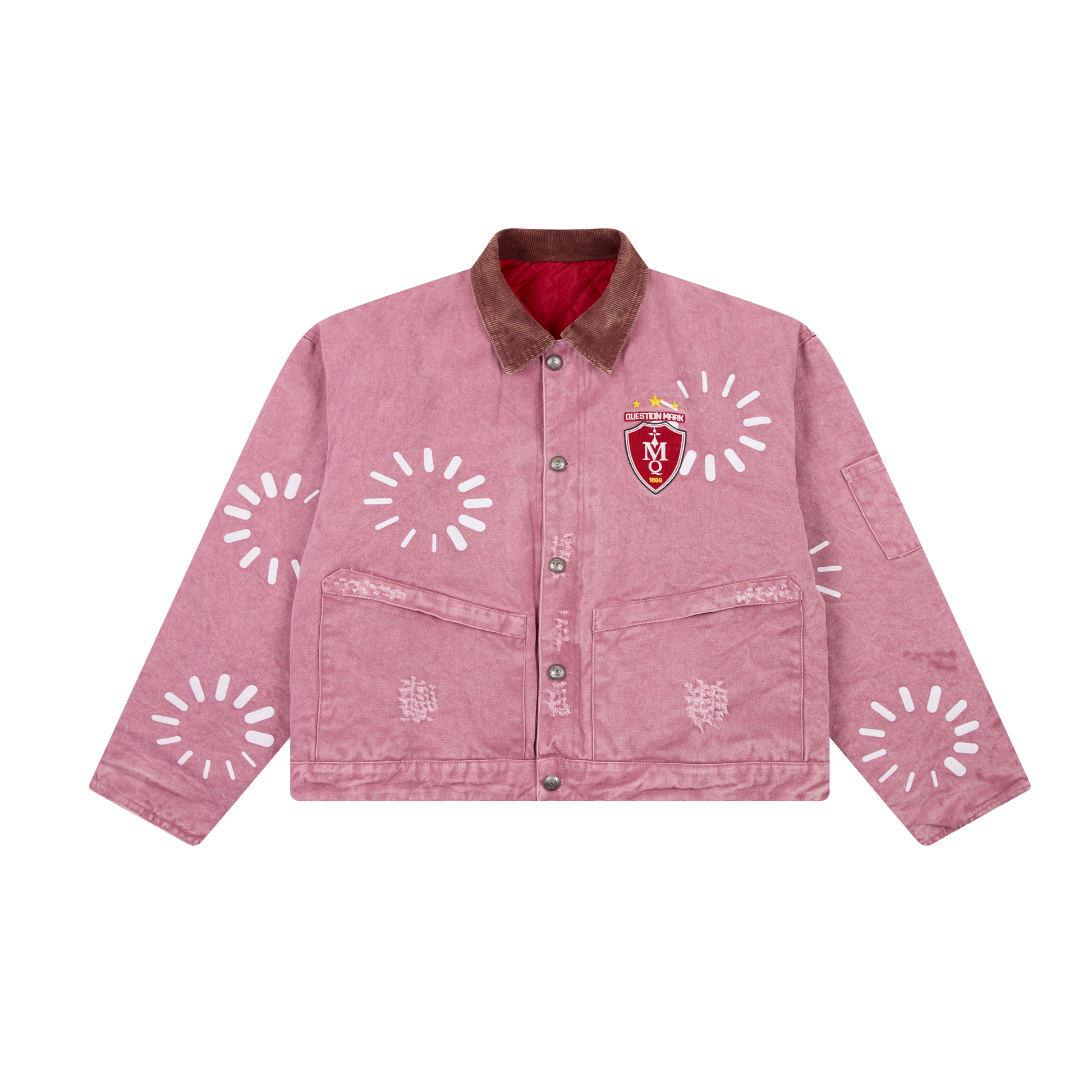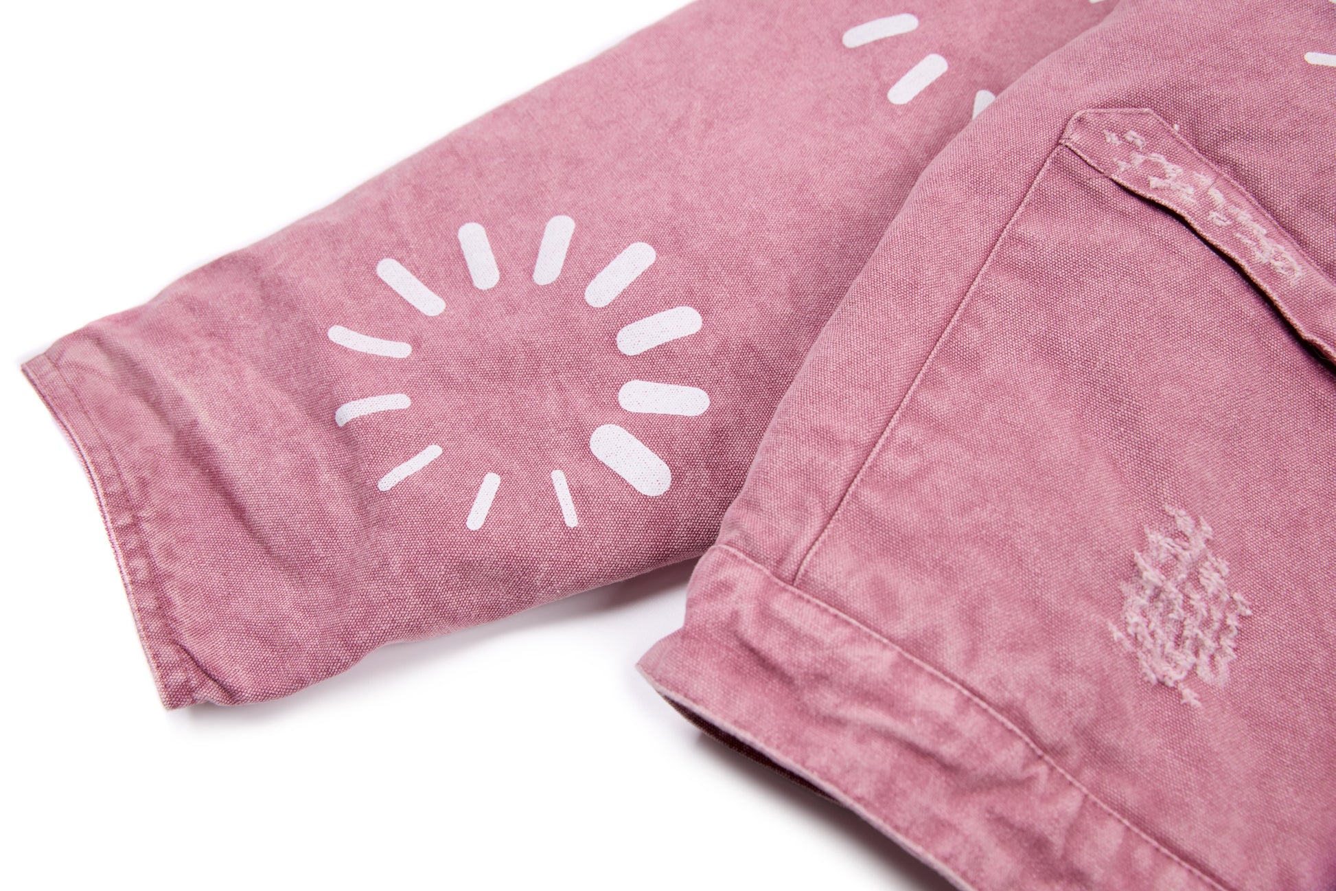 This workwear-inspired jacket brings a bold retro vibe with its unique washed-purple tone and contrast denim collar. The front badge embroidery adds a varsity-meets-street attitude, while the scattered graphic prints give it that hand-crafted, playful edge. Oversized pockets and metal snap buttons keep the silhouette practical, structured, and effortlessly cool.