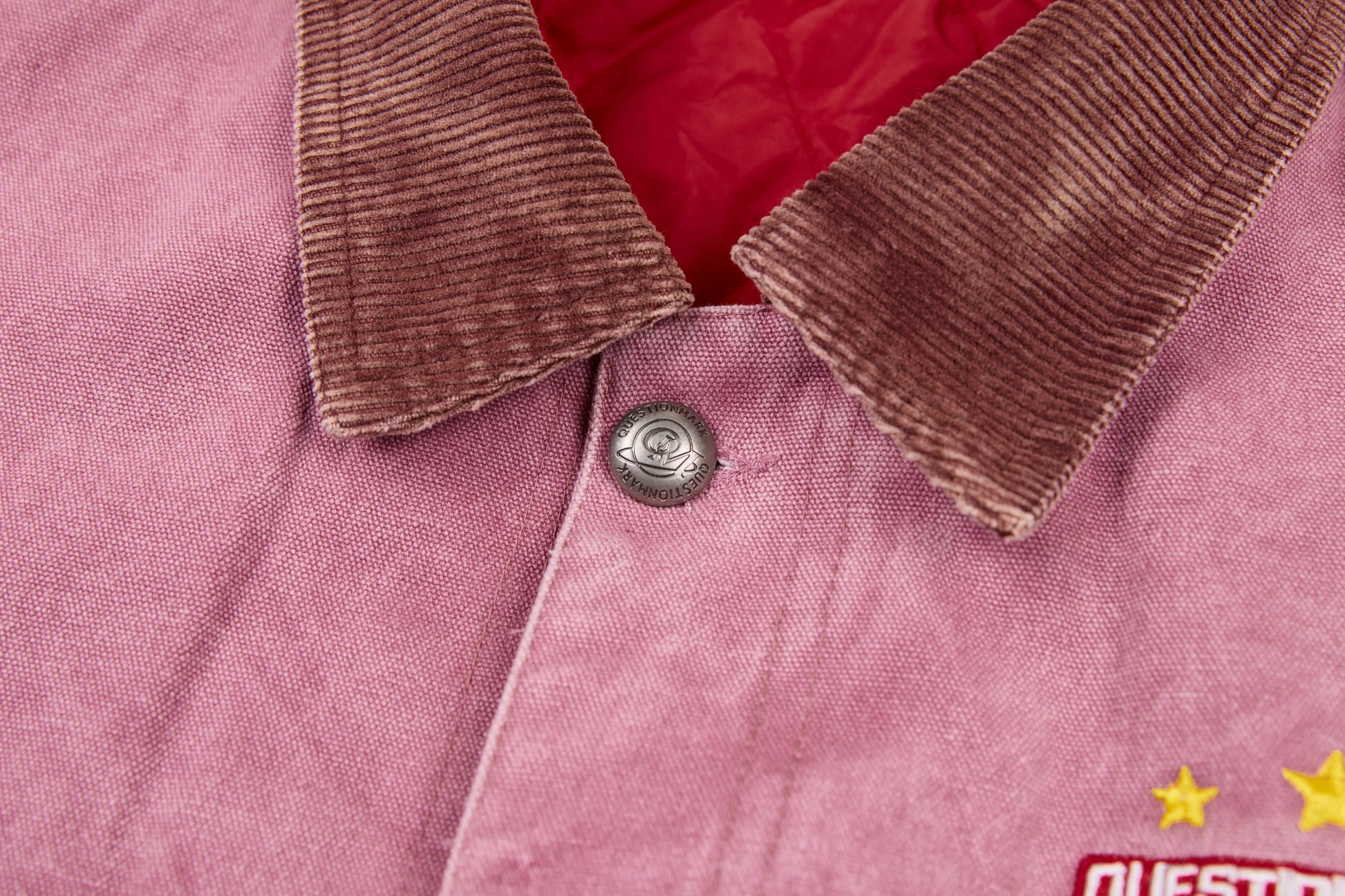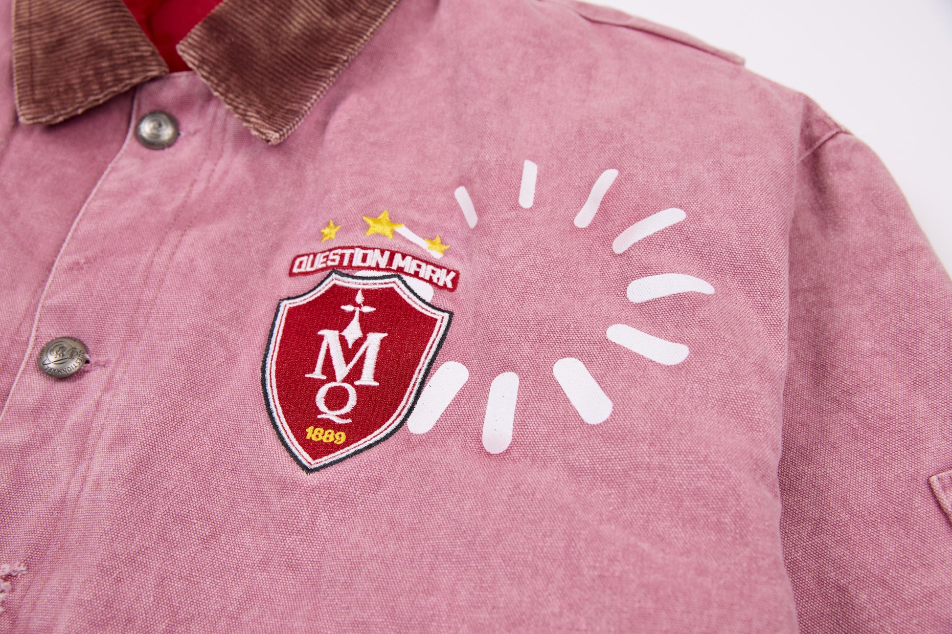Details: Washed finish, contrast denim collar, varsity badge embroidery, oversized pockets, snap-button closure