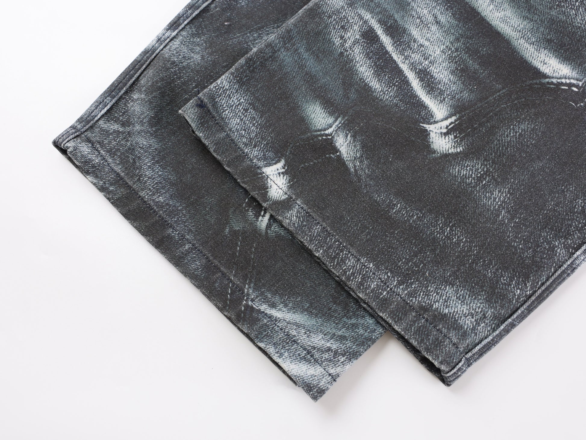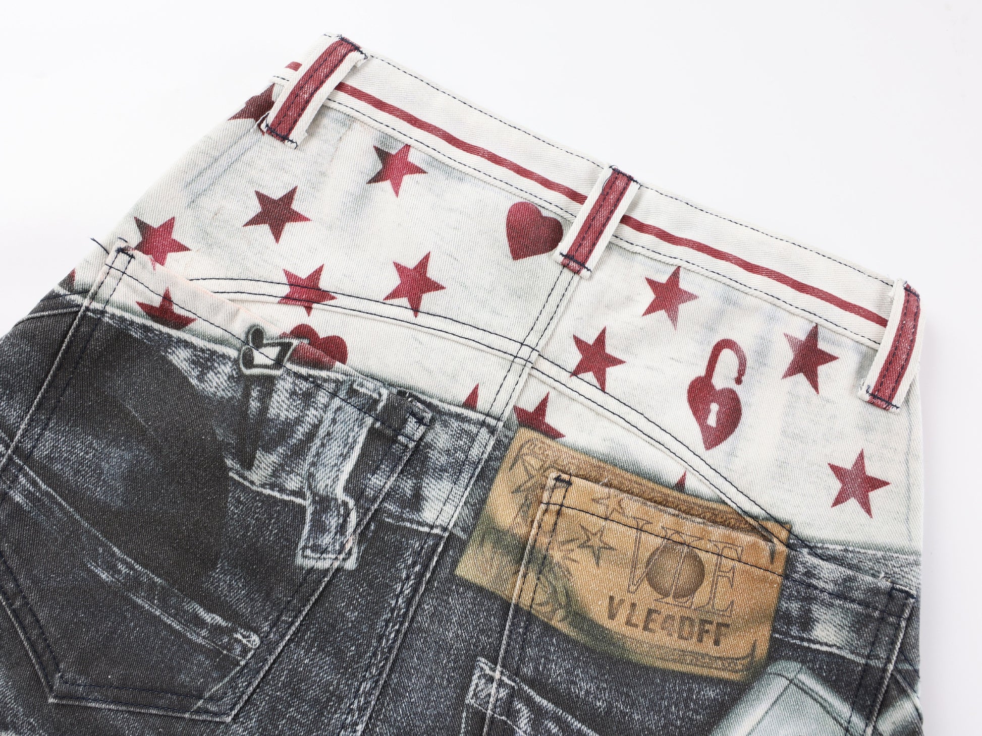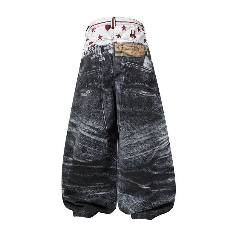 Clothing details: 3D denim-effect print, barrel-leg silhouette, graphic embellishments, high-rise waist, relaxed fit.