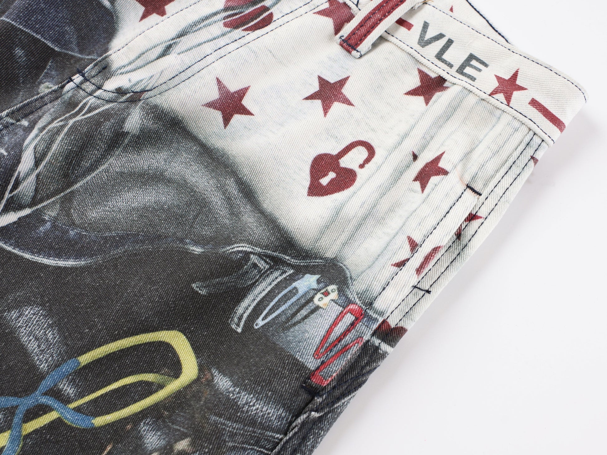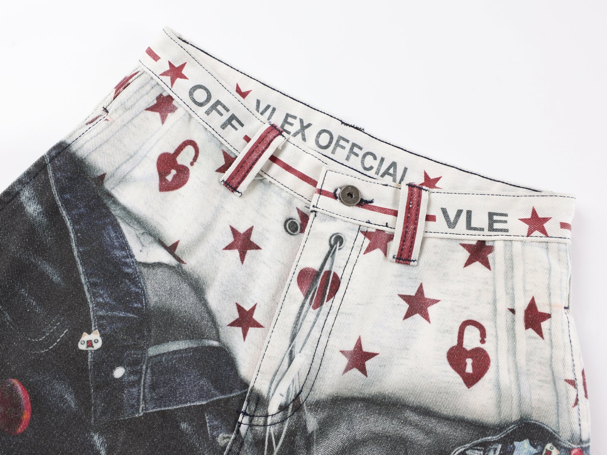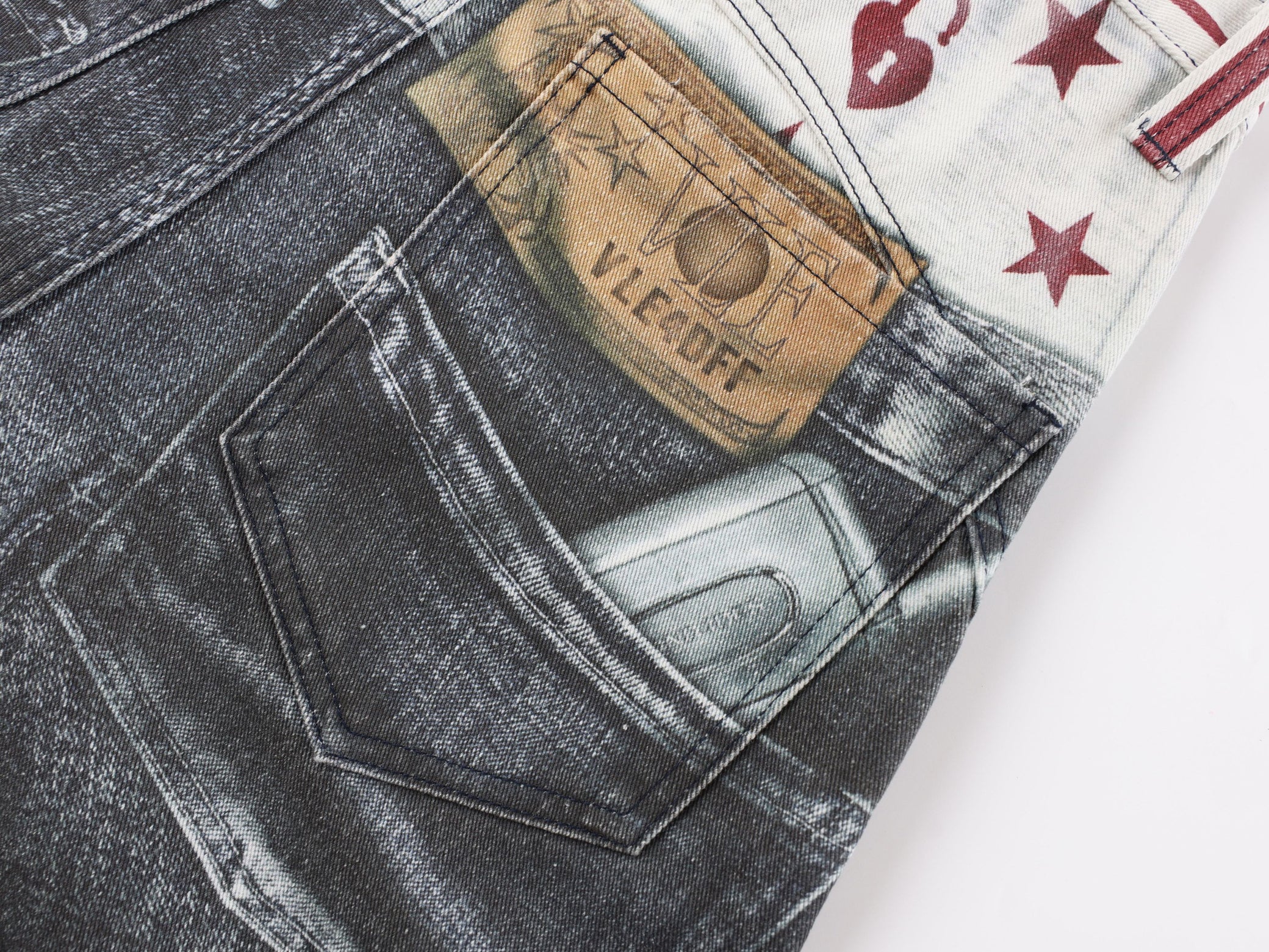 Clothing details: 3D denim-effect print, barrel-leg silhouette, graphic embellishments, high-rise waist, relaxed fit.