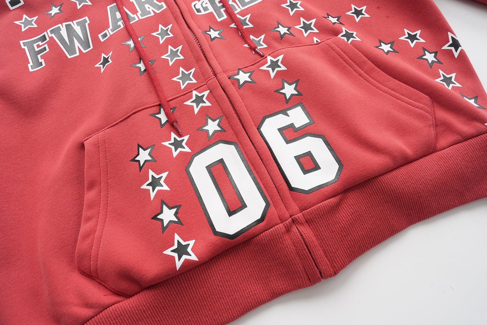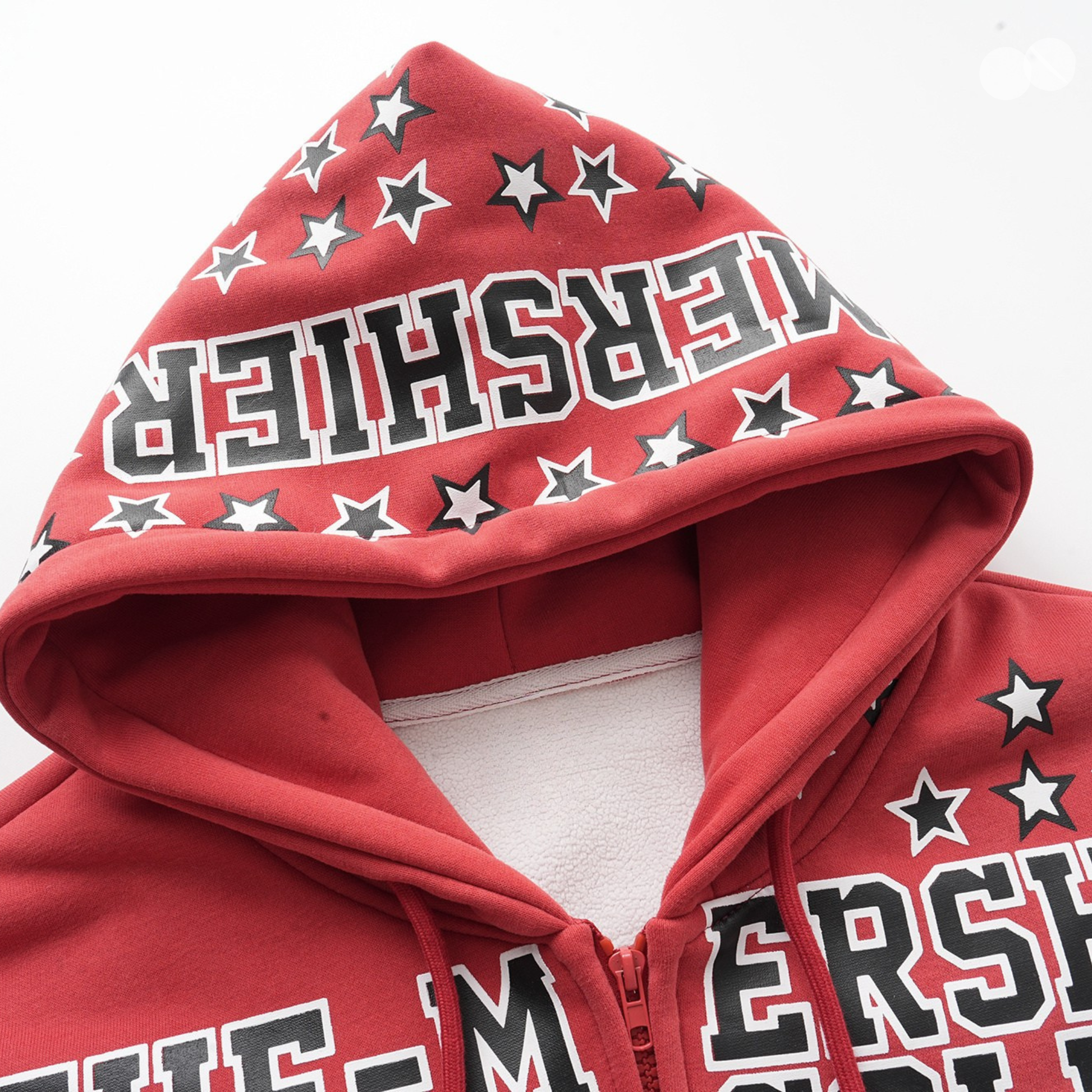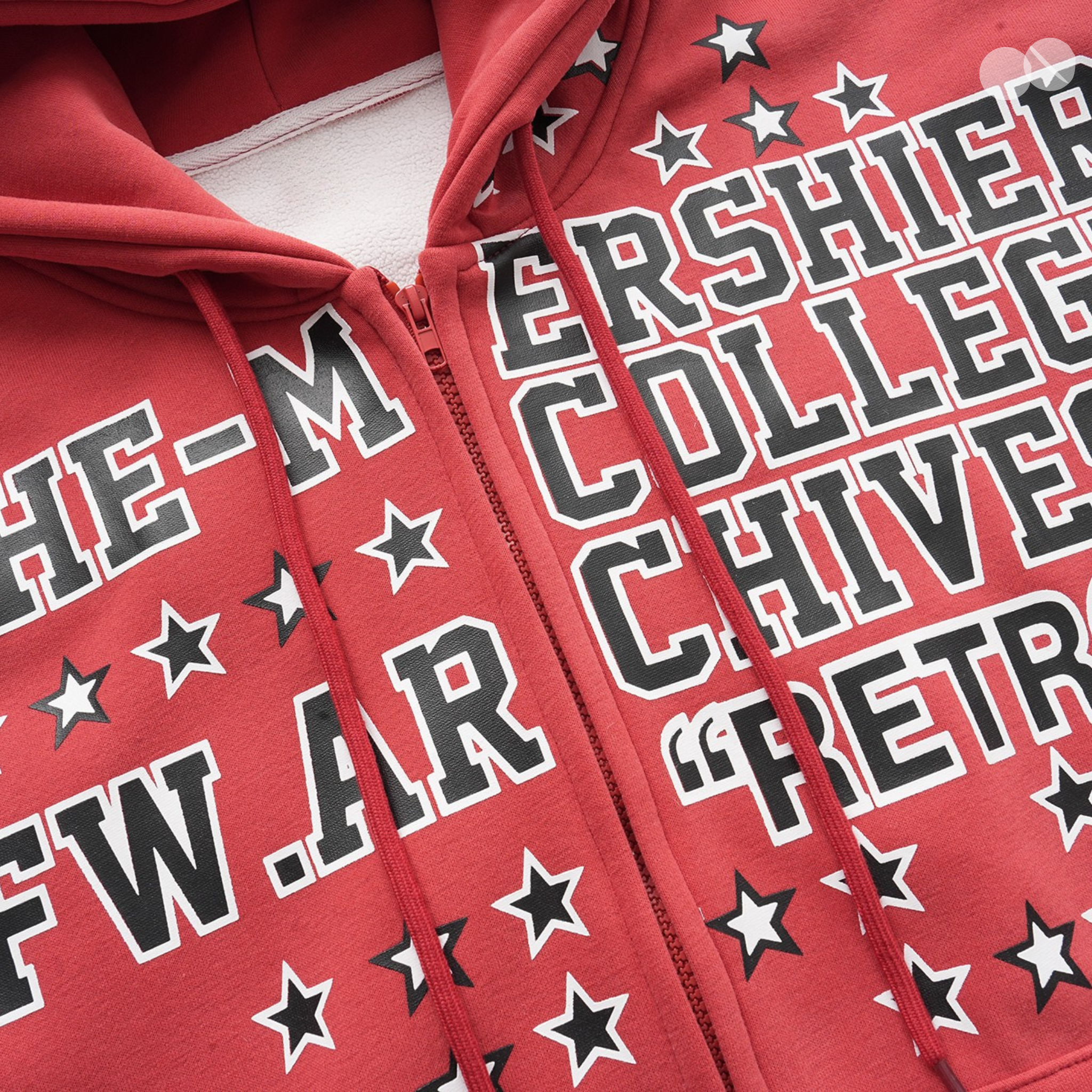 The Omirad Retro Varsity Zip Hoodie channels collegiate energy through bold typography and star detailing. Made from a premium cotton-polyester blend (52% cotton, 48% polyester), this hoodie delivers a structured yet soft feel. Its oversized front-and-sleeve print design brings a retro sports aesthetic, while the full-zip closure and kangaroo pockets add practicality for everyday street layering.