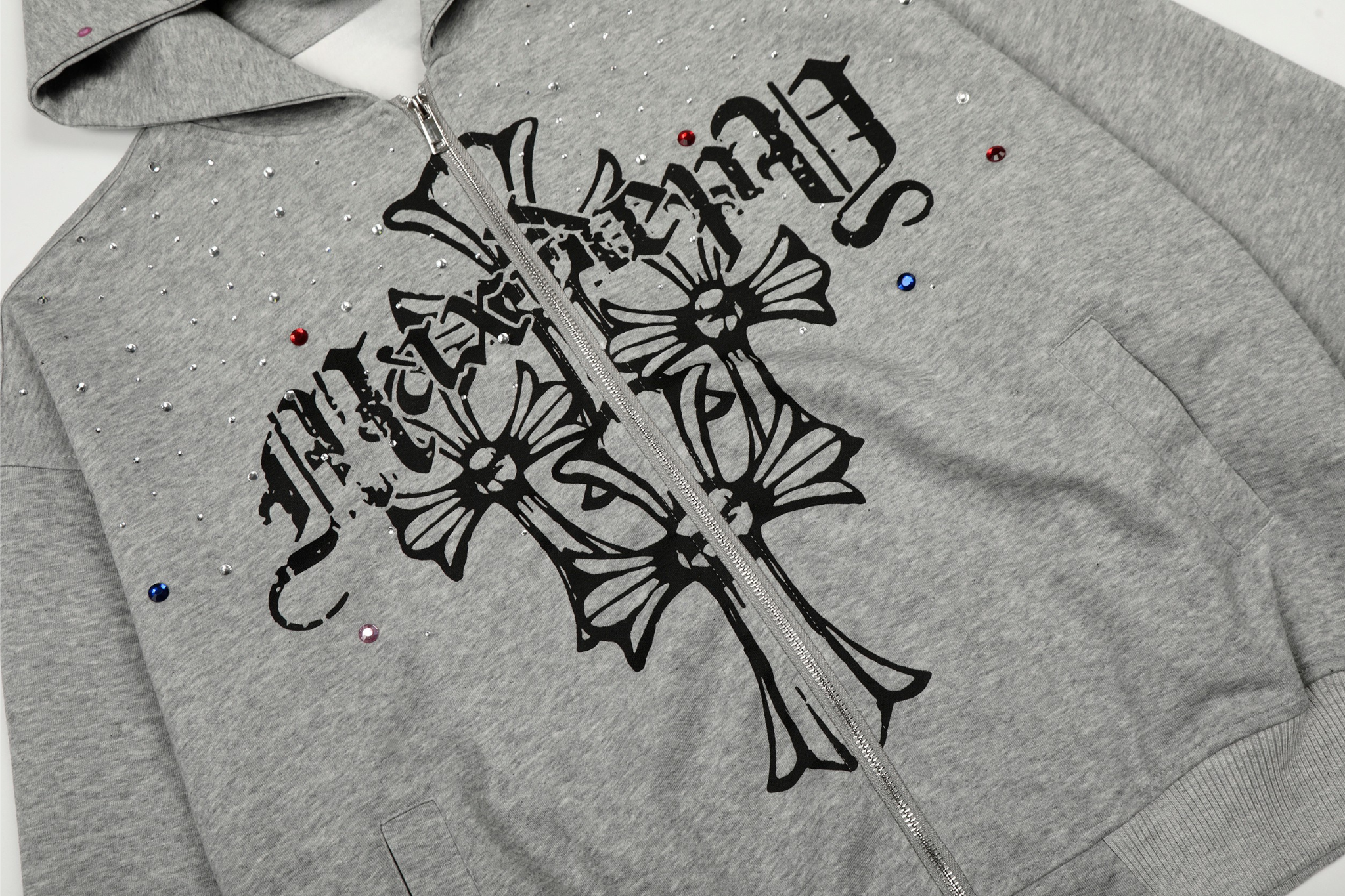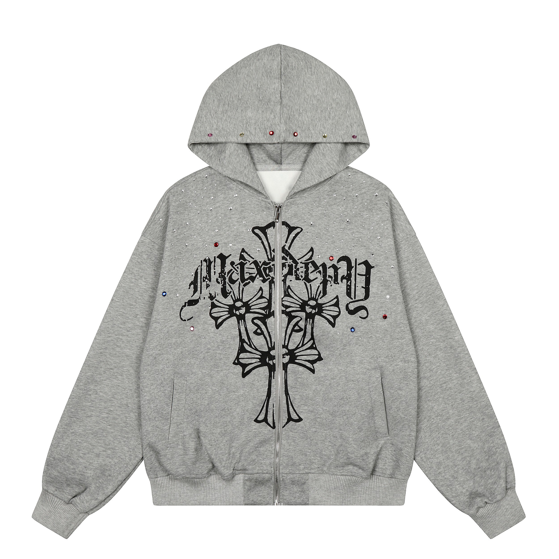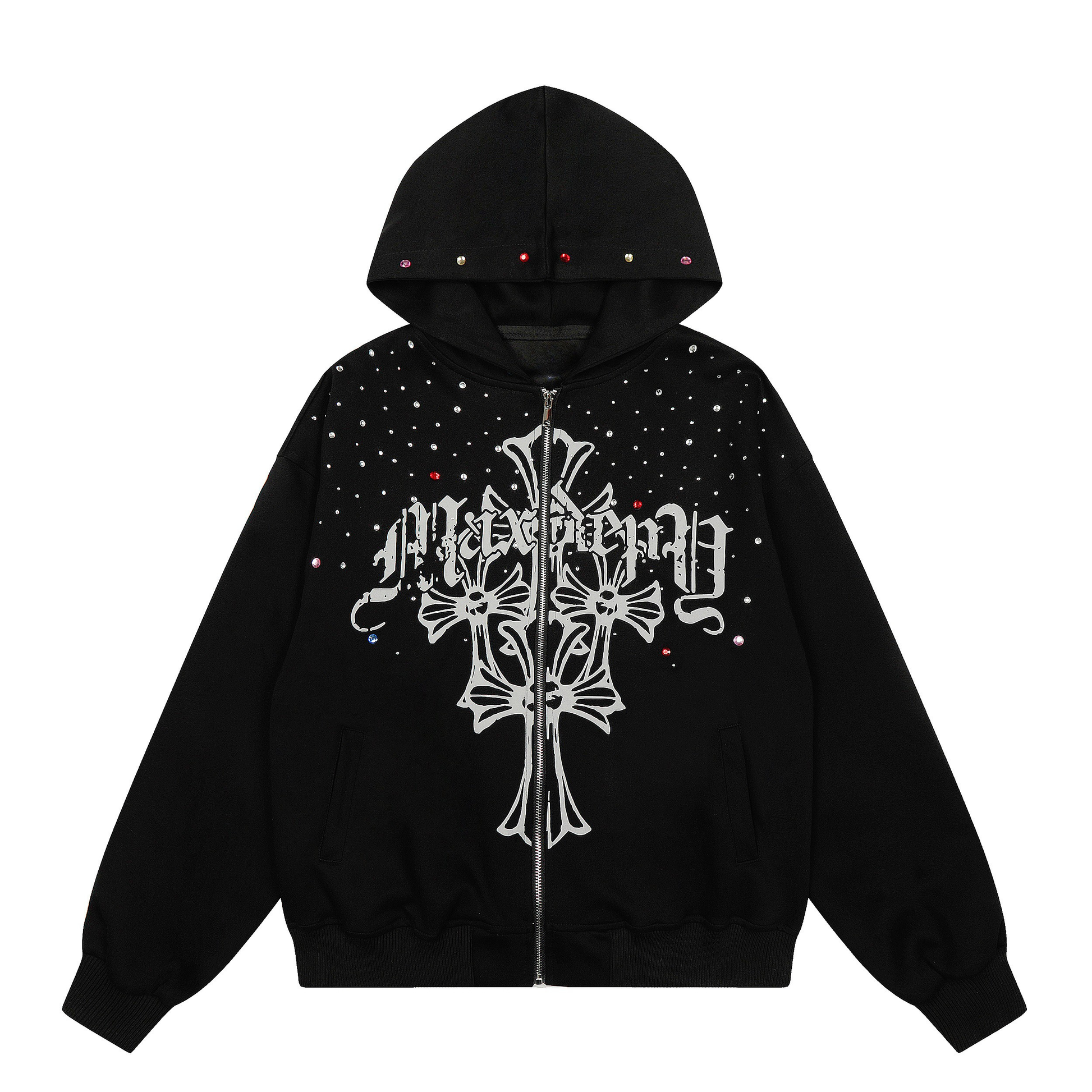 Clothing details: Full zip front closure, hooded design, cross graphic print, rhinestone embellishment detailing throughout, relaxed oversized fit, ribbed cuffs and hem, front hand pockets, available in multiple colorways.