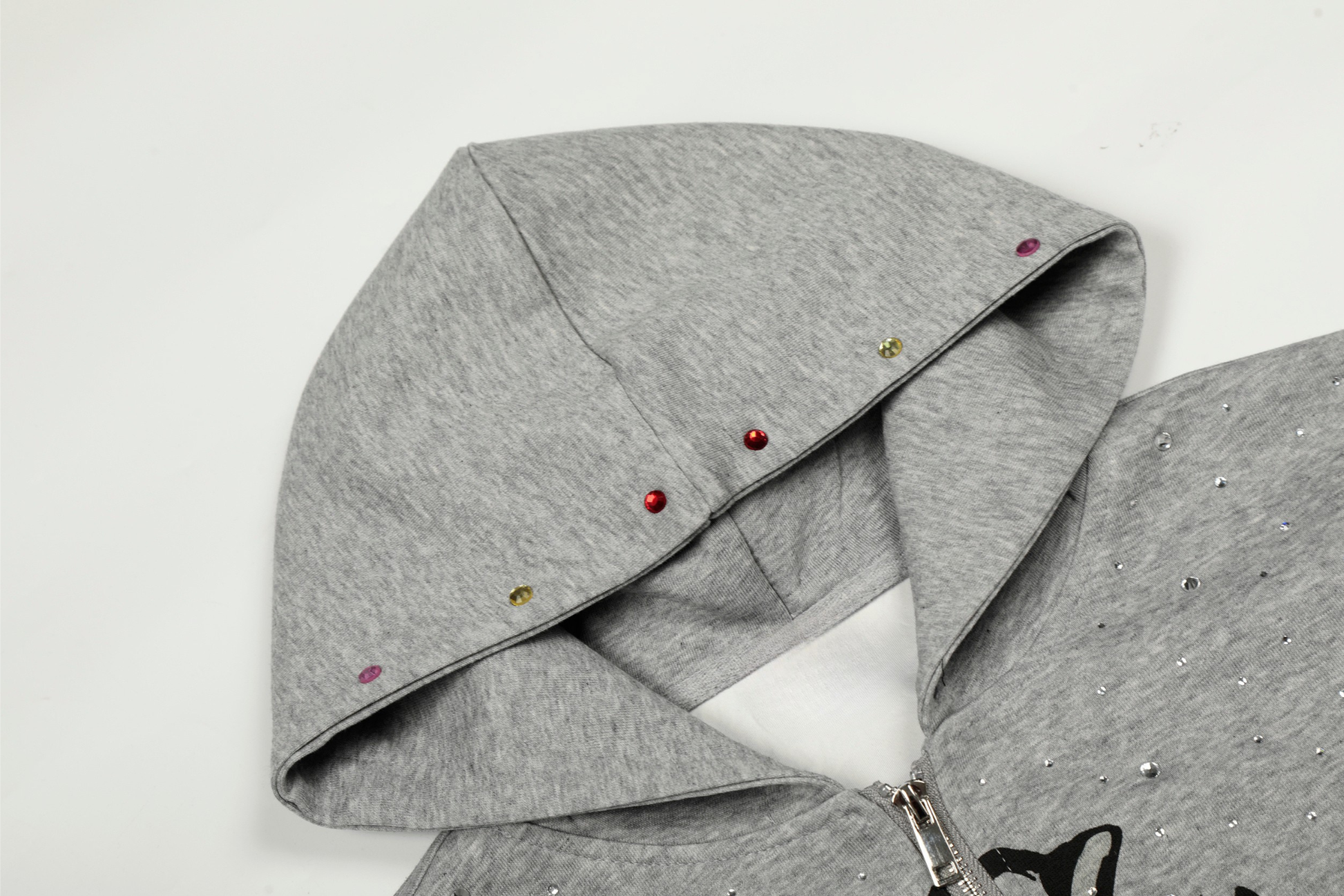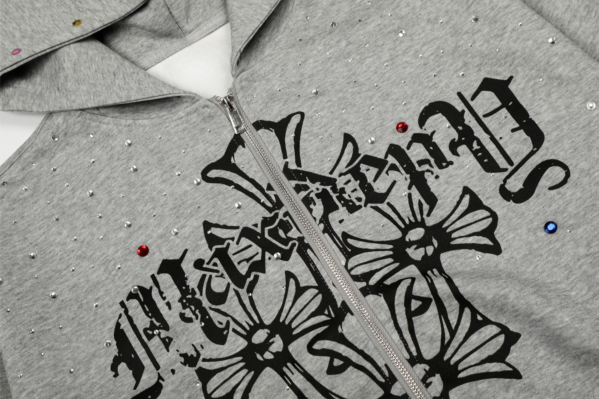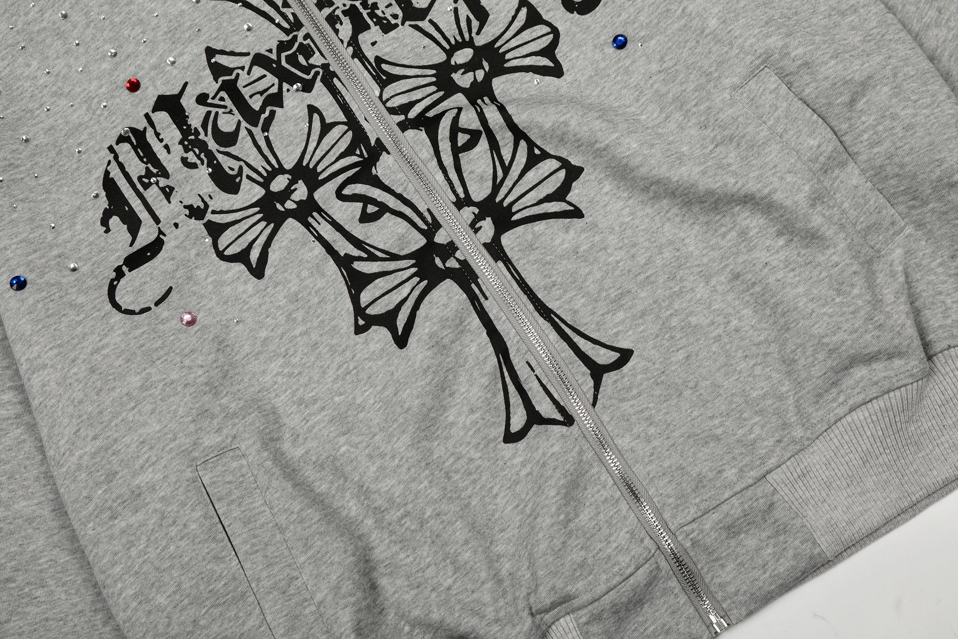 Clothing details: Full zip front closure, hooded design, cross graphic print, rhinestone embellishment detailing throughout, relaxed oversized fit, ribbed cuffs and hem, front hand pockets, available in multiple colorways.