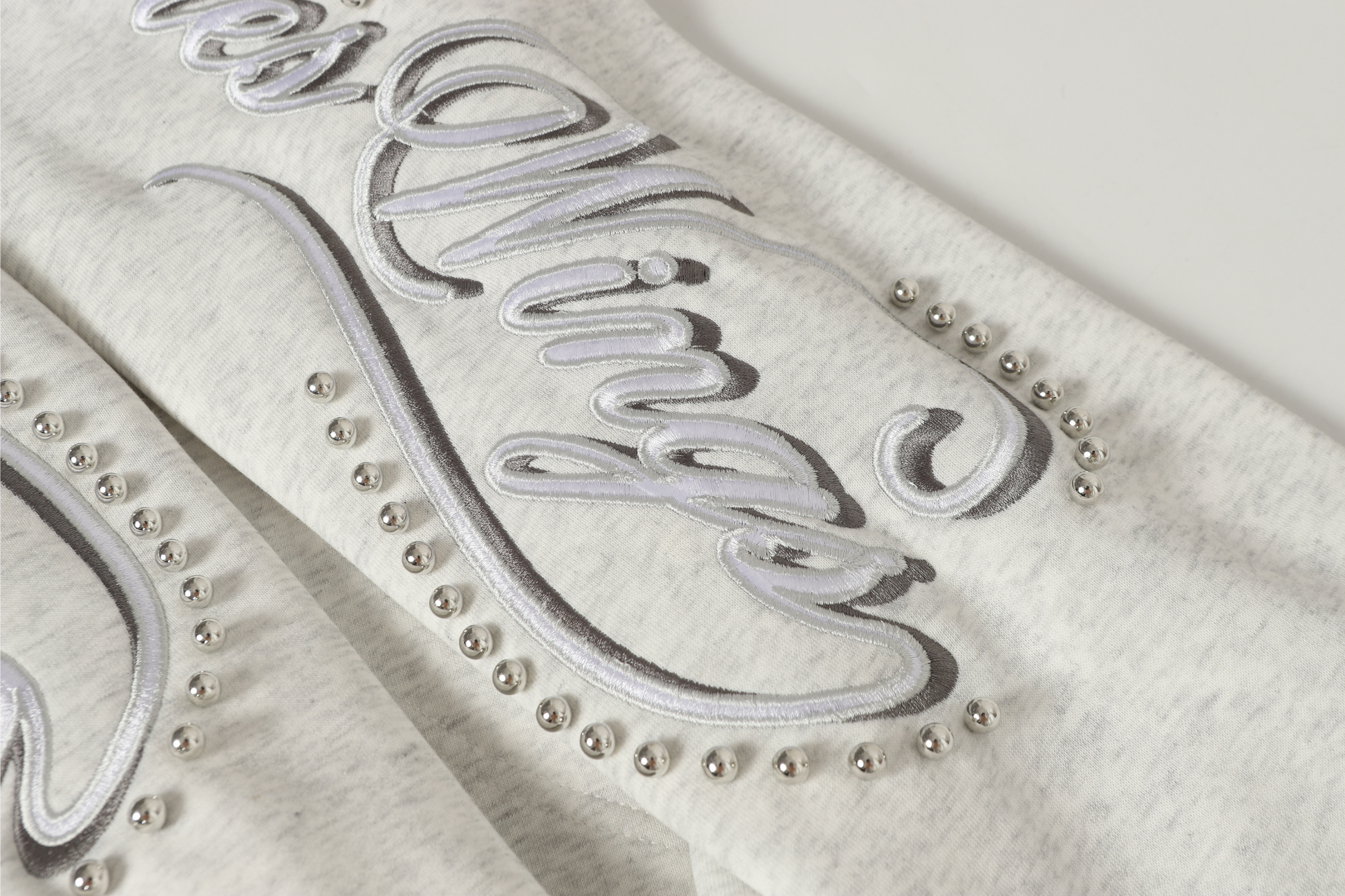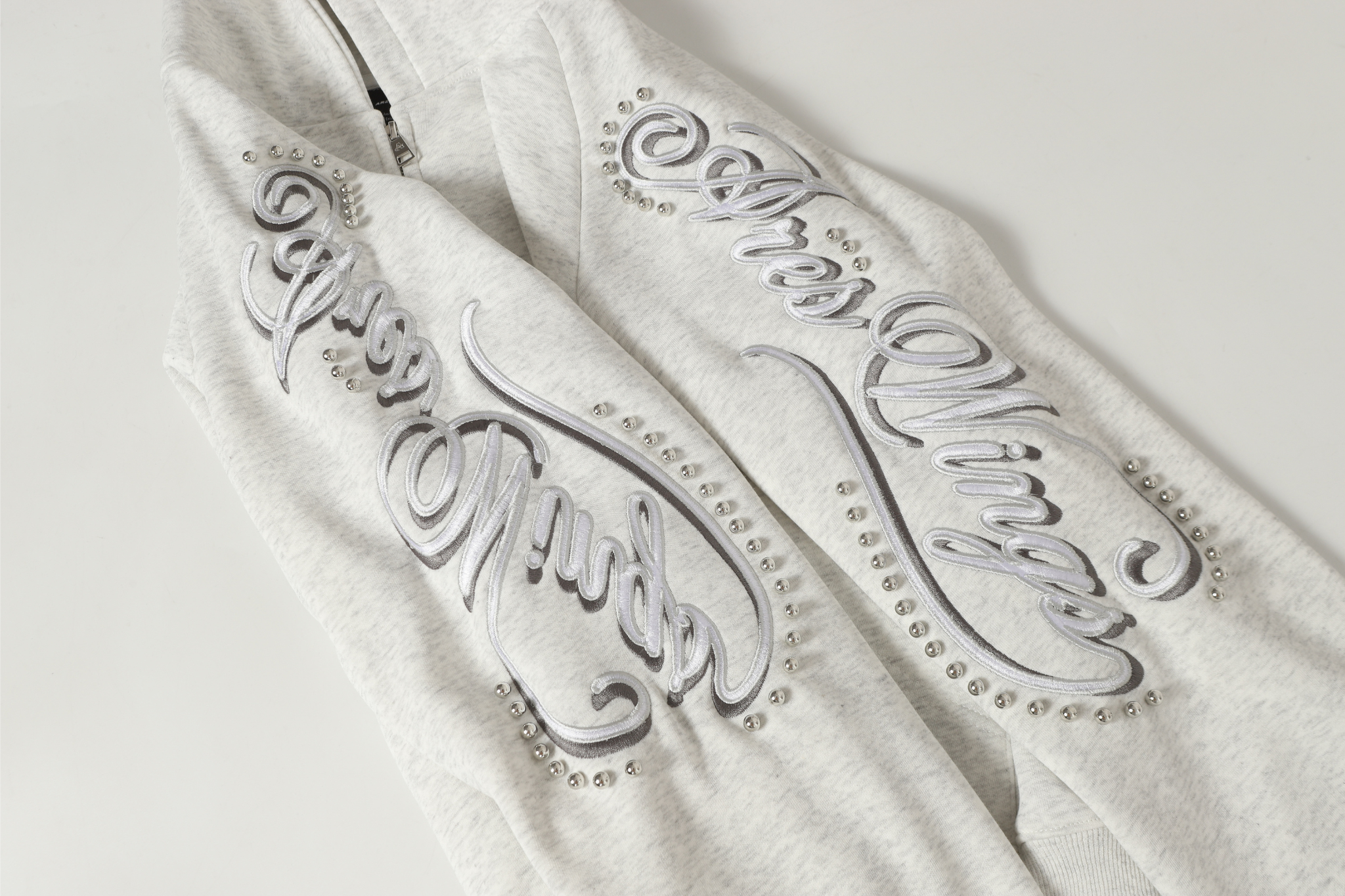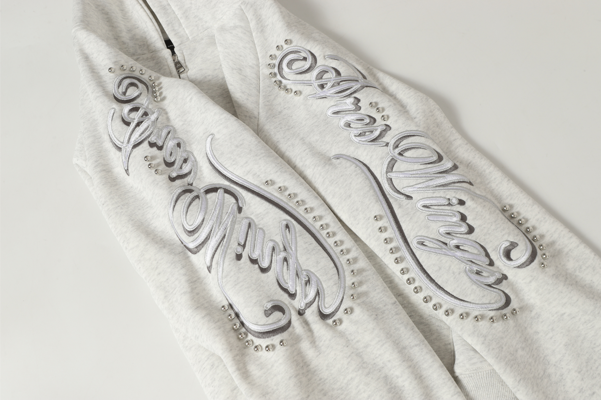 The Omirad Rhinestone Script Zip Hoodie merges classic comfort with statement streetwear detailing. Made from a soft and durable blend of 53% cotton and 47% polyester, this hoodie provides a structured yet cozy feel suitable for everyday layering. The standout design features bold embroidered script patterns running along both sleeves, embellished with metallic studs and rhinestone accents that add a subtle shine under light.