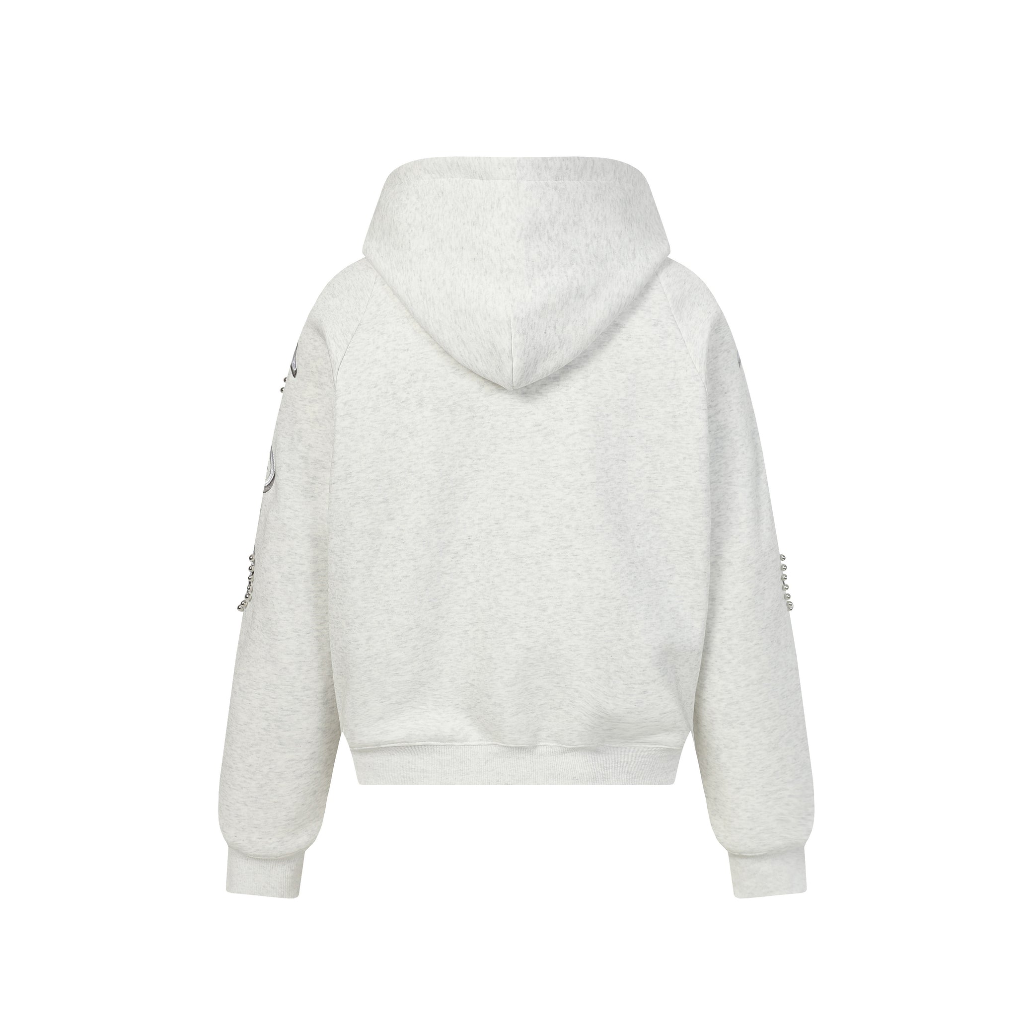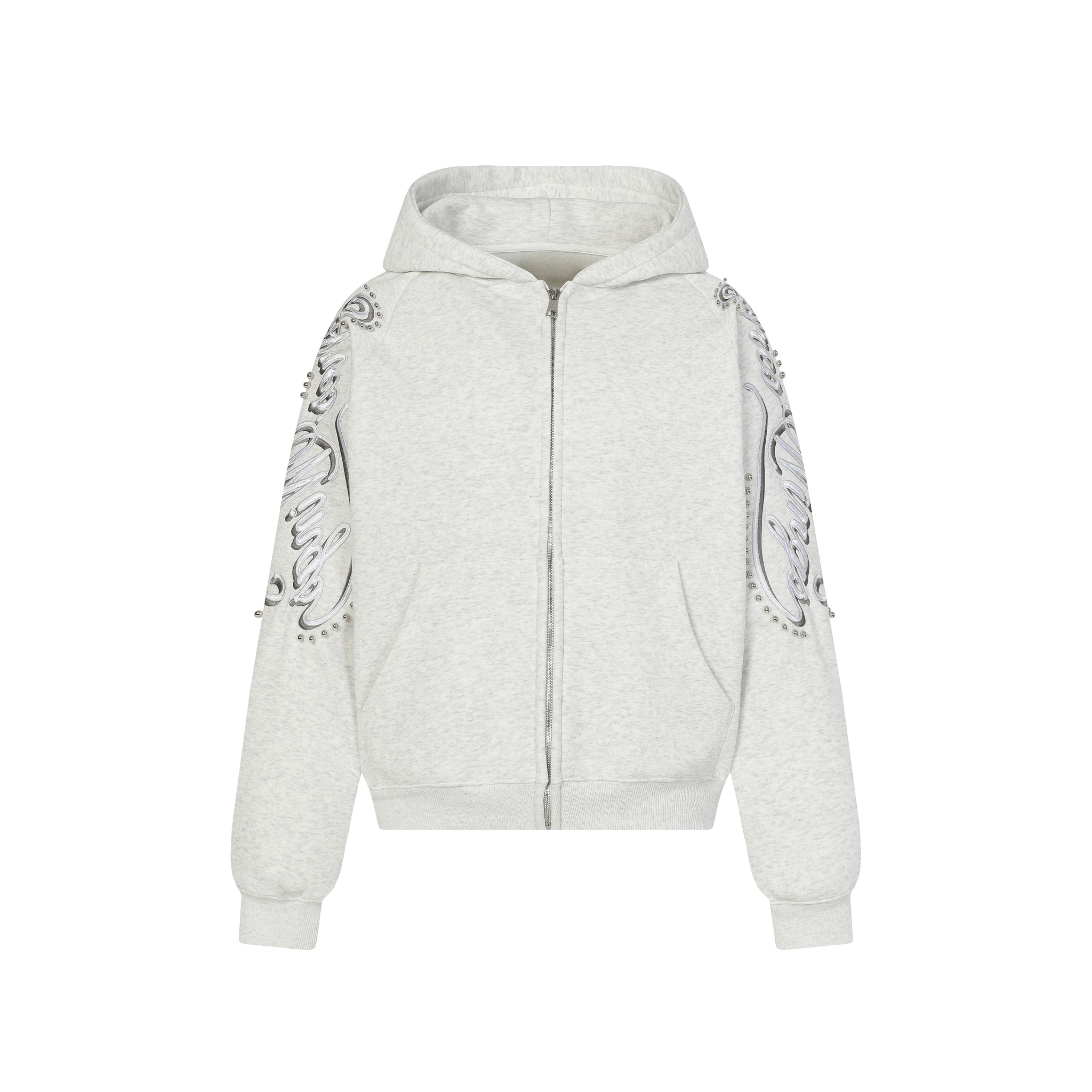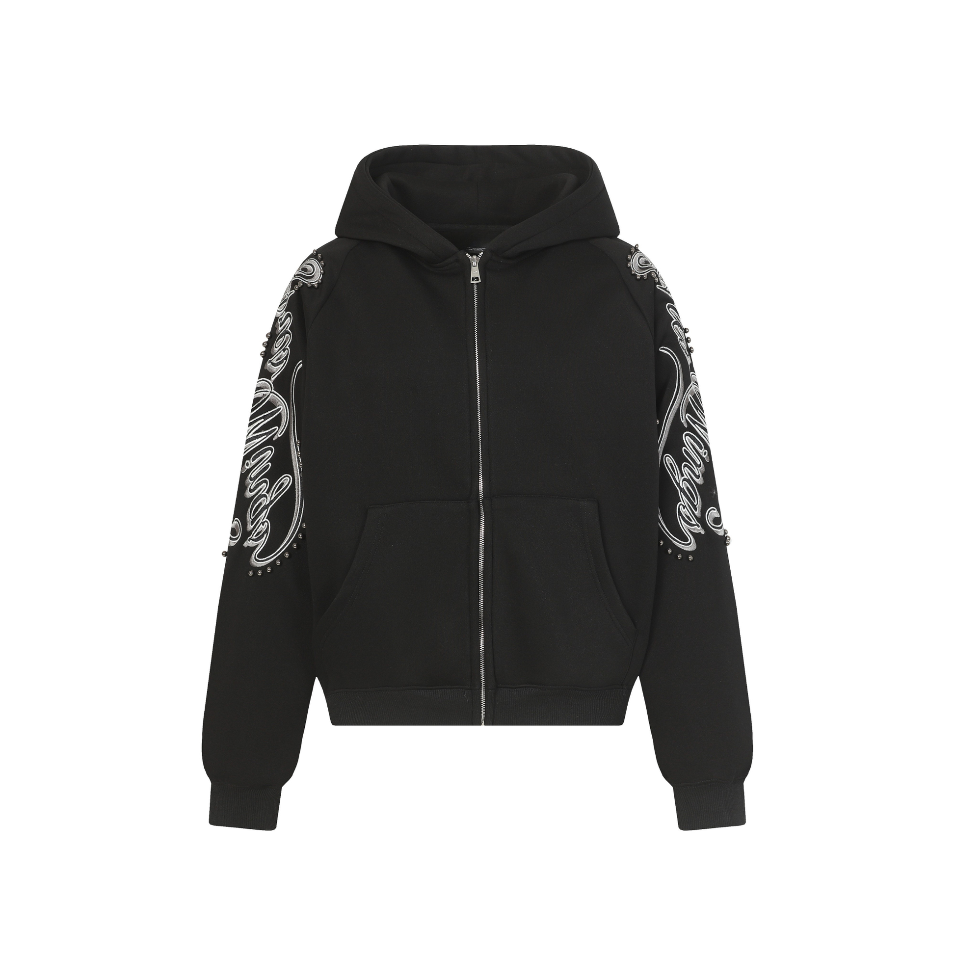 Clothing Details: Embroidered sleeve script design, rhinestone and metal stud embellishment, full zip front, kangaroo pockets, ribbed cuffs and hem, relaxed streetwear fit