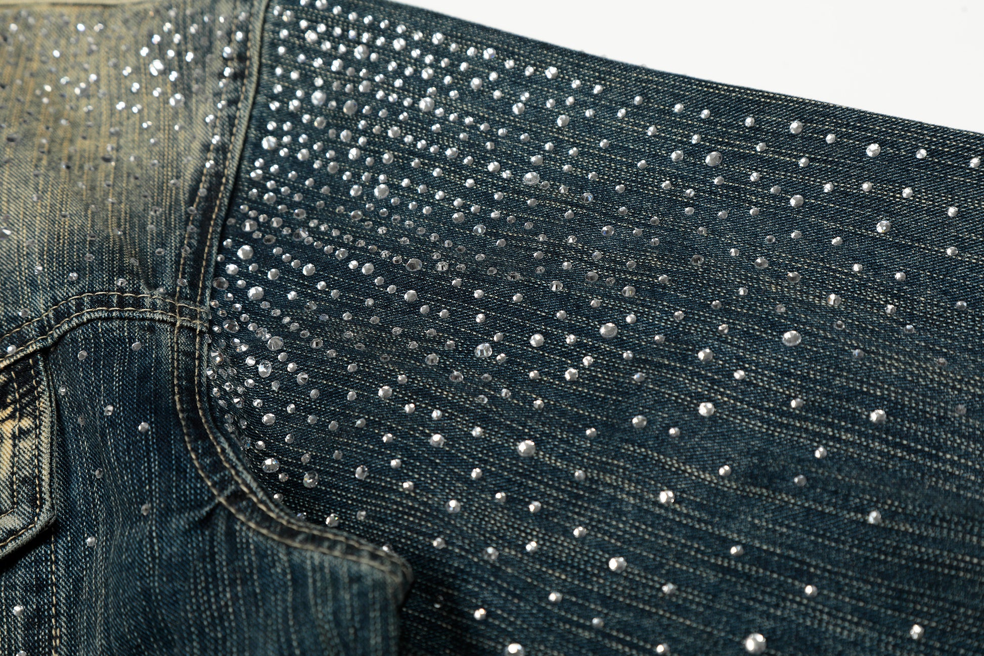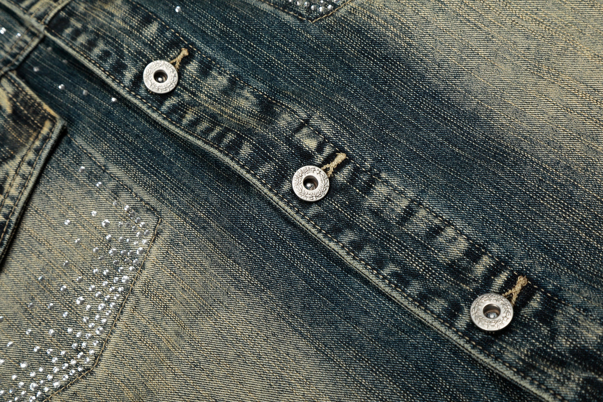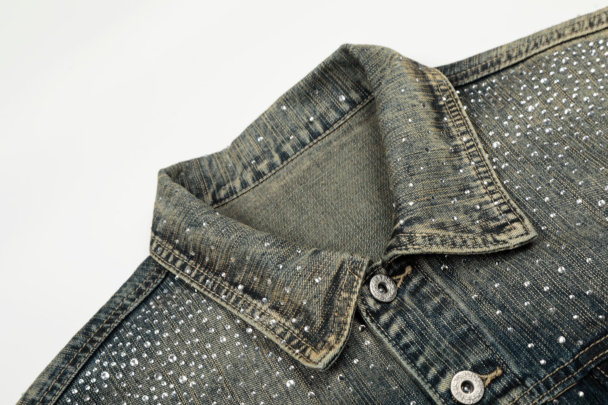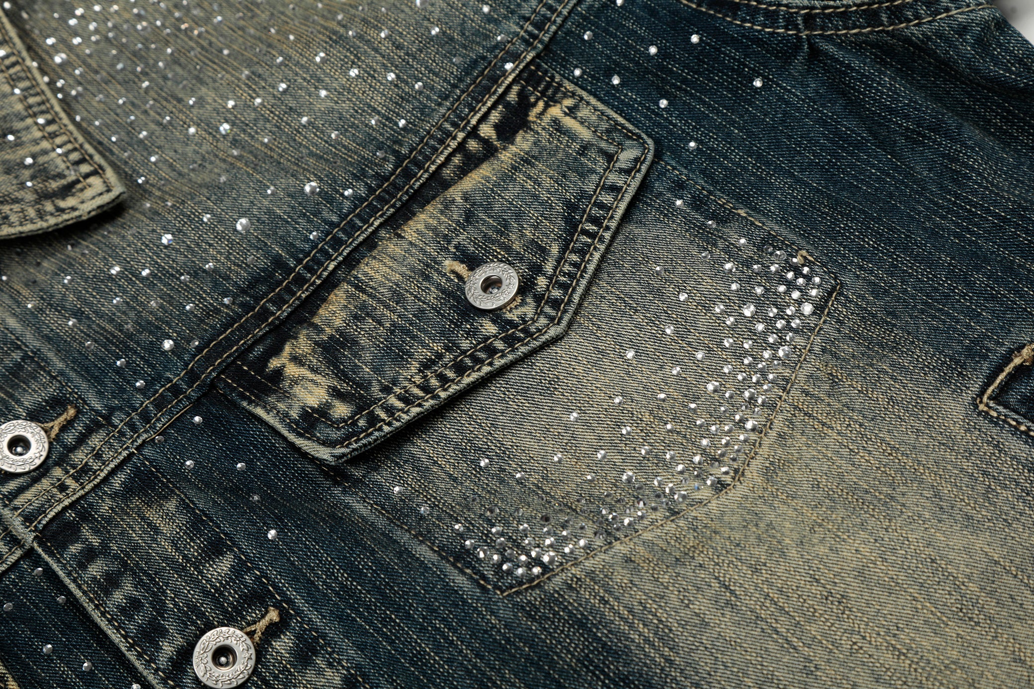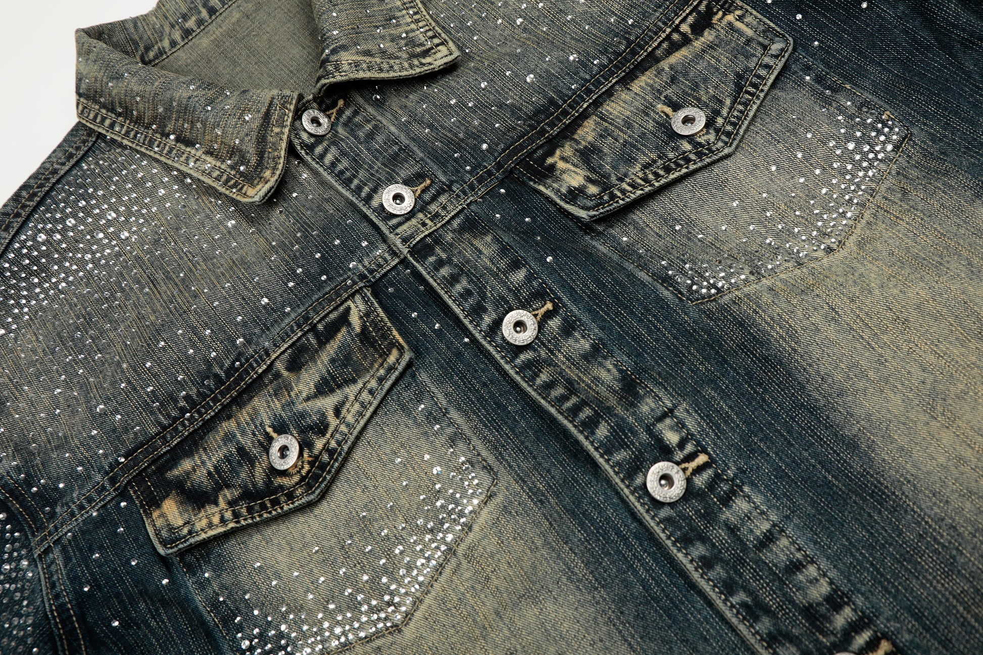 Clothing Details: Gradient washed denim, full rhinestone embellishment, front button closure, flap chest pockets, straight hem, structured fit