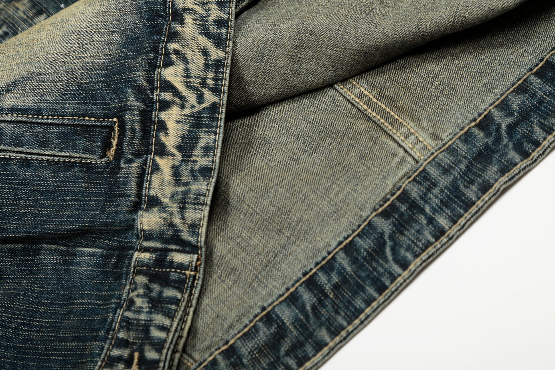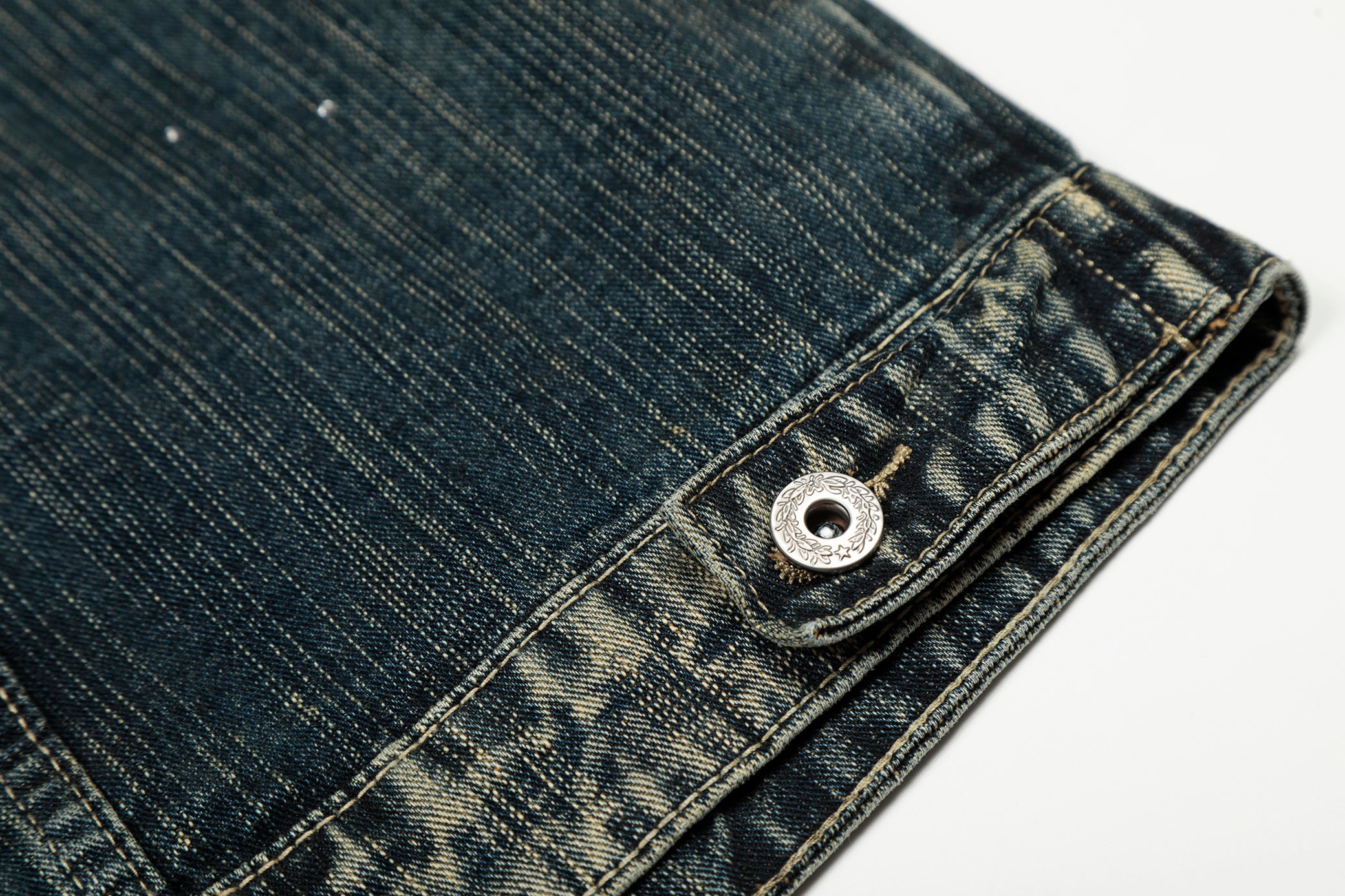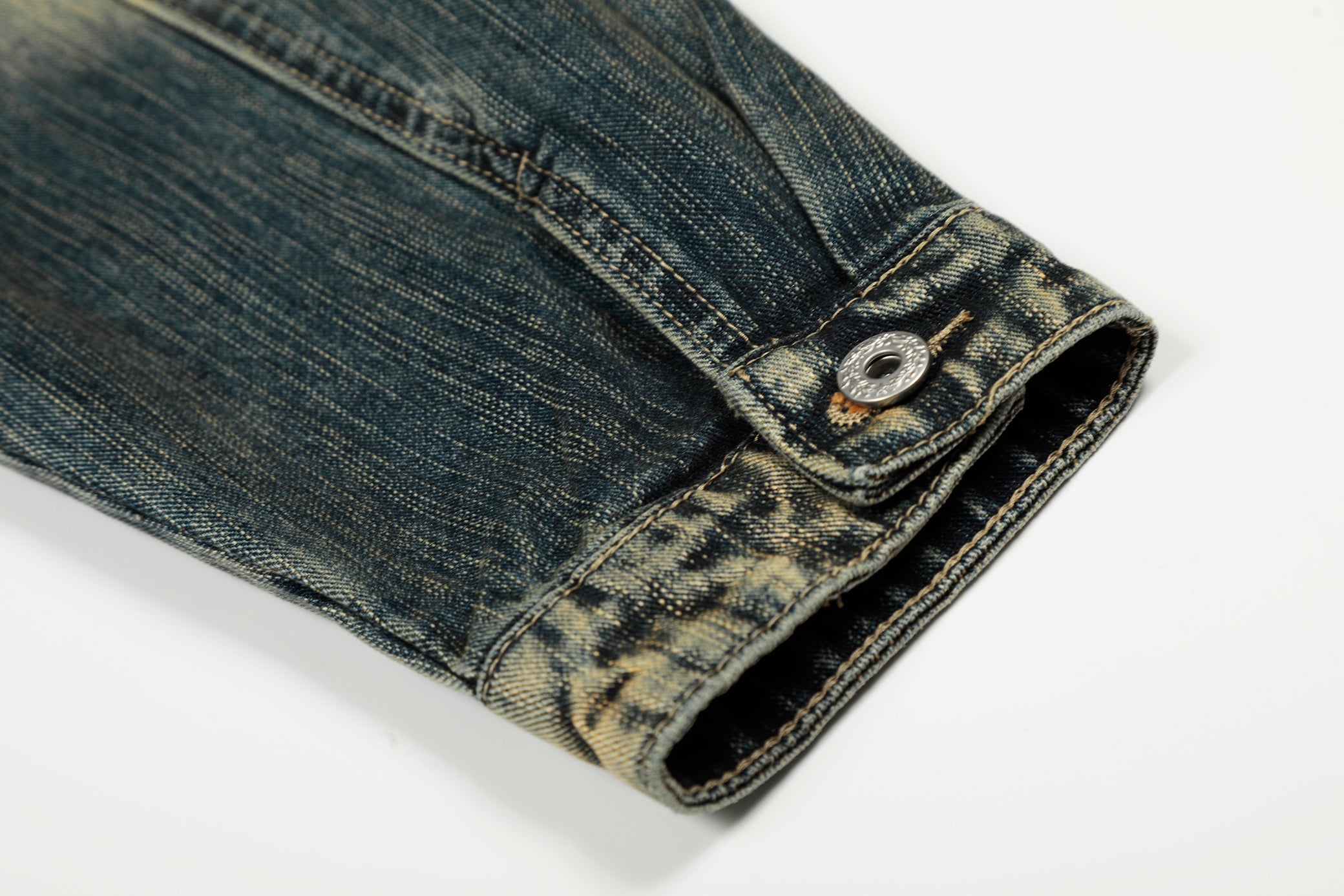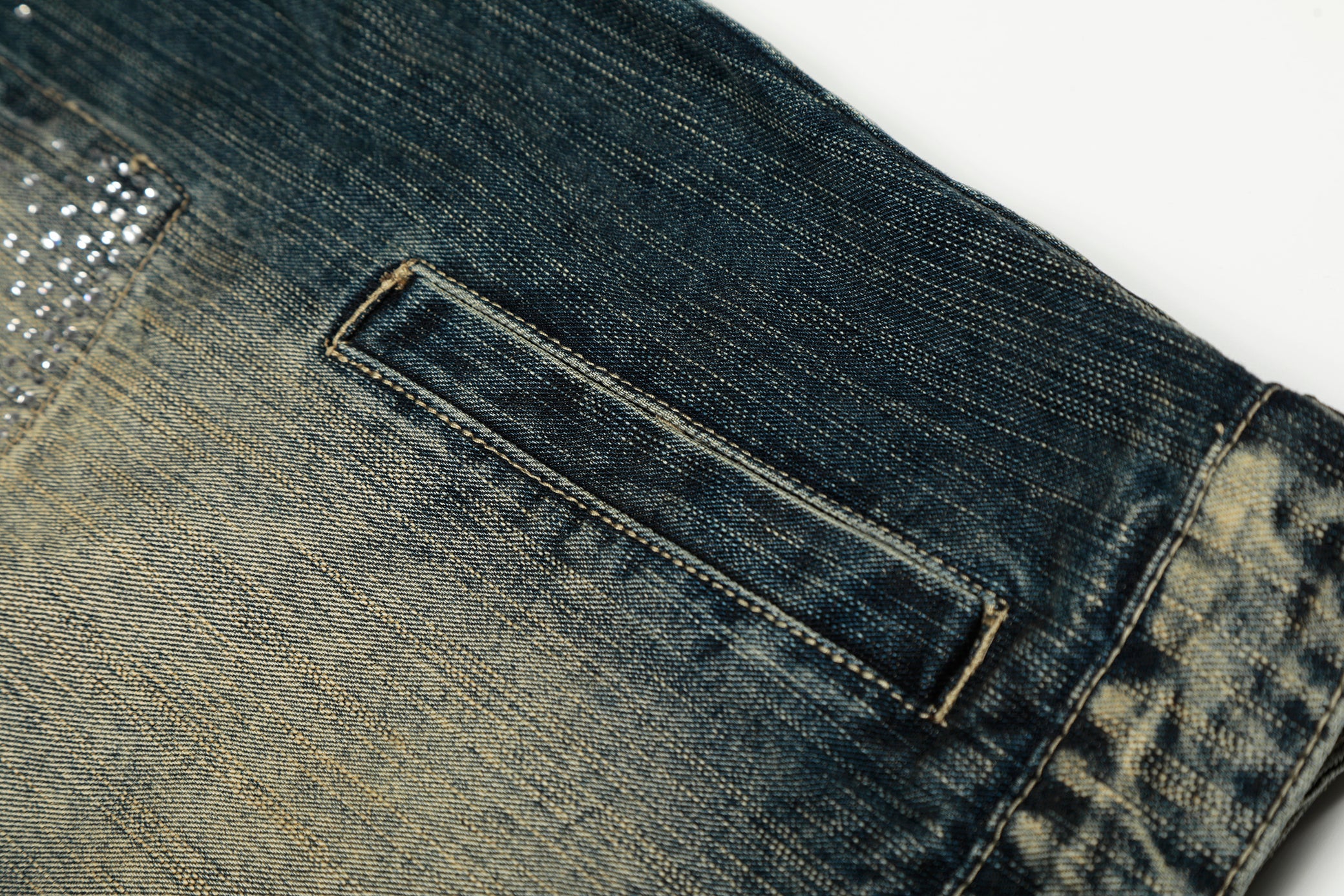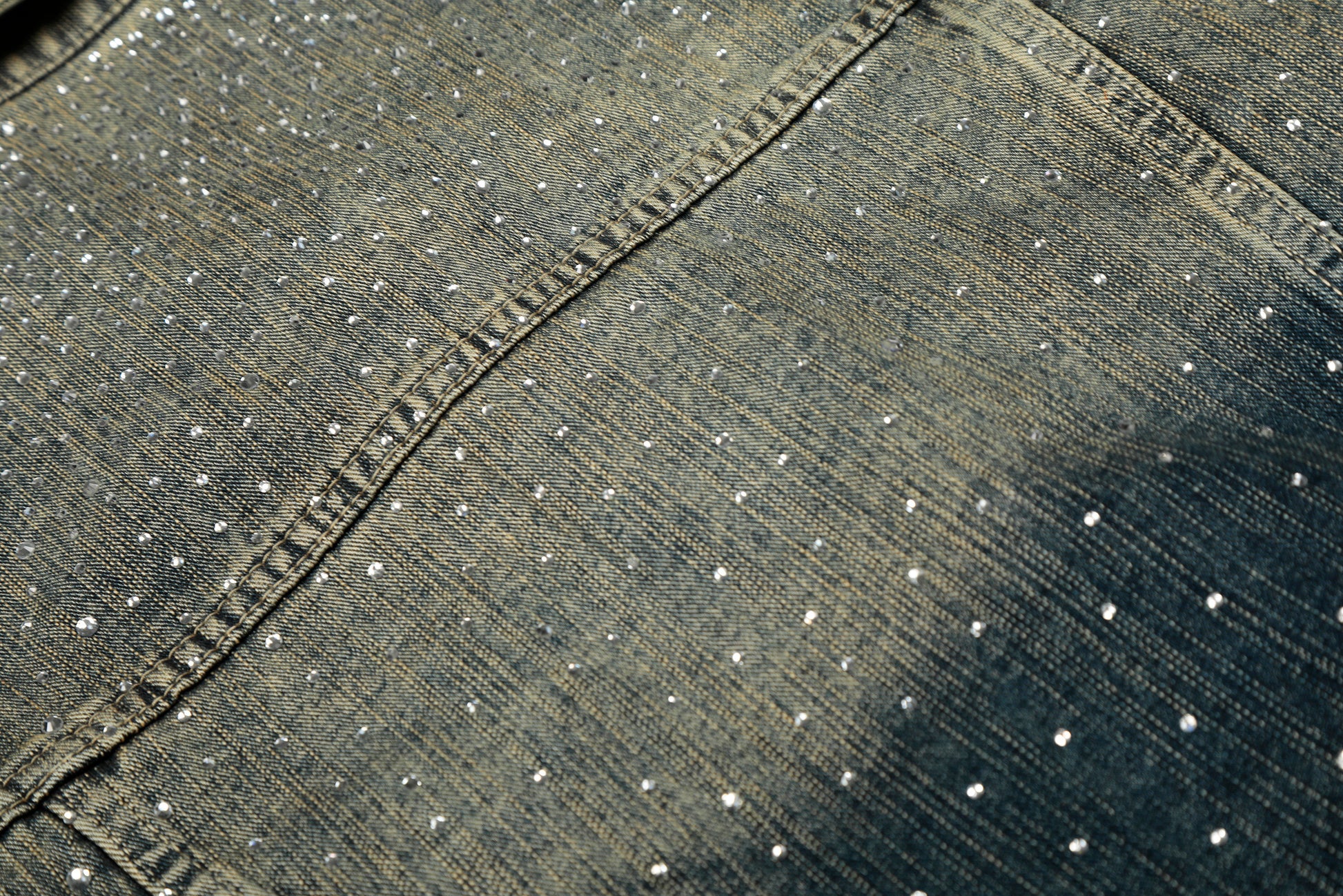 Clothing Details: Gradient washed denim, full rhinestone embellishment, front button closure, flap chest pockets, straight hem, structured fit
