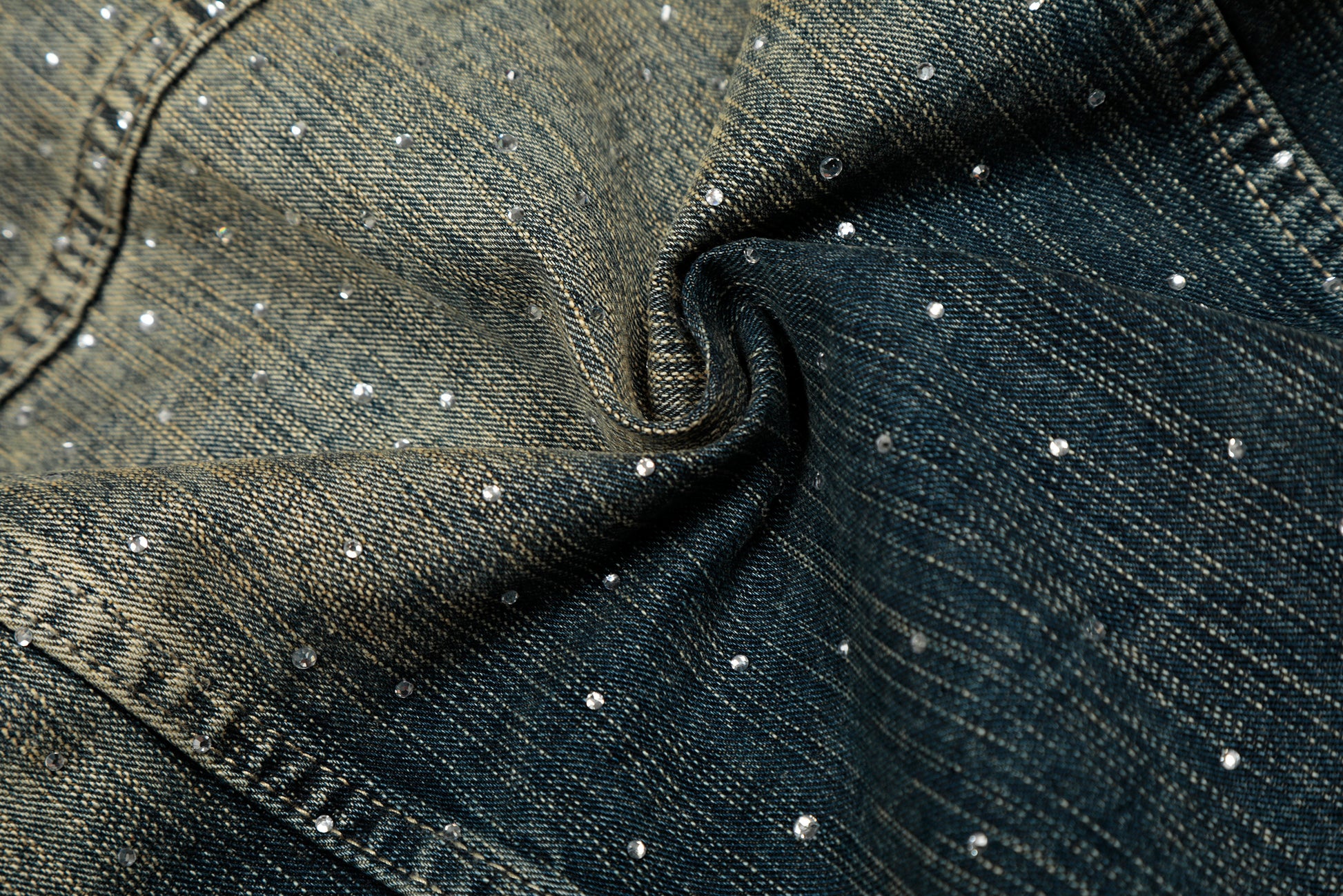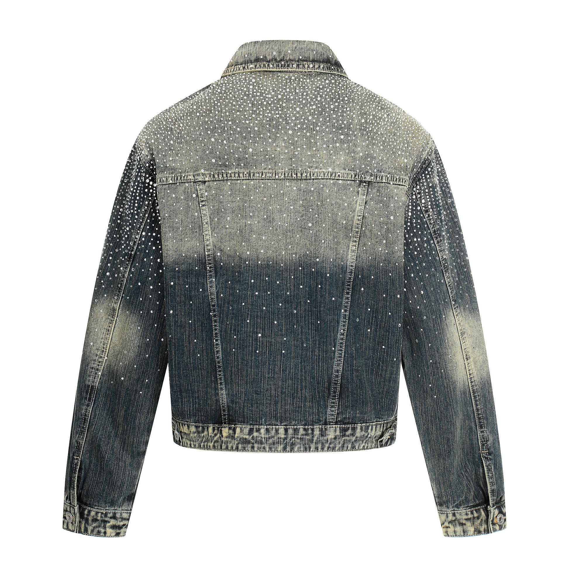 The Omirad Rhinestone Gradient Denim Jacket captures bold street glamour with a vintage wash and full rhinestone embellishment. Made entirely from 100% cotton, it maintains a structured silhouette while ensuring comfort and breathability. The gradient faded denim effect is elevated with densely placed rhinestones across the shoulders, sleeves, and chest, creating a dynamic sparkle that catches light from every angle. Classic button-down front and chest flap pockets retain the timeless denim jacket design.