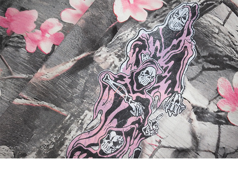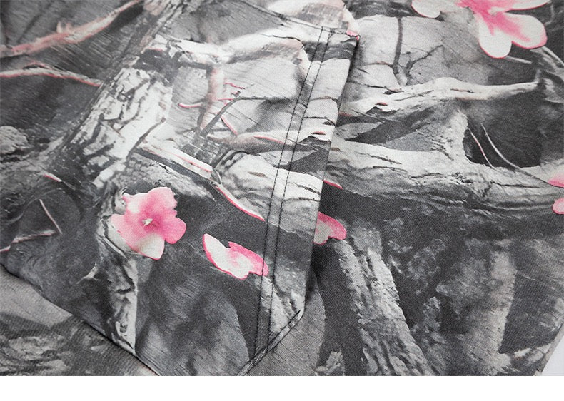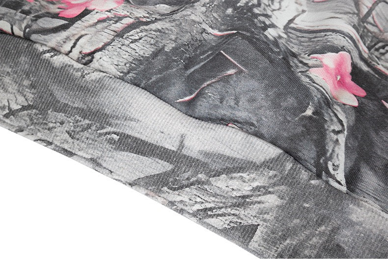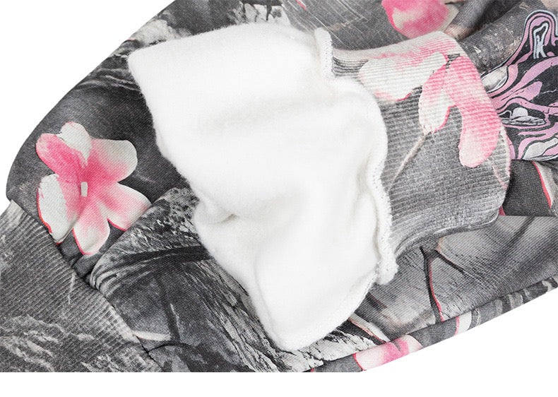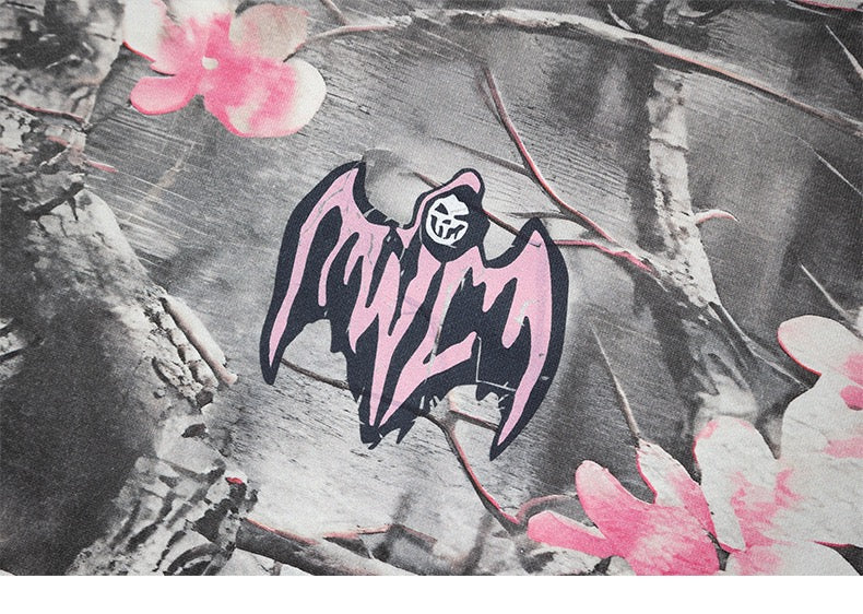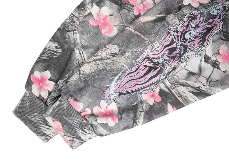 Clothing details: All-over camo and sakura print, gothic graphic detailing on chest and sleeves, adjustable drawstring hood, fleece-lined interior for added warmth, ribbed cuffs and hem, kangaroo front pocket, relaxed streetwear fit.