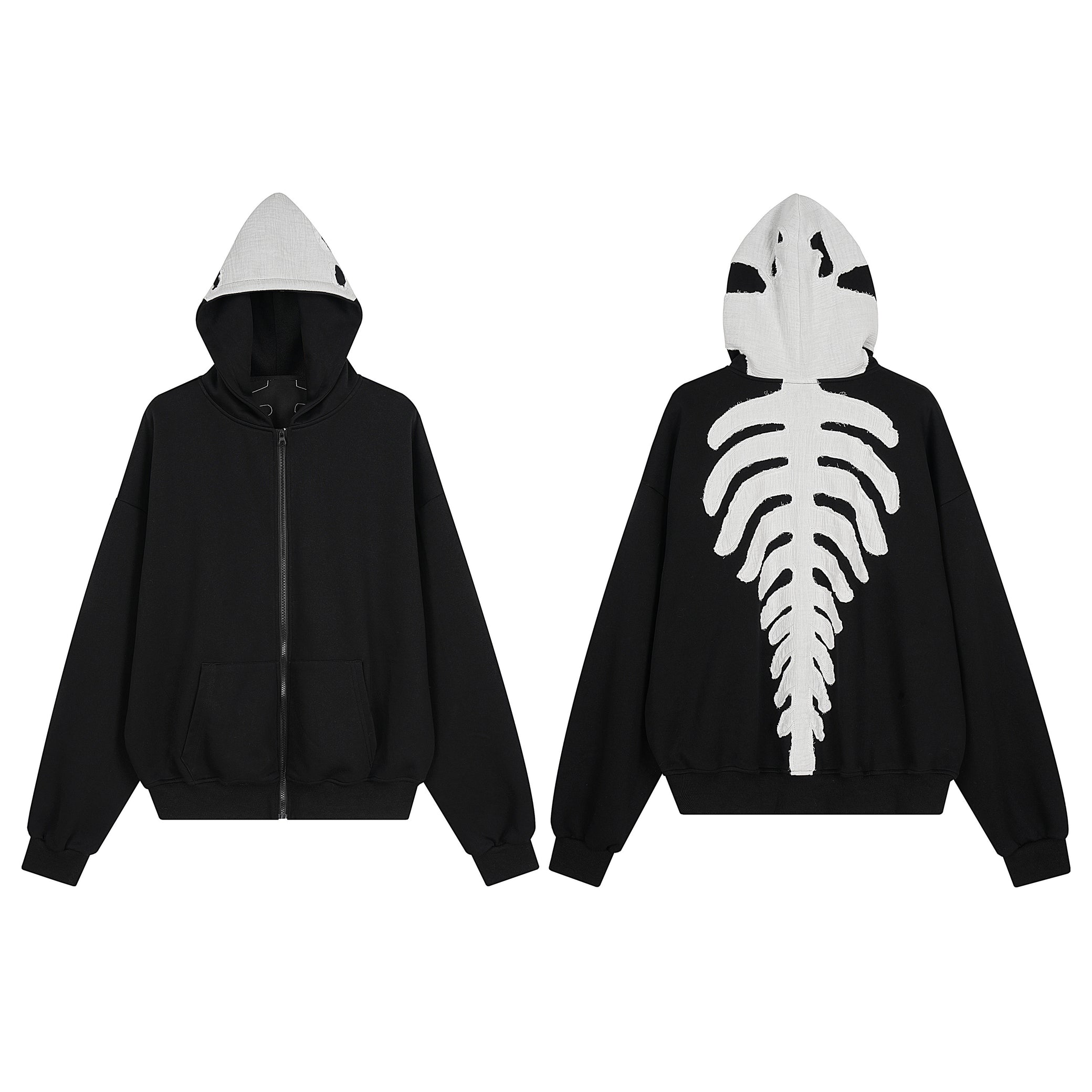 The Omirad Skeleton Zip-Up Hoodie features a bold skeletal graphic that runs across the hood and back, creating a striking contrast against its clean black base. Designed to elevate everyday streetwear with dark visual impact, this hoodie balances comfort and attitude through a relaxed silhouette and statement detailing. Built for those who lean into underground aesthetics, it delivers standout style with effortless wearability.