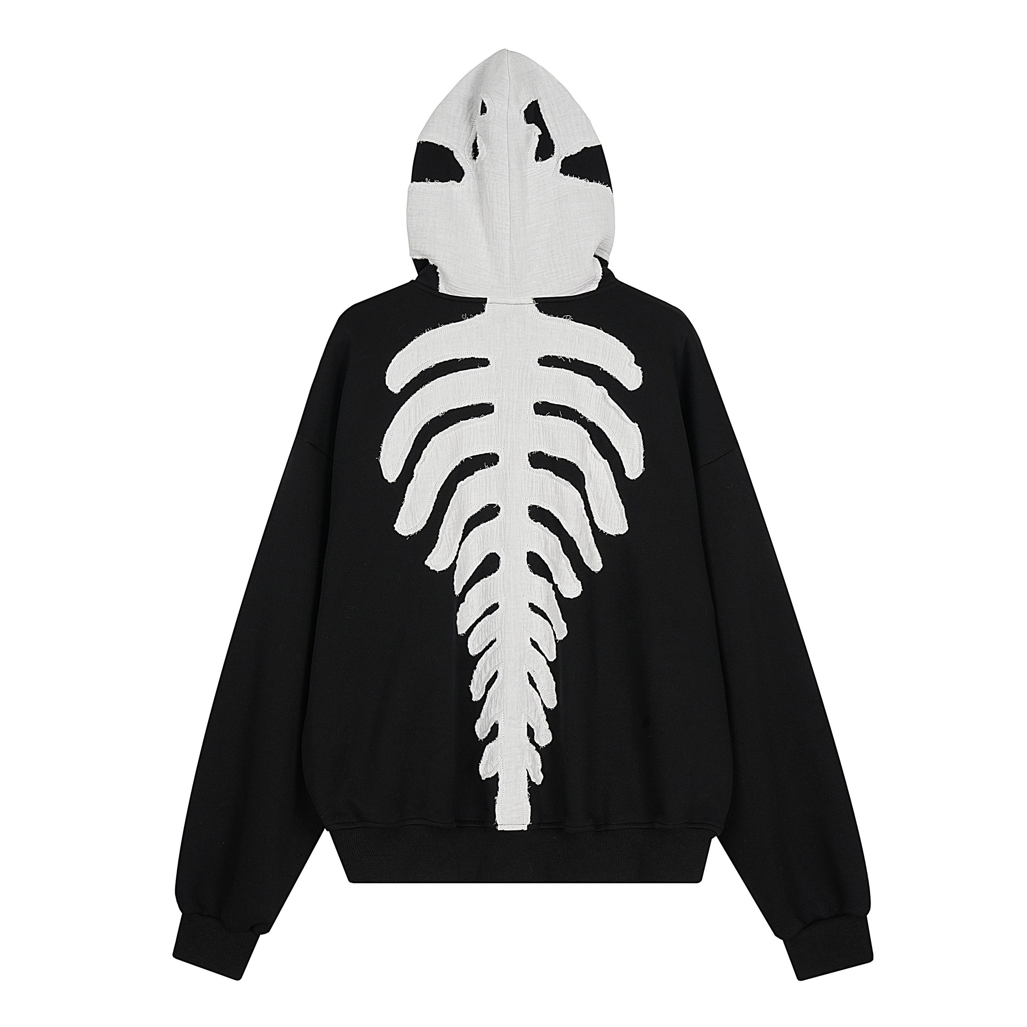 Clothing details: Full zip front closure, hooded design with extended skeleton graphic detailing, bold back graphic print, relaxed fit, ribbed cuffs and hem, front hand pockets.