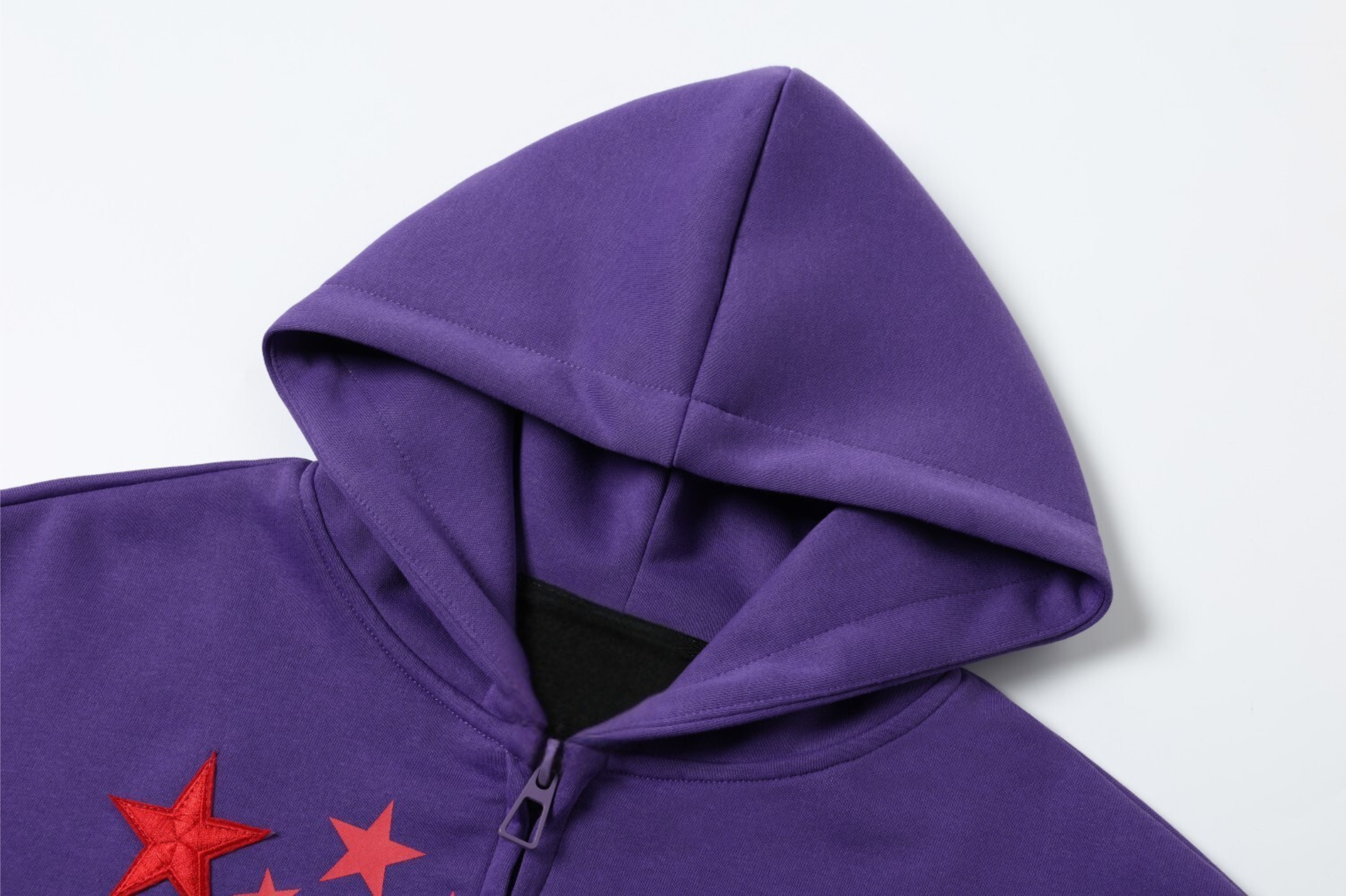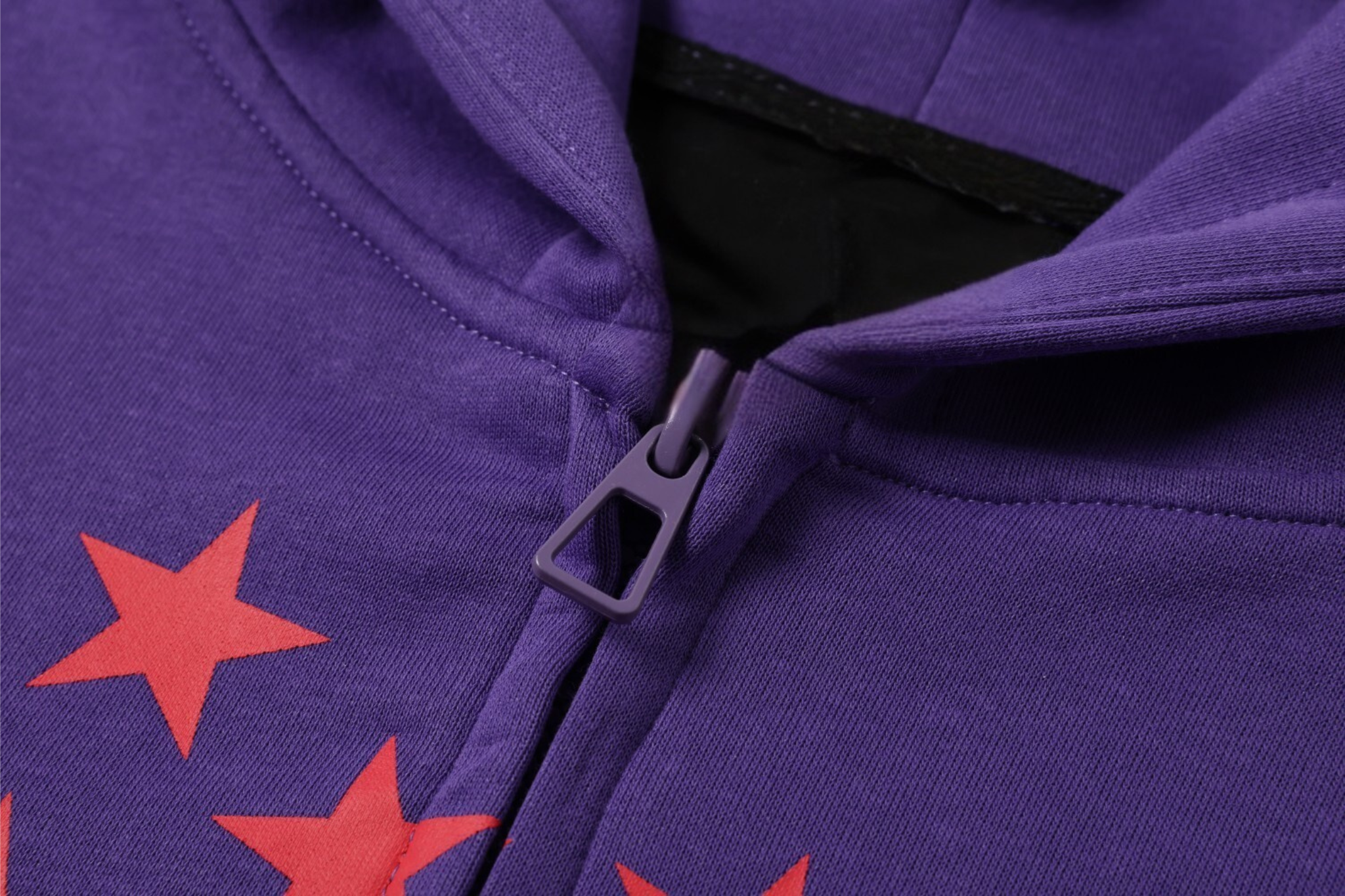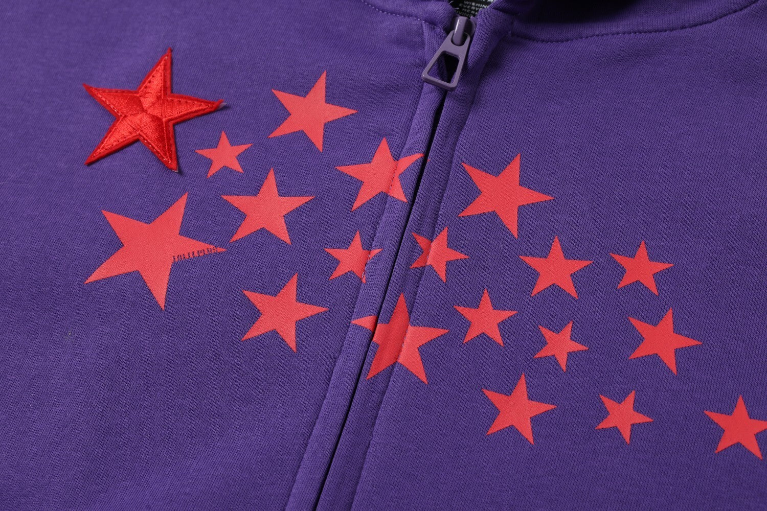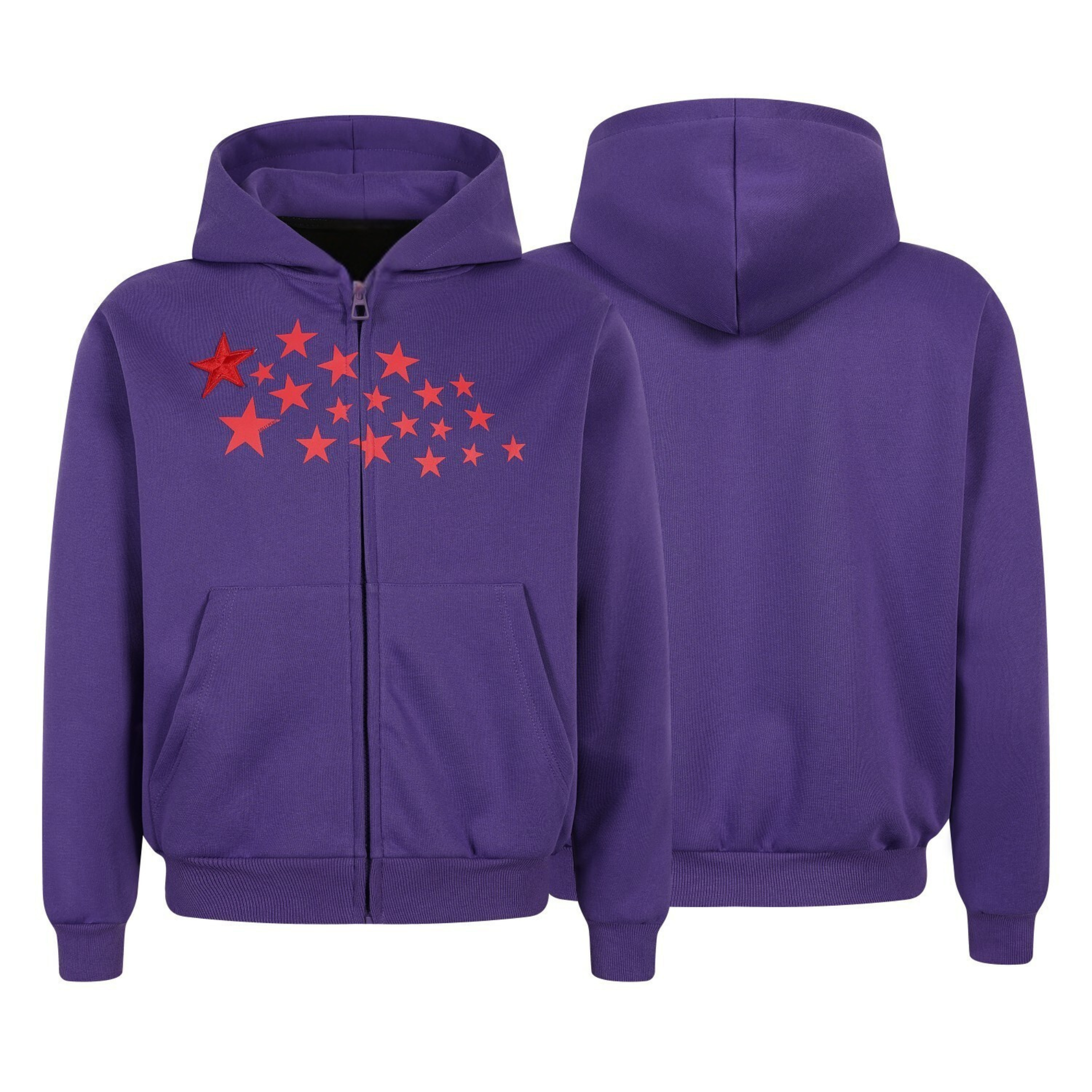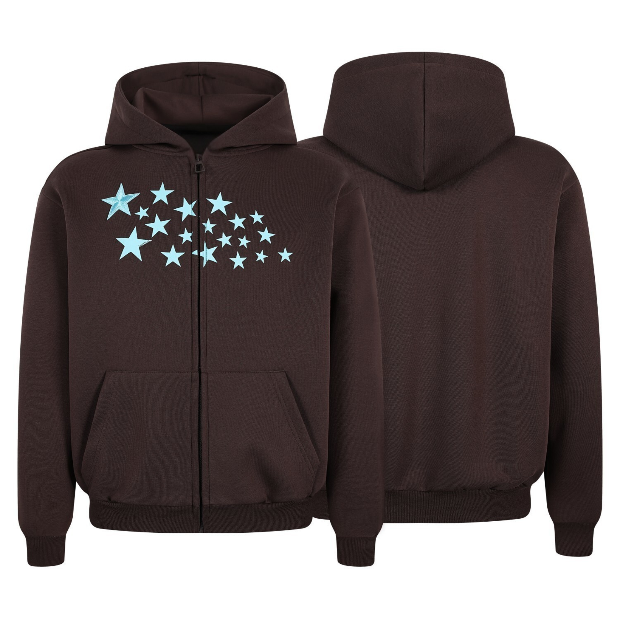 Clothing details: Full-zip hoodie design, star cluster front graphic, hooded neckline, kangaroo pockets, ribbed cuffs and hem, relaxed fit silhouette, soft breathable athletic fabric, suitable for all-season layering, available in multiple colorways.
