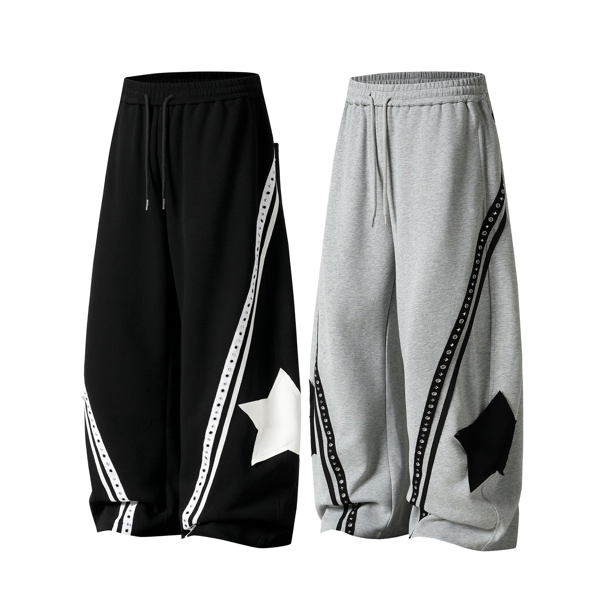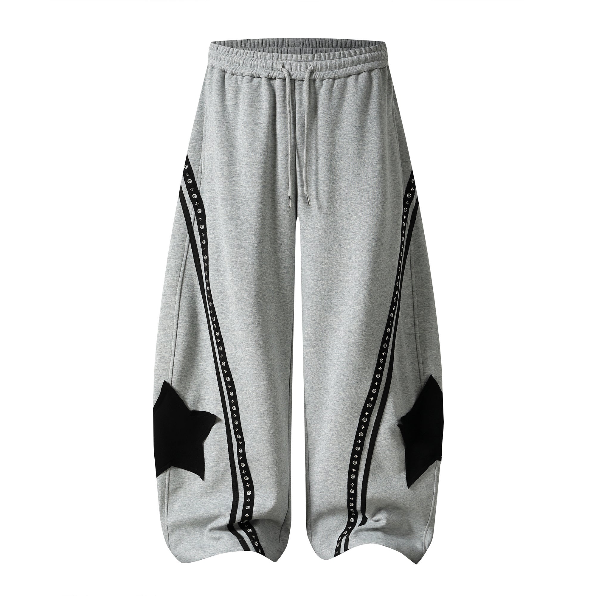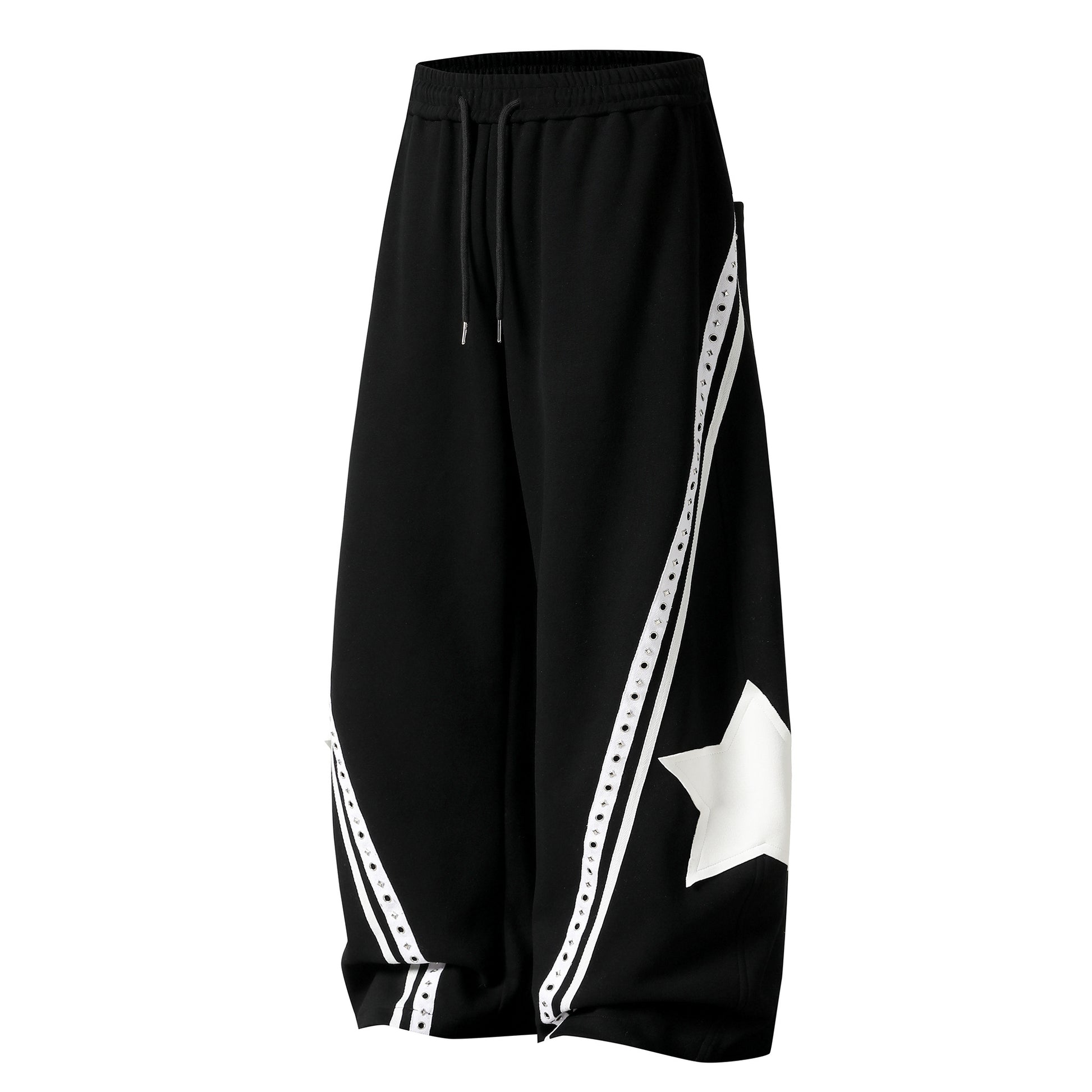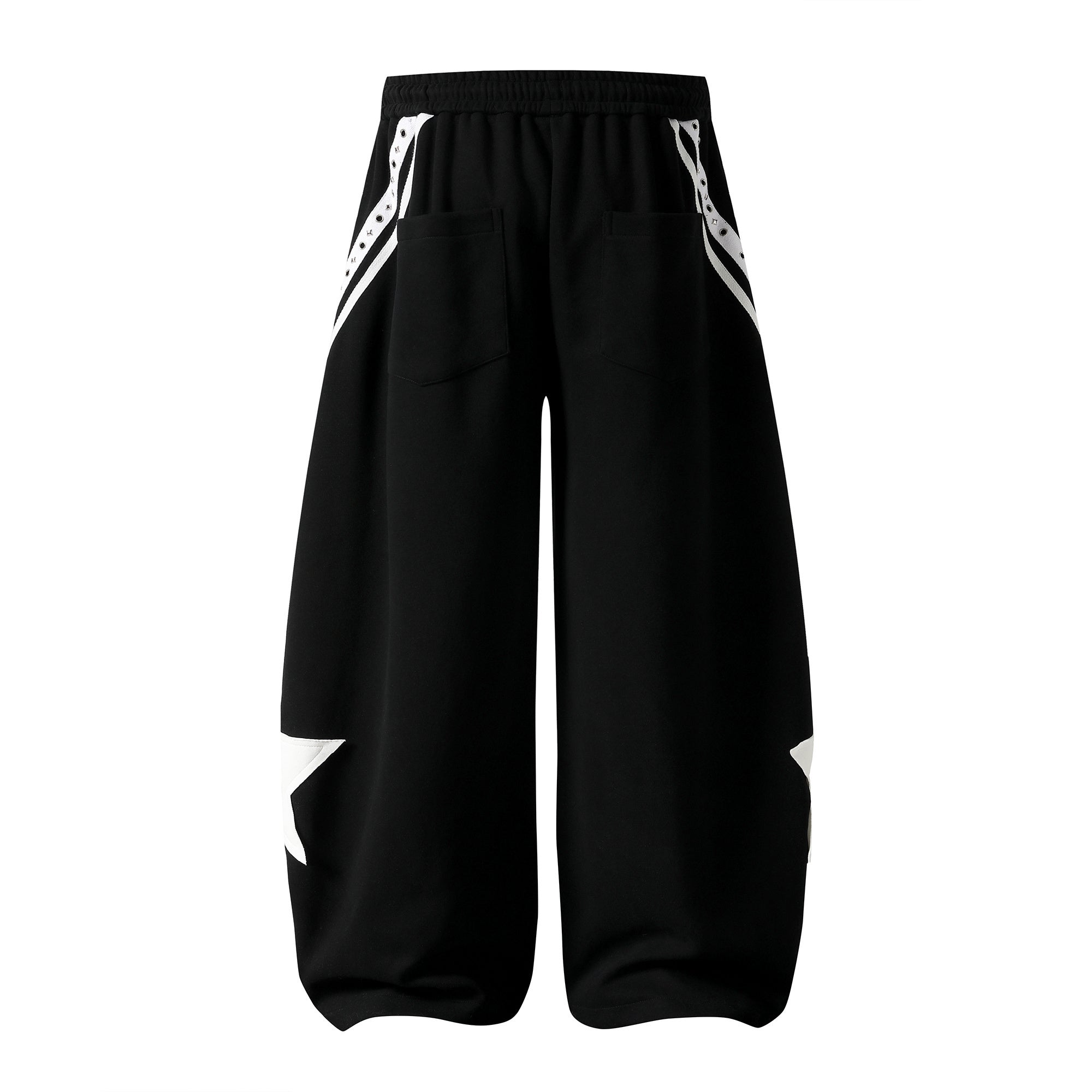 Clothing details: Elastic waistband with adjustable drawstring, star-shaped contrast panel accents, curved stripe detailing with graphic trim, wide-leg relaxed fit, side hand pockets, soft athletic construction.
