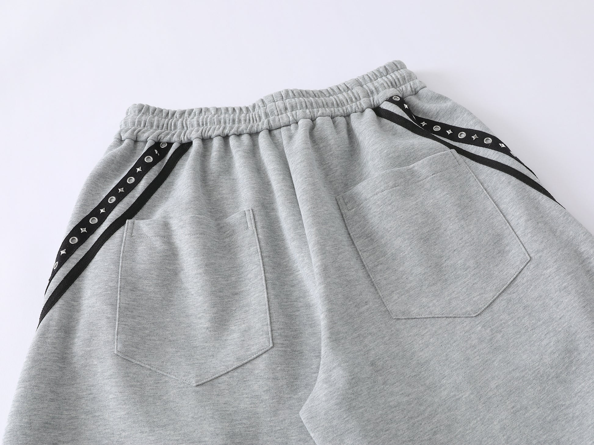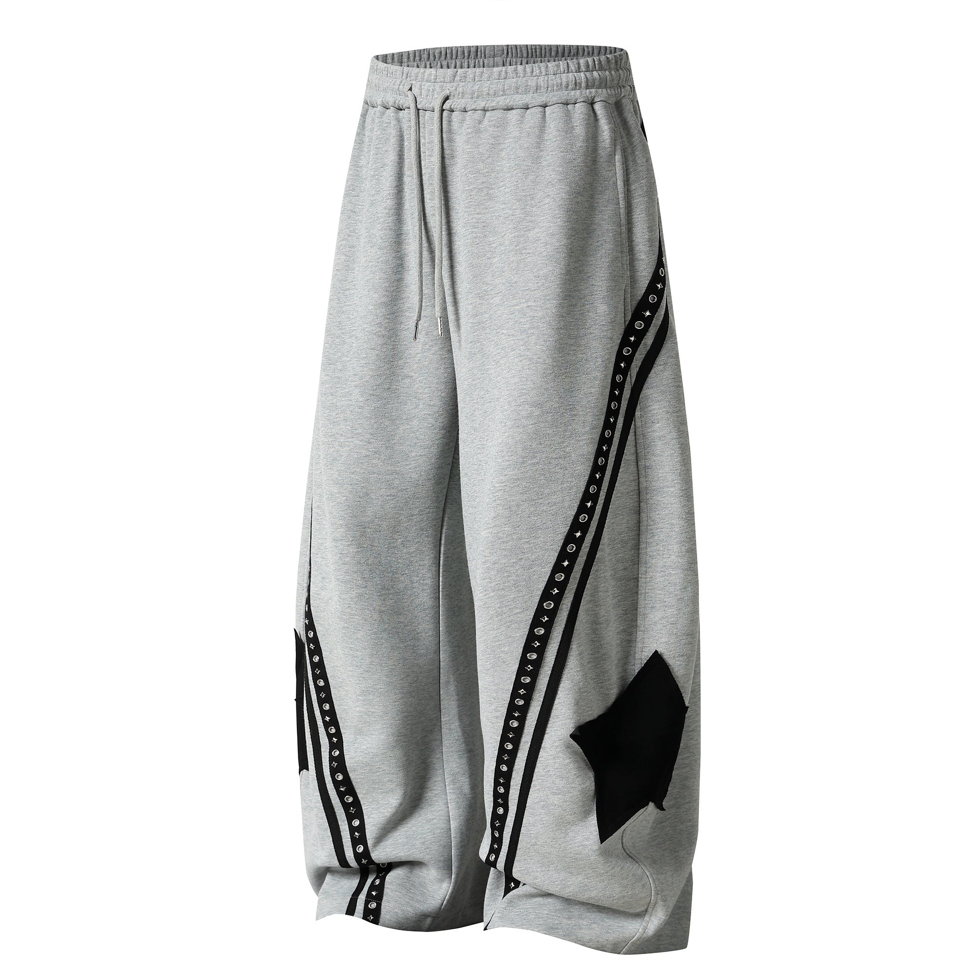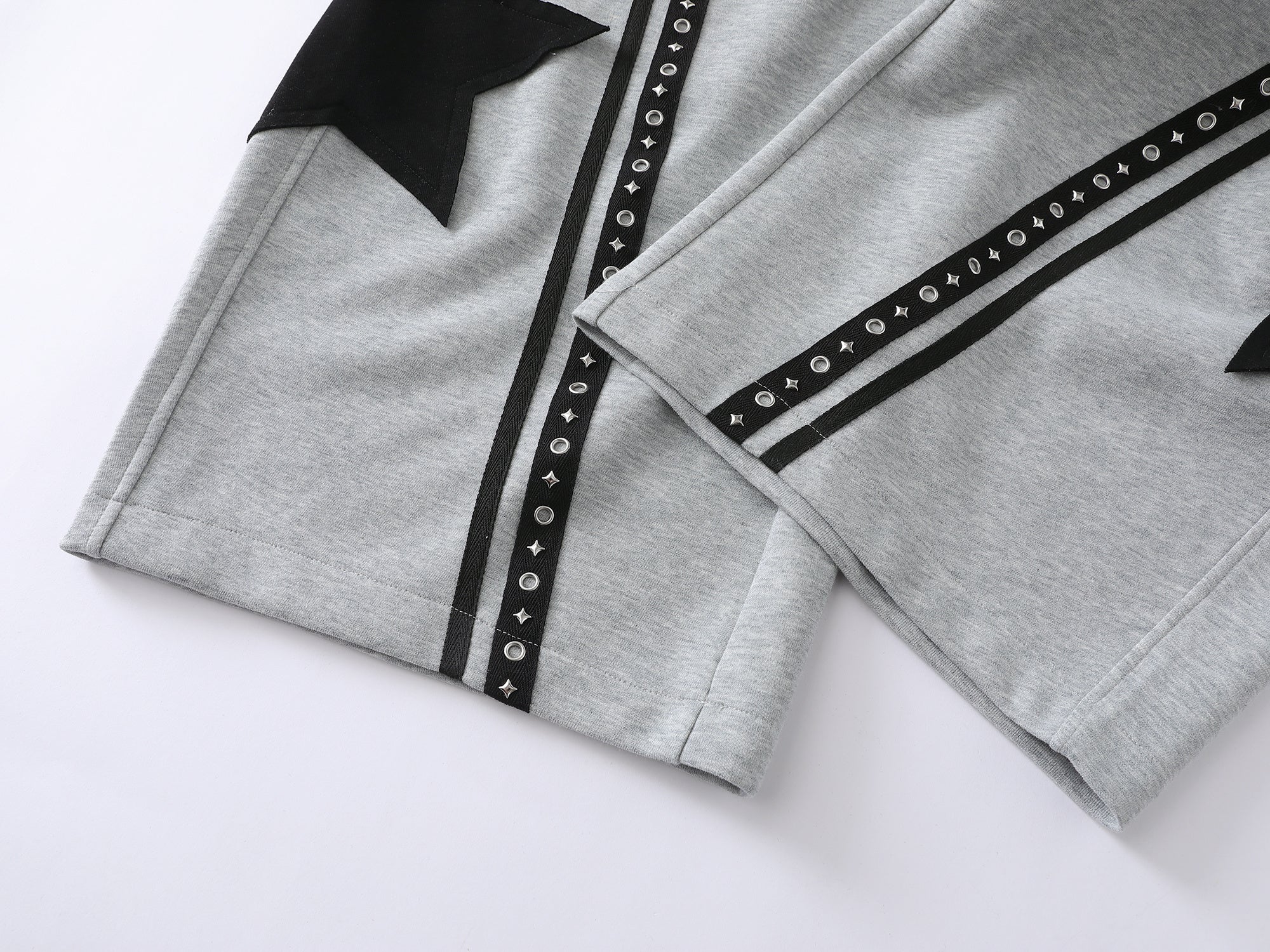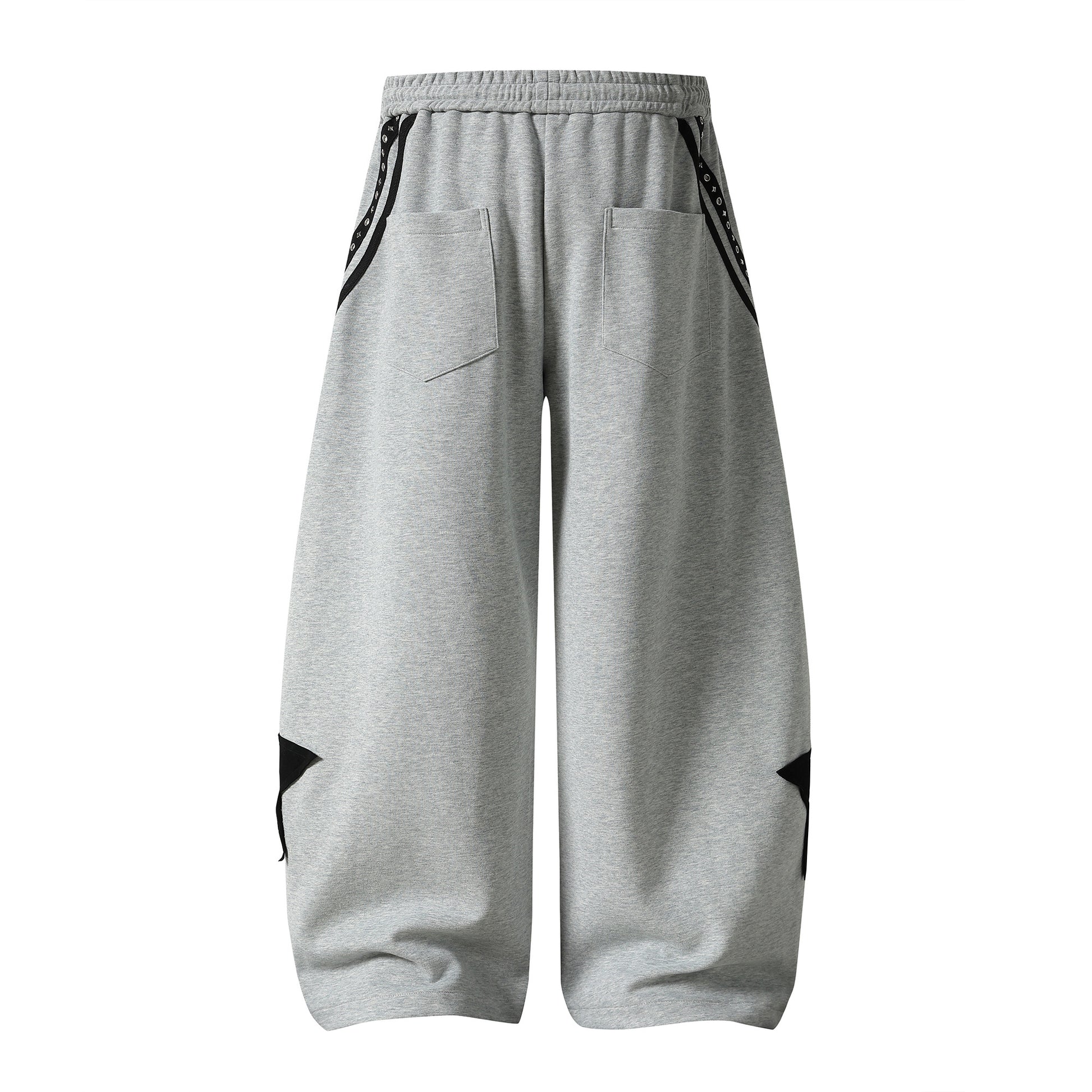 Clothing details: Elastic waistband with adjustable drawstring, star-shaped contrast panel accents, curved stripe detailing with graphic trim, wide-leg relaxed fit, side hand pockets, soft athletic construction.