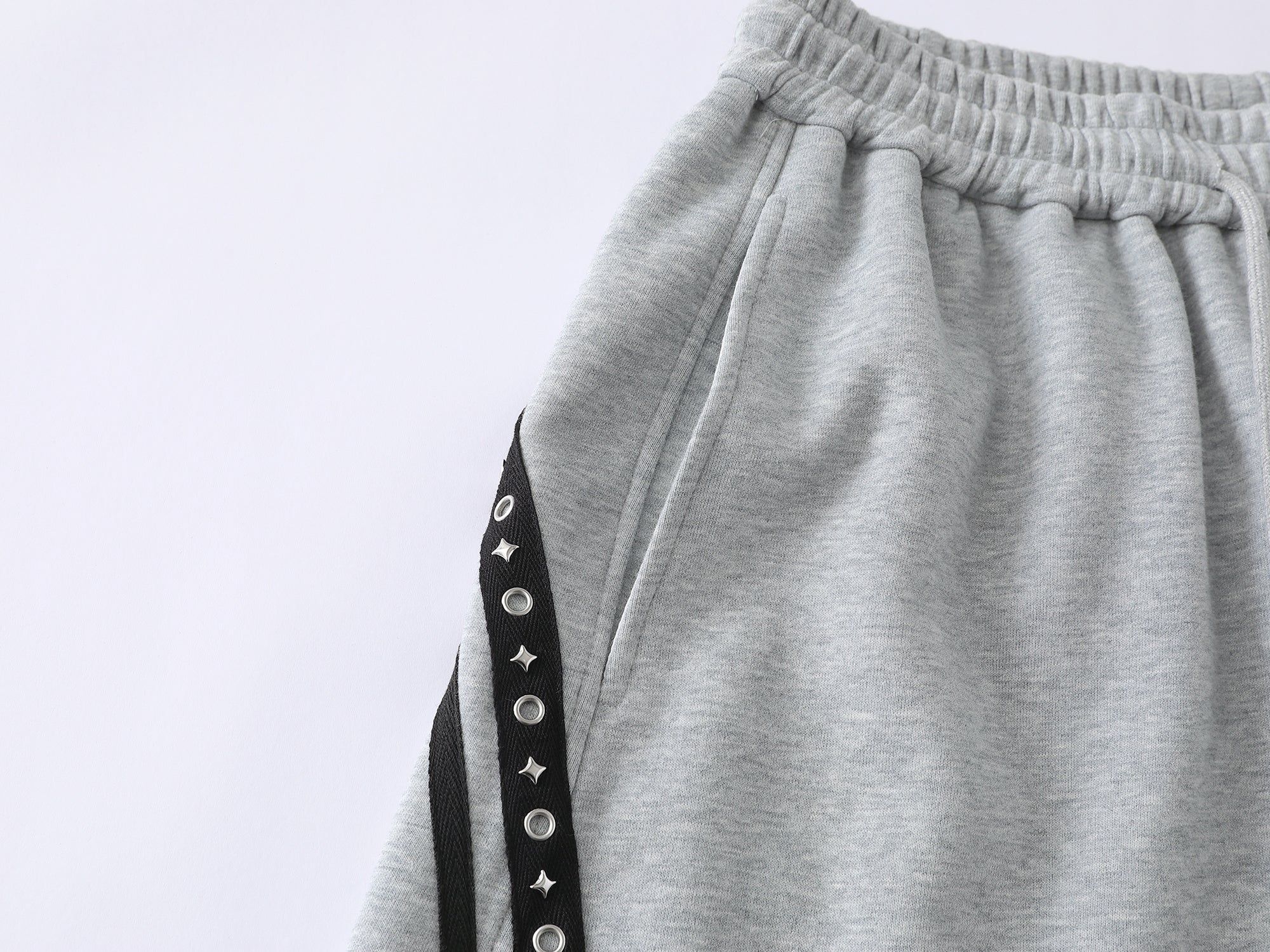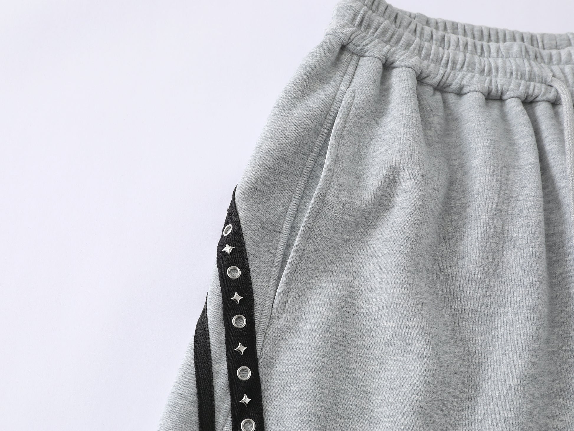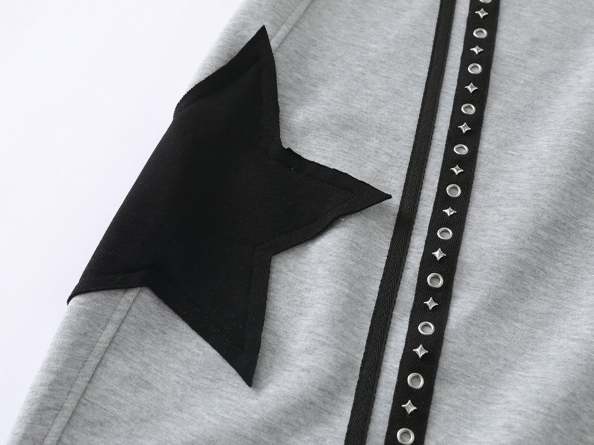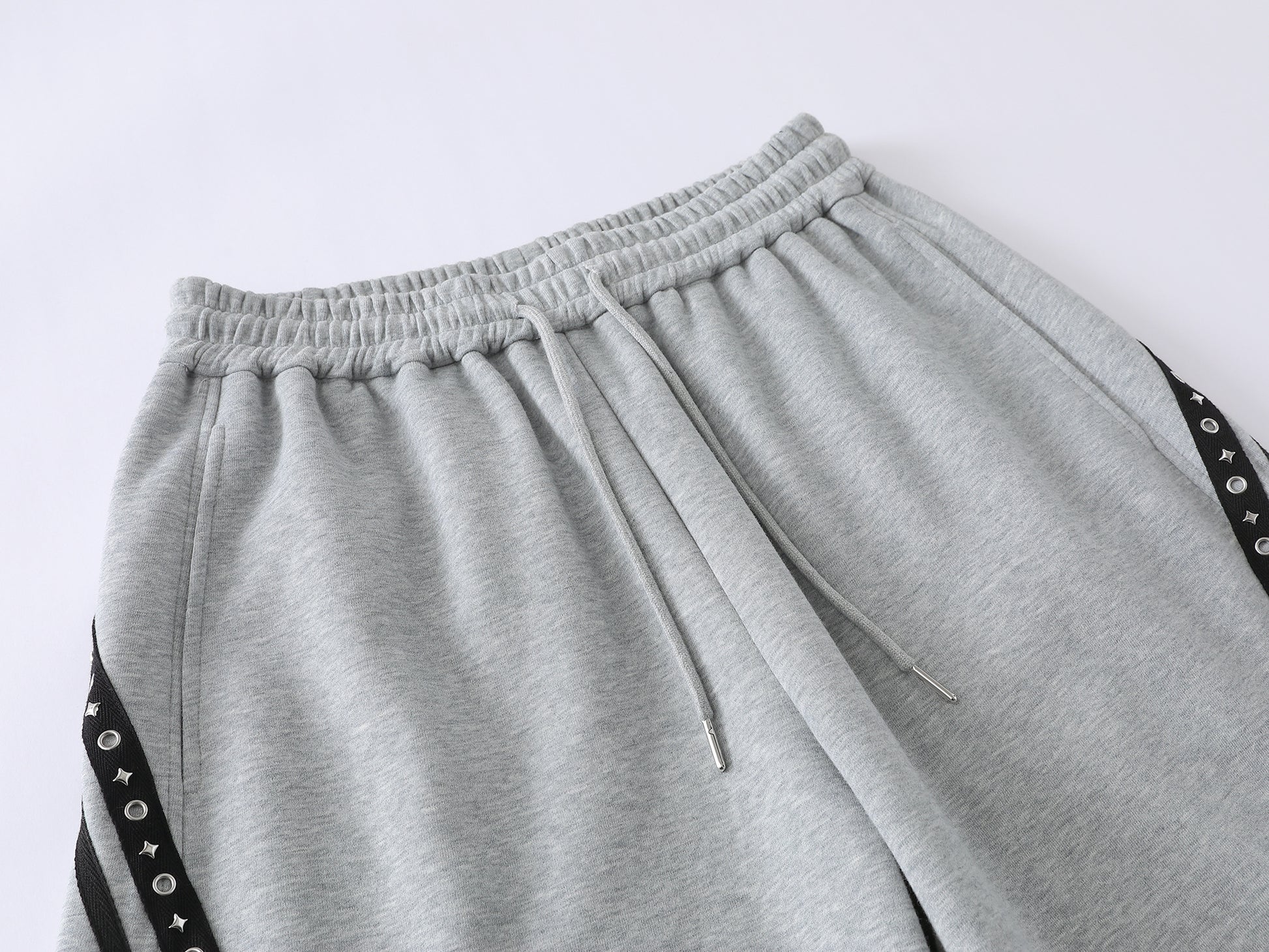 Clothing details: Elastic waistband with adjustable drawstring, star-shaped contrast panel accents, curved stripe detailing with graphic trim, wide-leg relaxed fit, side hand pockets, soft athletic construction.