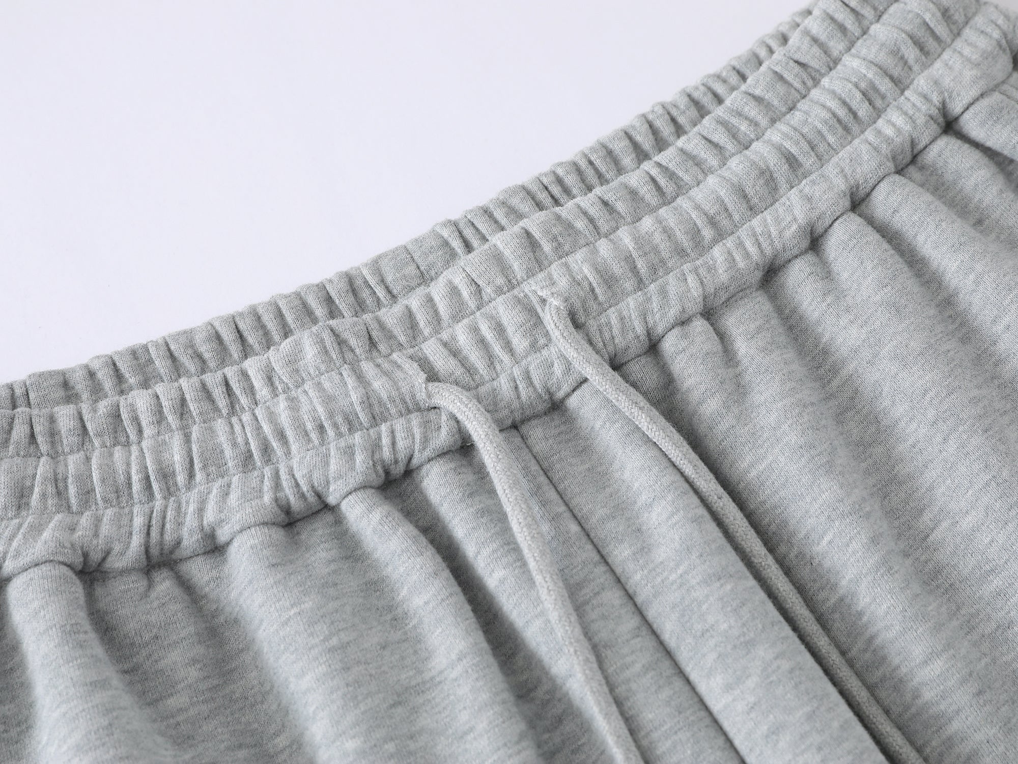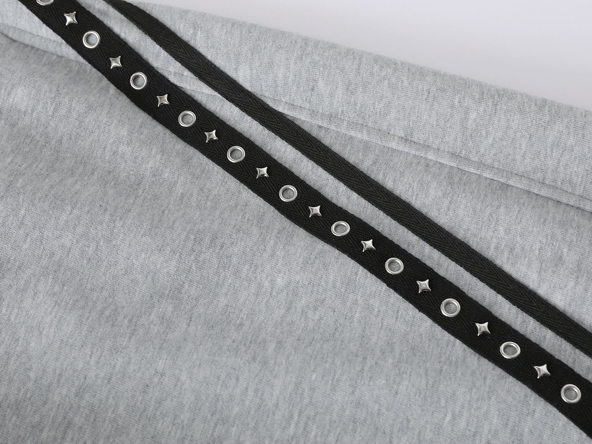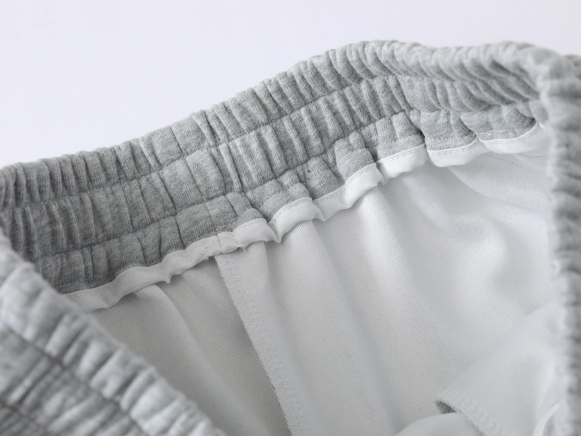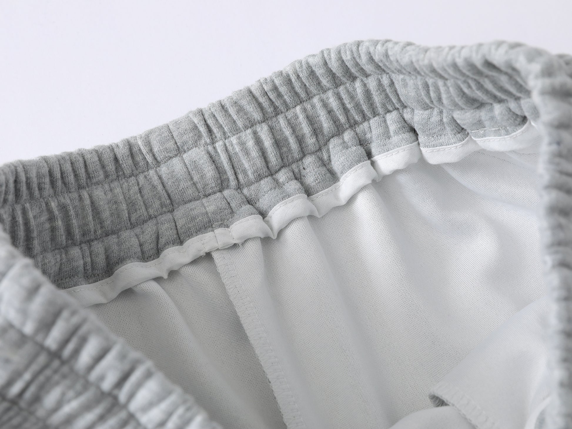 Clothing details: Elastic waistband with adjustable drawstring, star-shaped contrast panel accents, curved stripe detailing with graphic trim, wide-leg relaxed fit, side hand pockets, soft athletic construction.