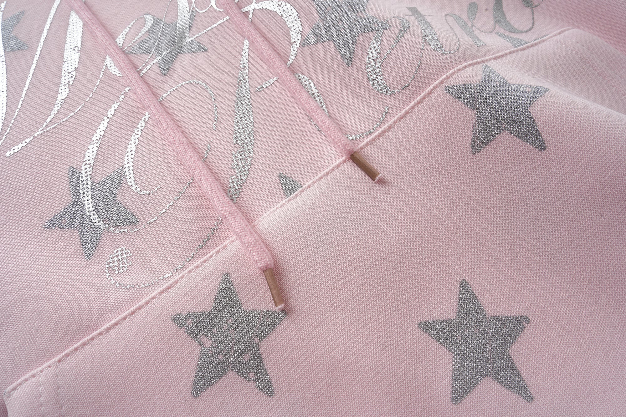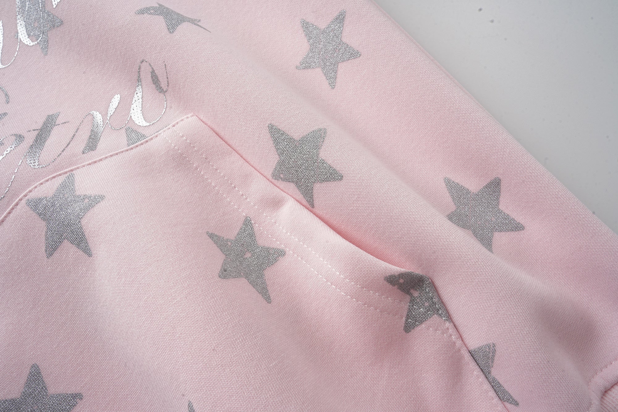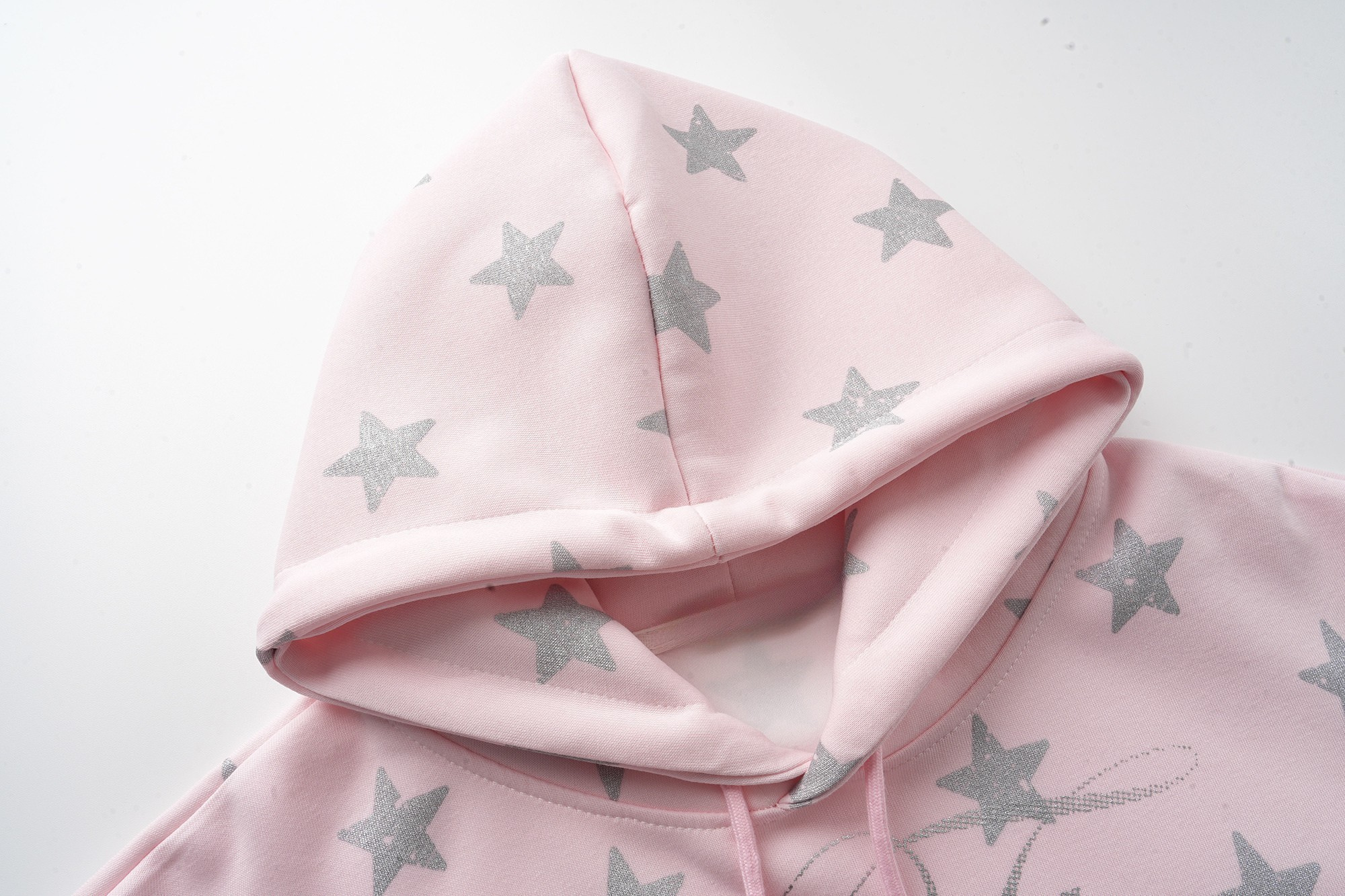 Clothing details: All-over star print, front script graphic, adjustable drawstring hood, ribbed cuffs and hem, kangaroo pocket, relaxed fit silhouette