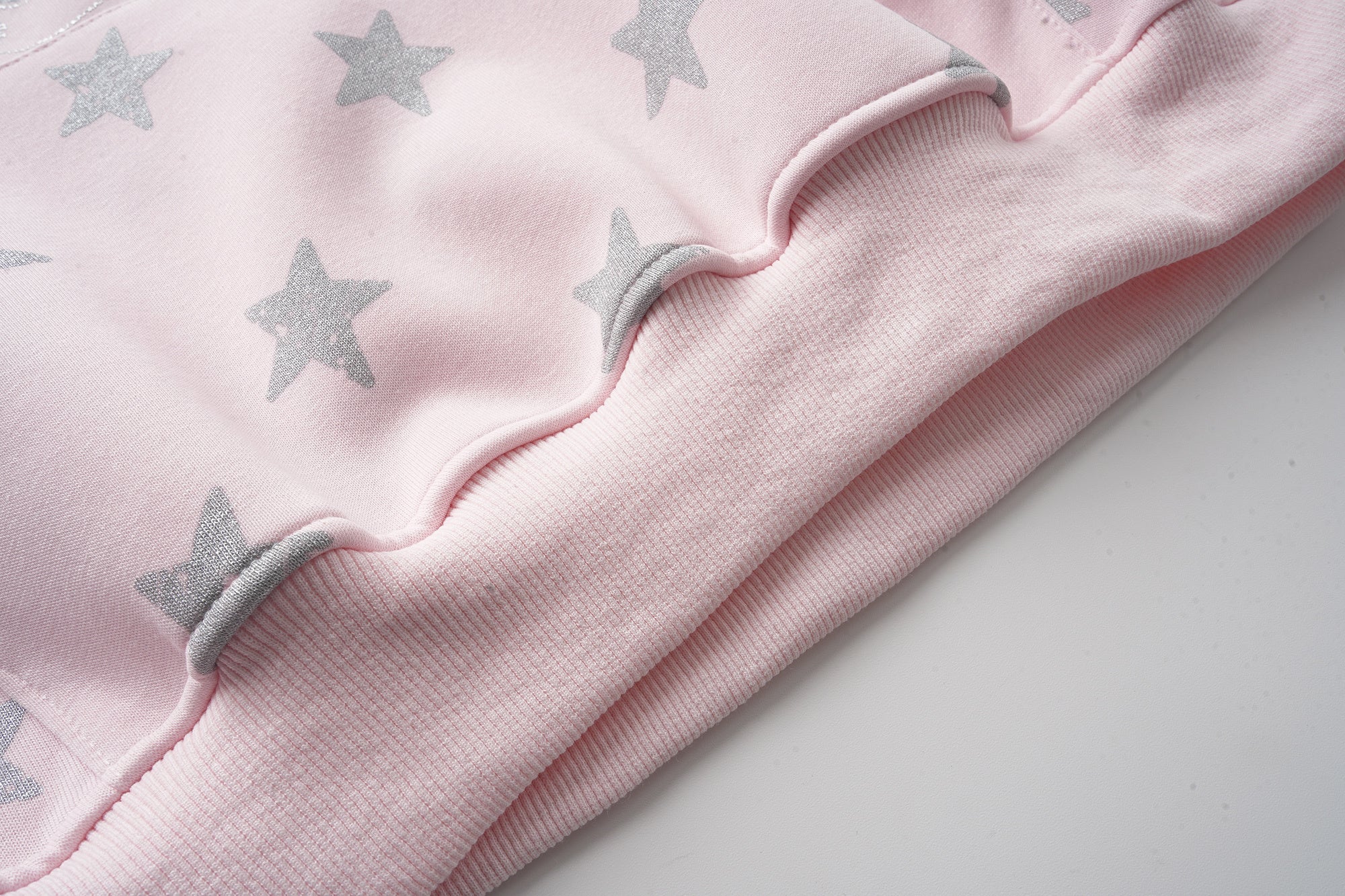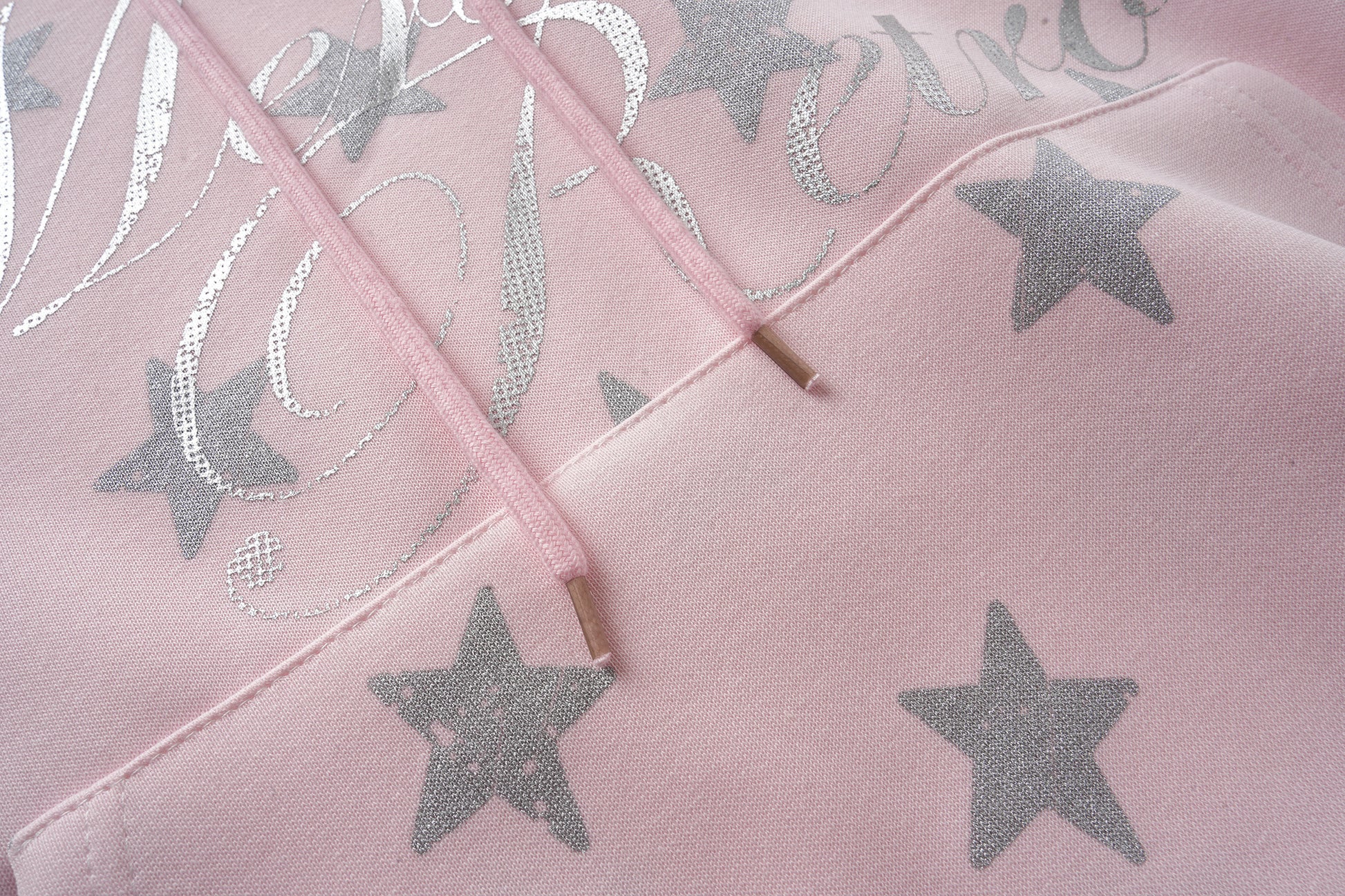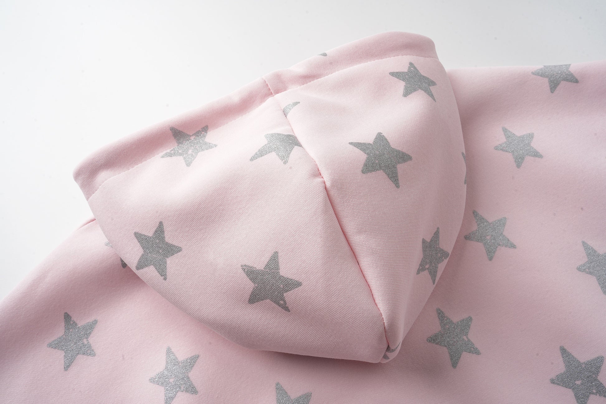 Clothing details: All-over star print, front script graphic, adjustable drawstring hood, ribbed cuffs and hem, kangaroo pocket, relaxed fit silhouette