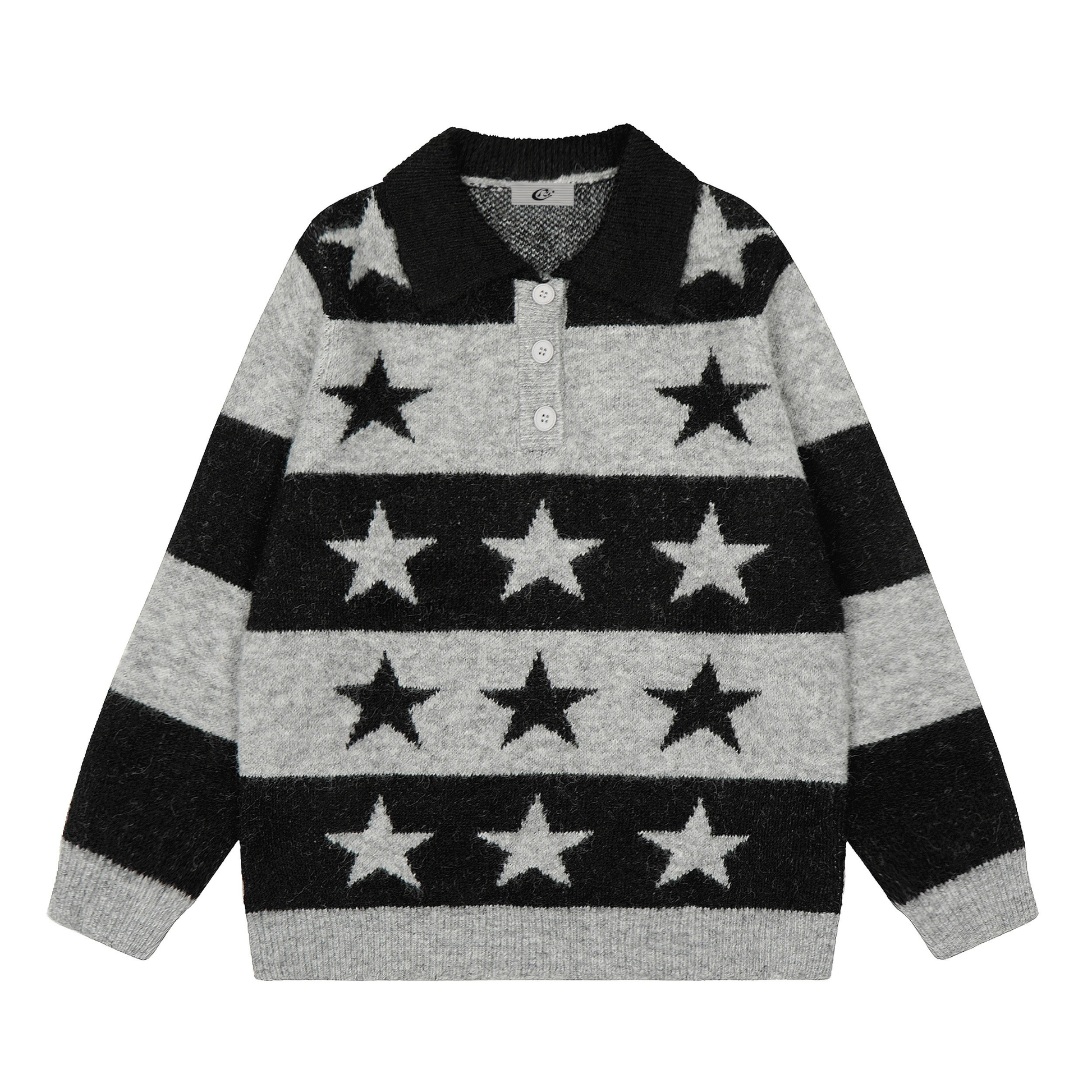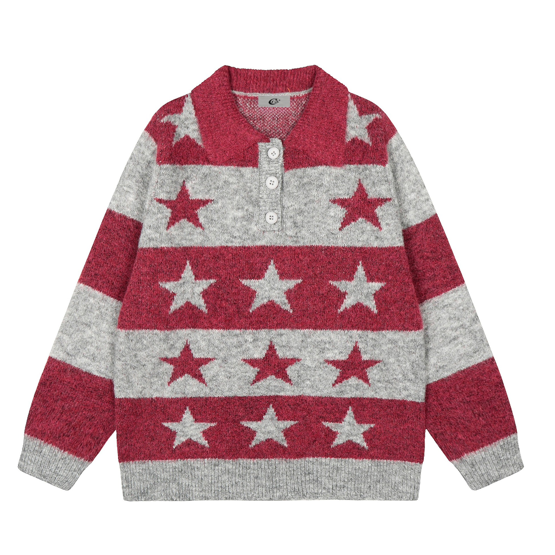 The Omirad Star Stripe Knit Polo Sweater reimagines retro Americana style with a cozy streetwear edge. Featuring bold horizontal stripes and all-over star patterns, it blends playful nostalgia with effortless versatility. The button-up polo collar adds a classic touch, while the soft acrylic knit fabric delivers comfort and warmth for everyday layering. Available in two colorways — red/grey and black/grey — to match your individual vibe.