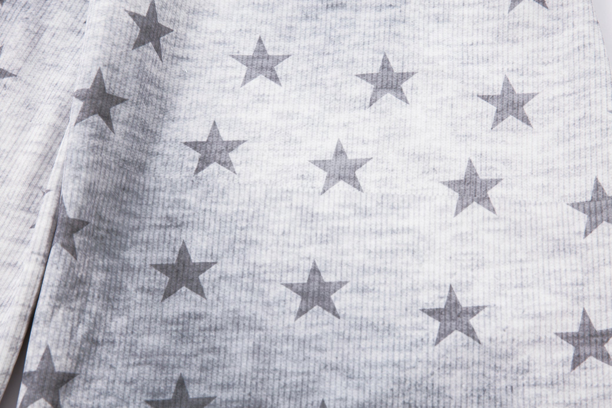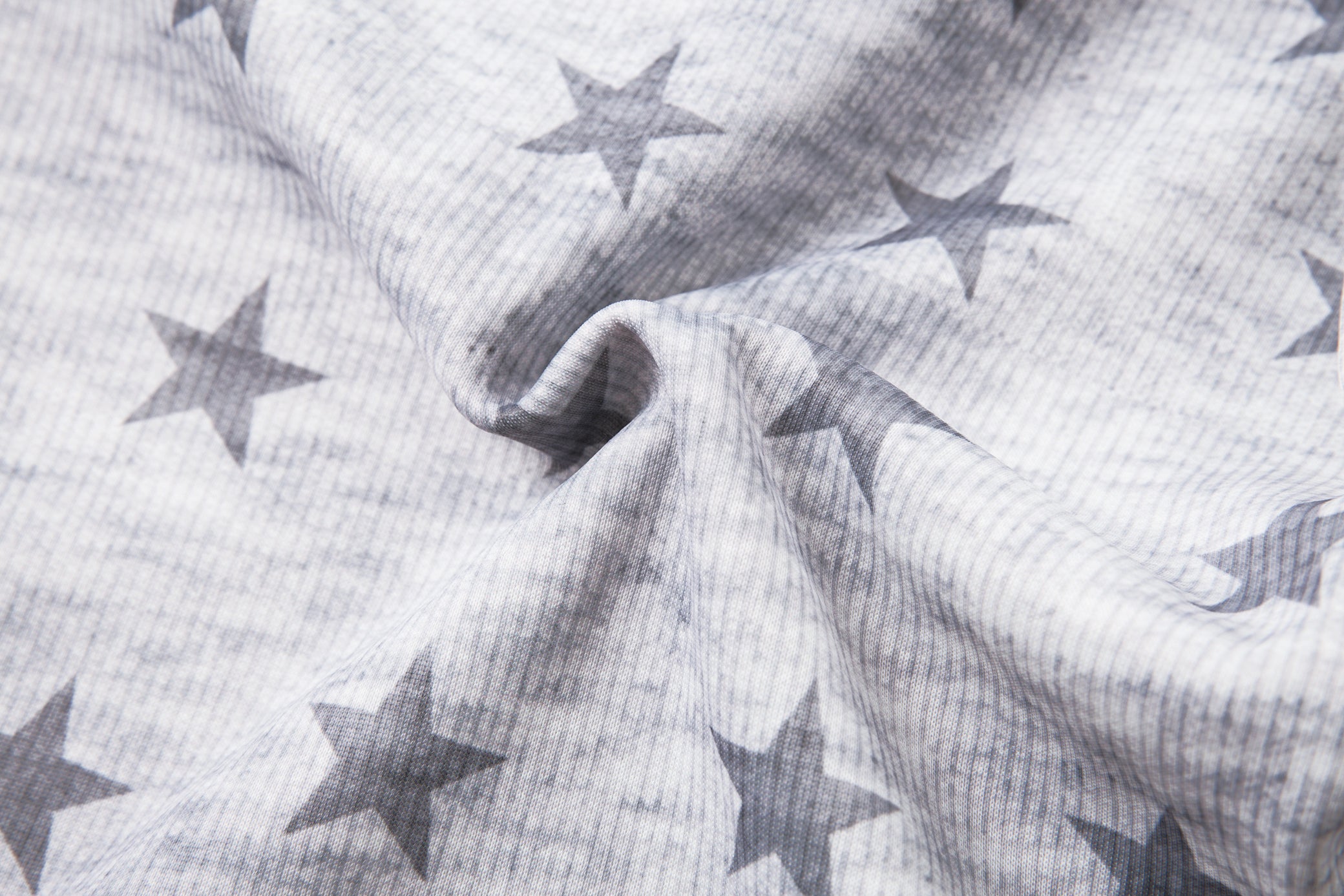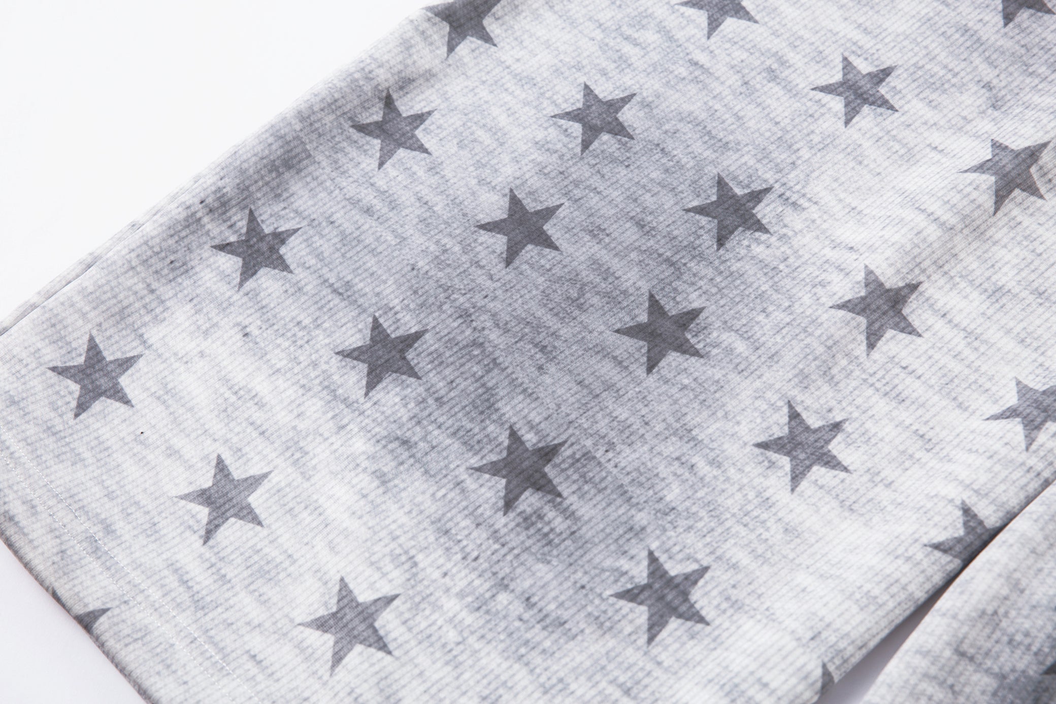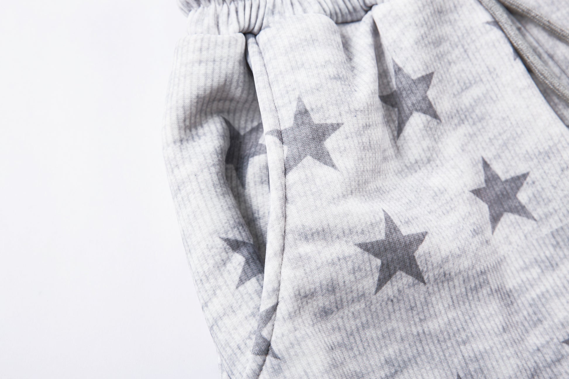Clothing details: Star print, dual contrast stripes, wide-leg fit, elastic waistband