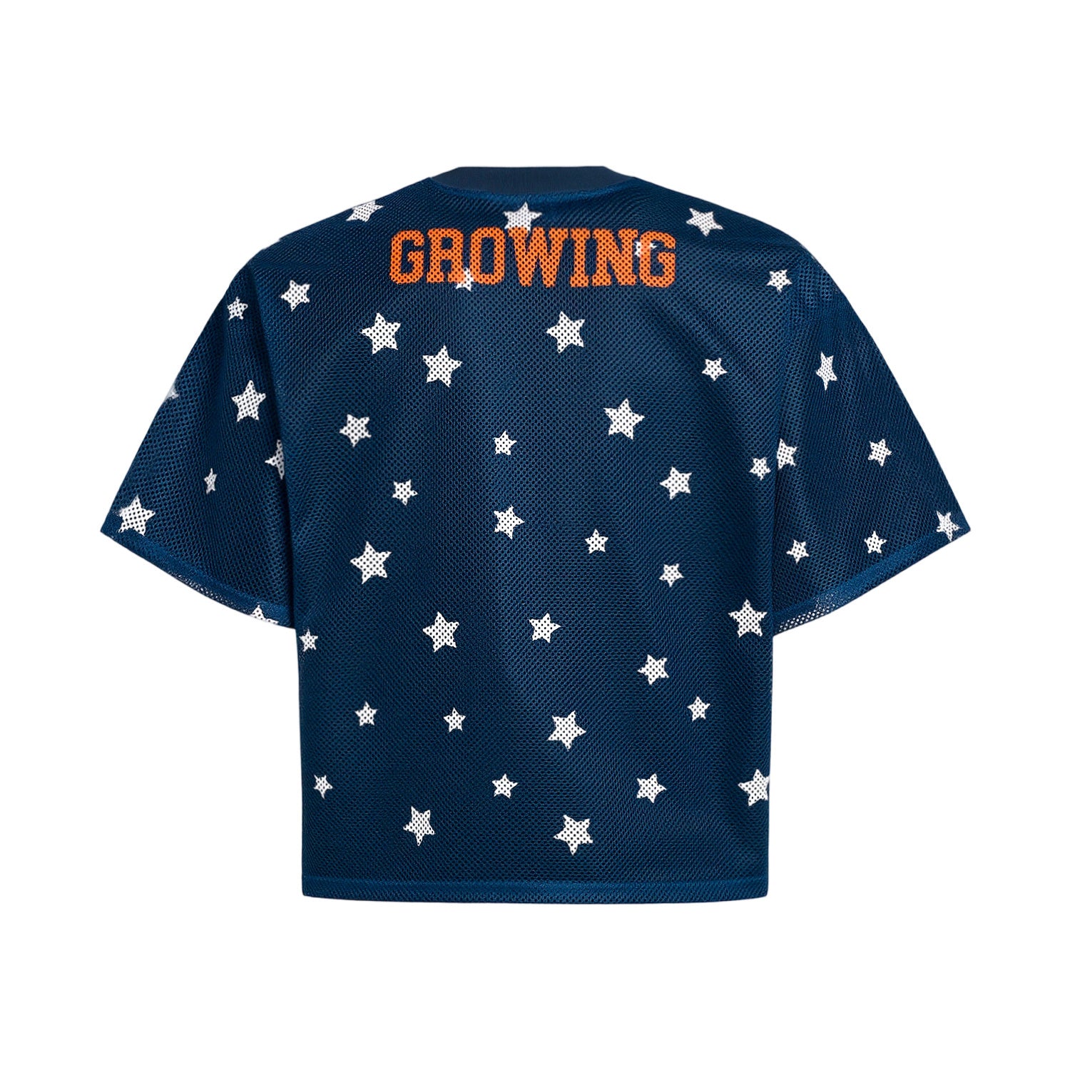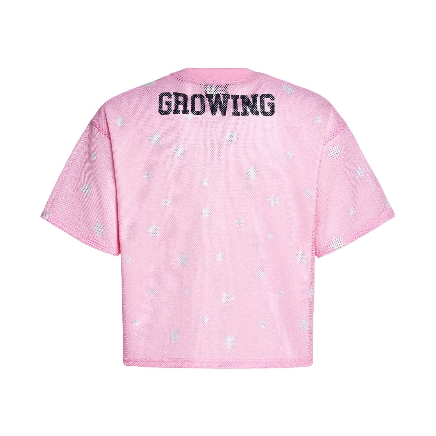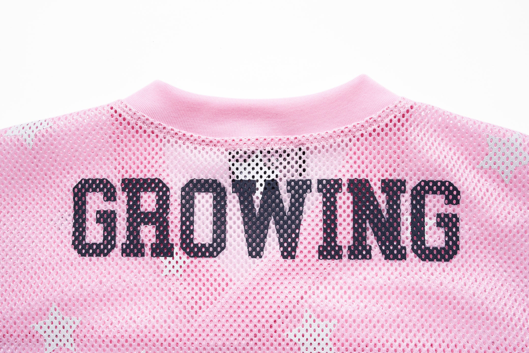 Clothing details: Breathable athletic mesh fabric, relaxed oversized fit, all-over star print, bold varsity-style number graphic, “GROWING” back lettering, ribbed crew neckline, lightweight sports-inspired structure.