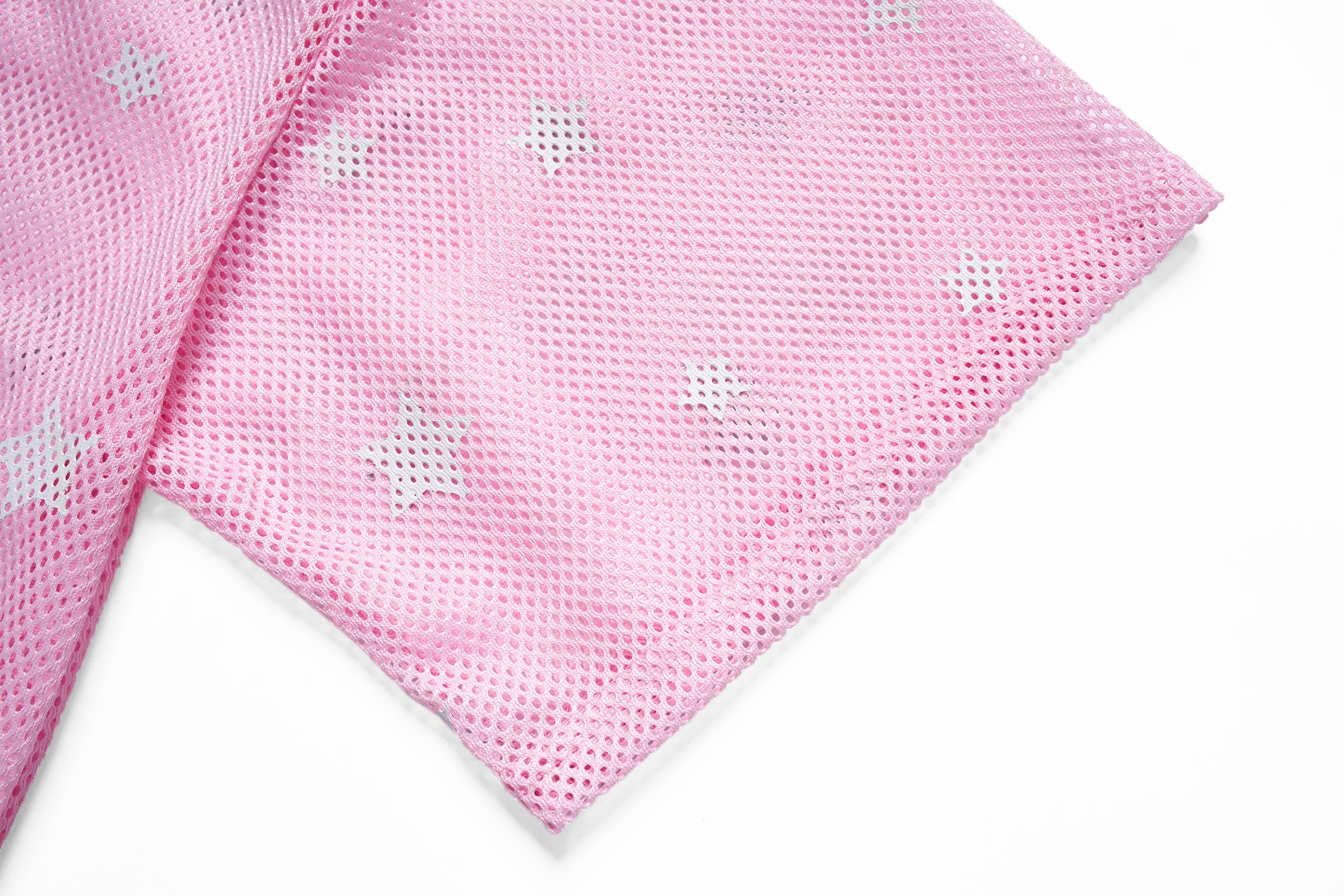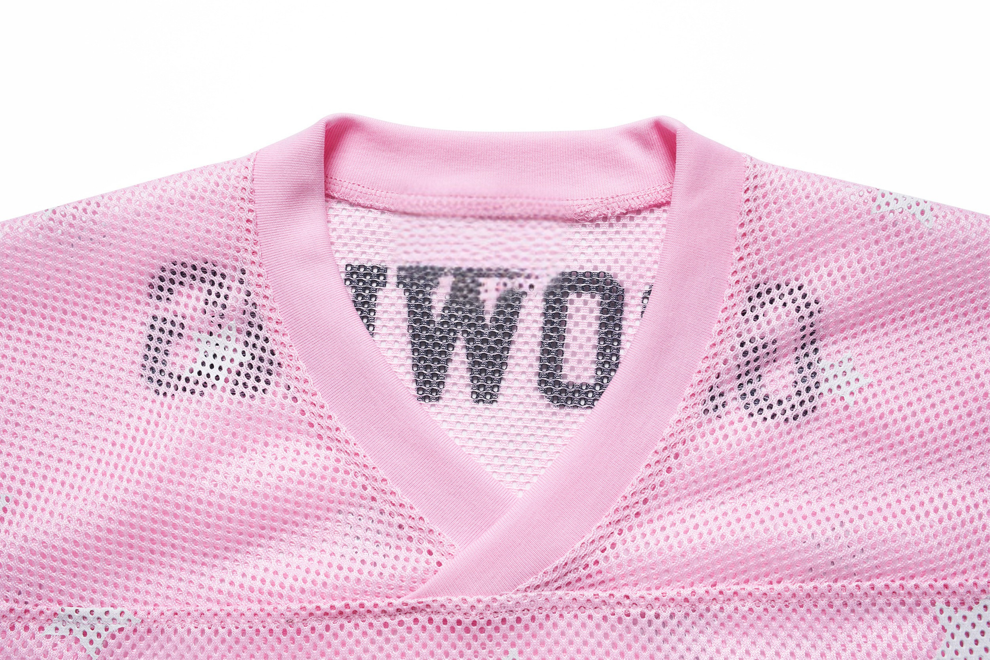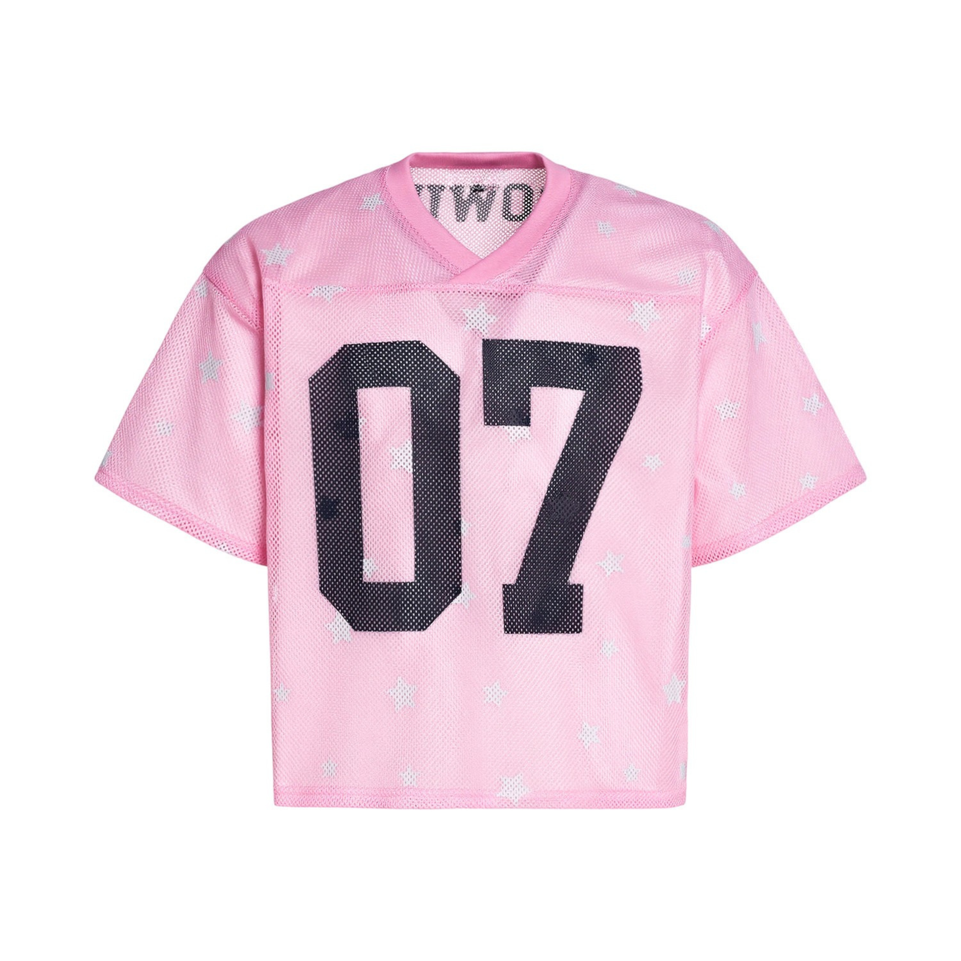 Clothing details: Breathable athletic mesh fabric, relaxed oversized fit, all-over star print, bold varsity-style number graphic, “GROWING” back lettering, ribbed crew neckline, lightweight sports-inspired structure.