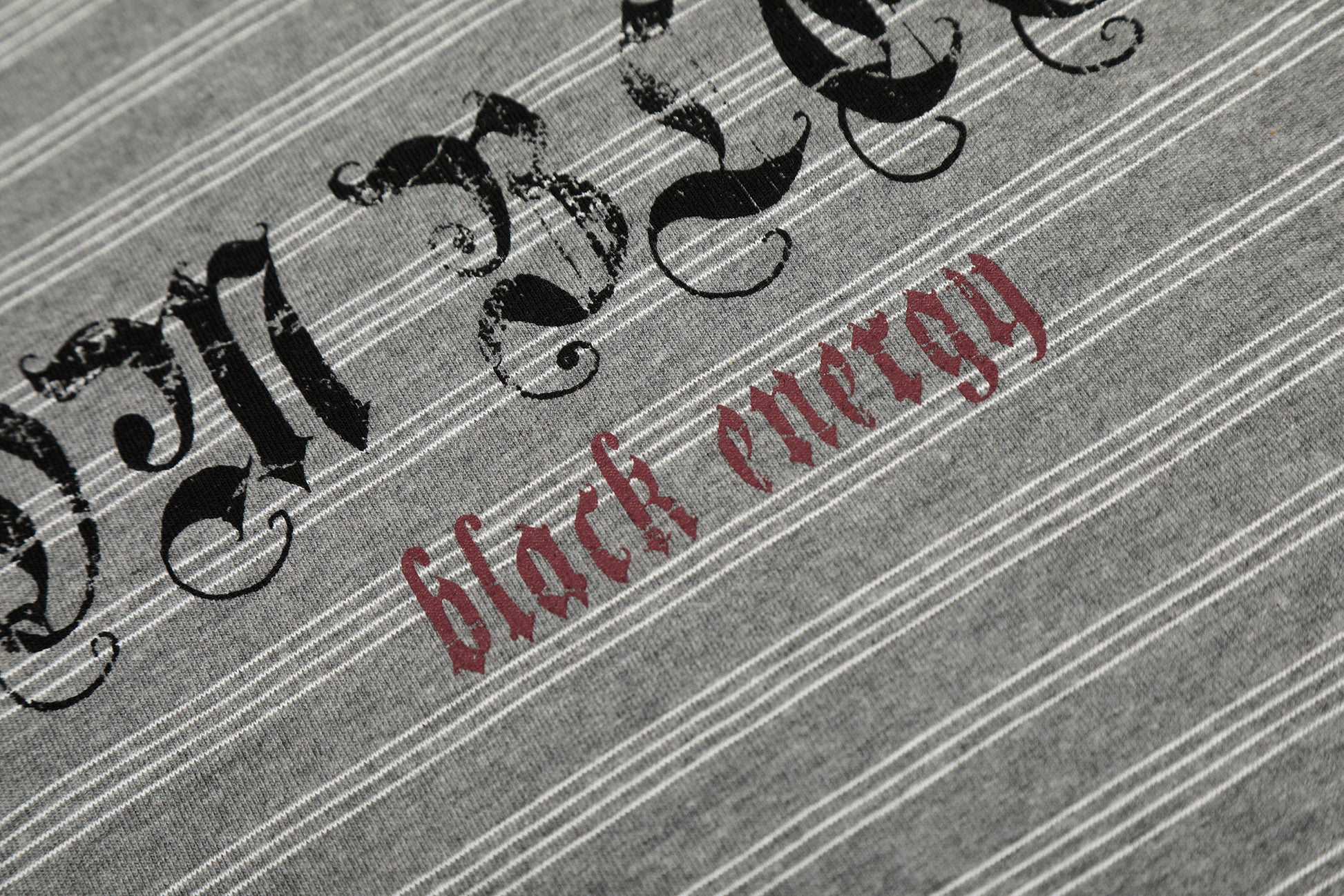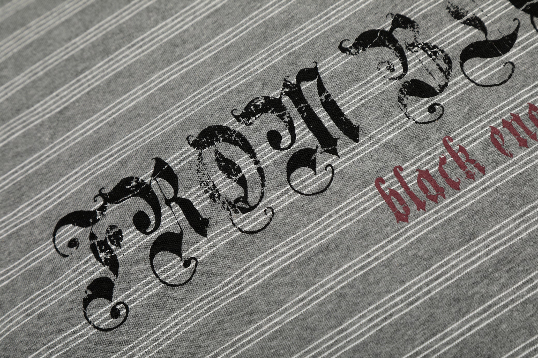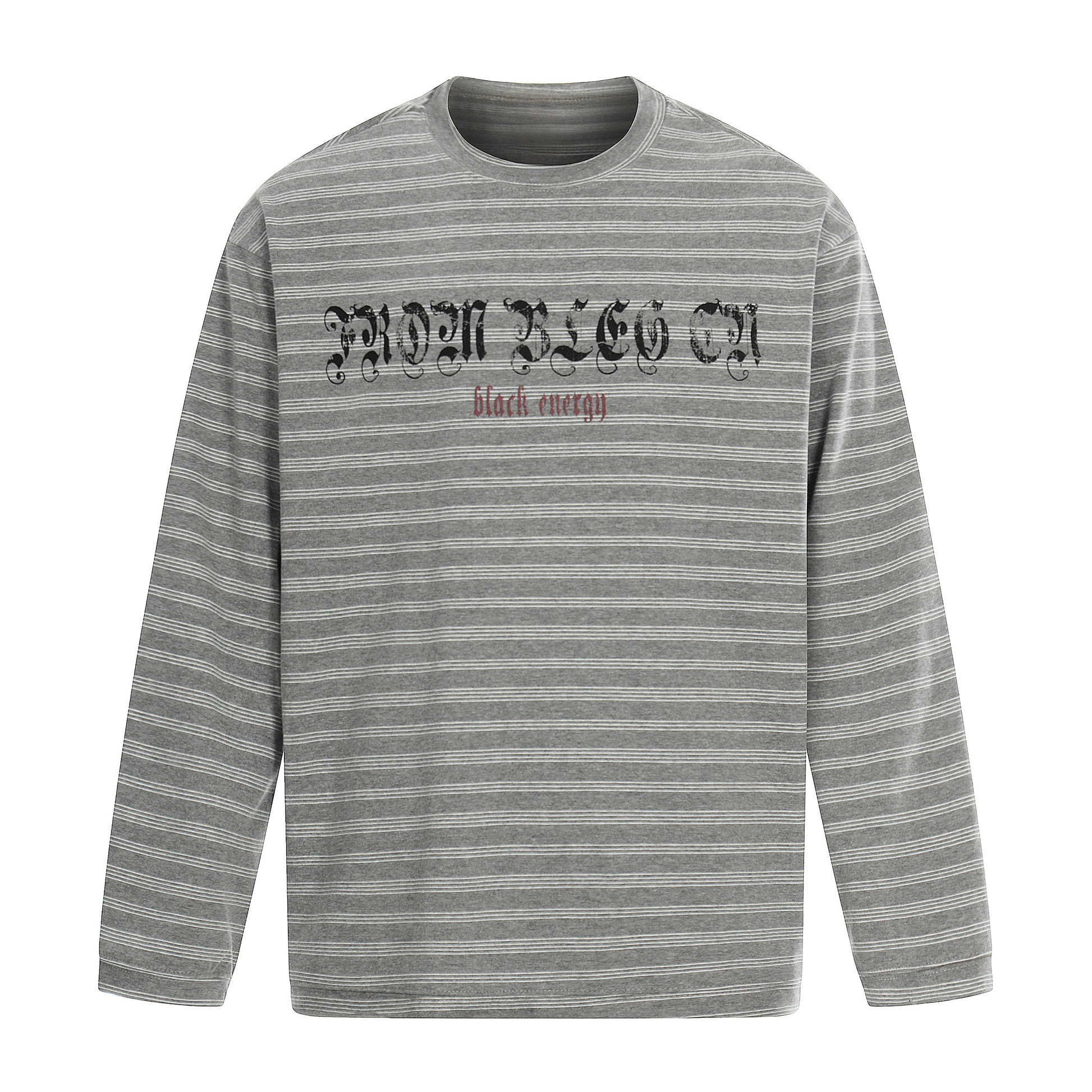 Clothing details: All-over horizontal stripe pattern, gothic-style front logo print, classic crew neckline, long sleeves, straight hem, relaxed fit.
