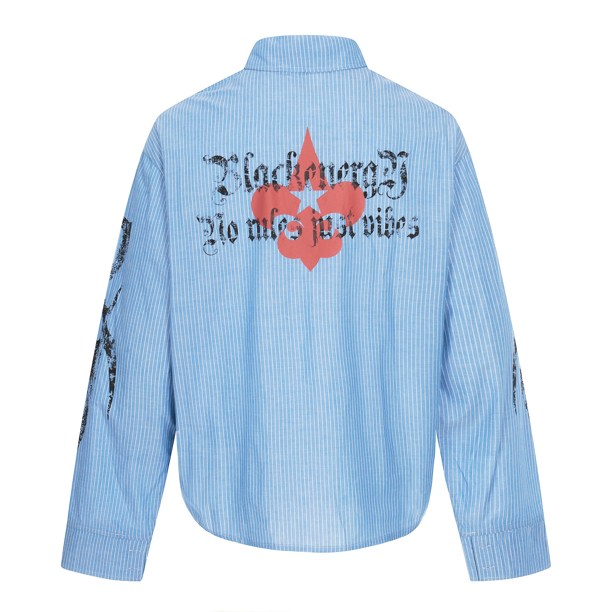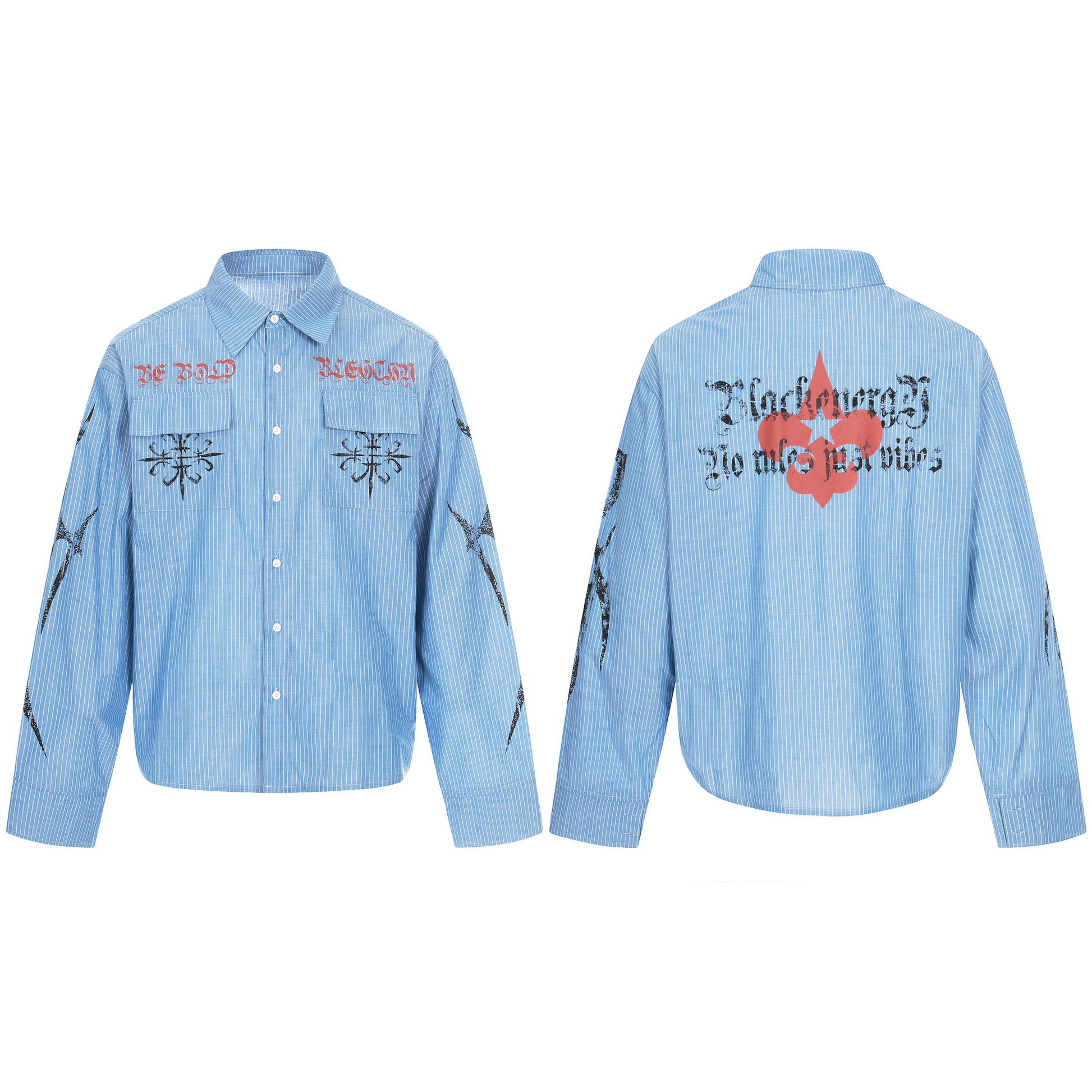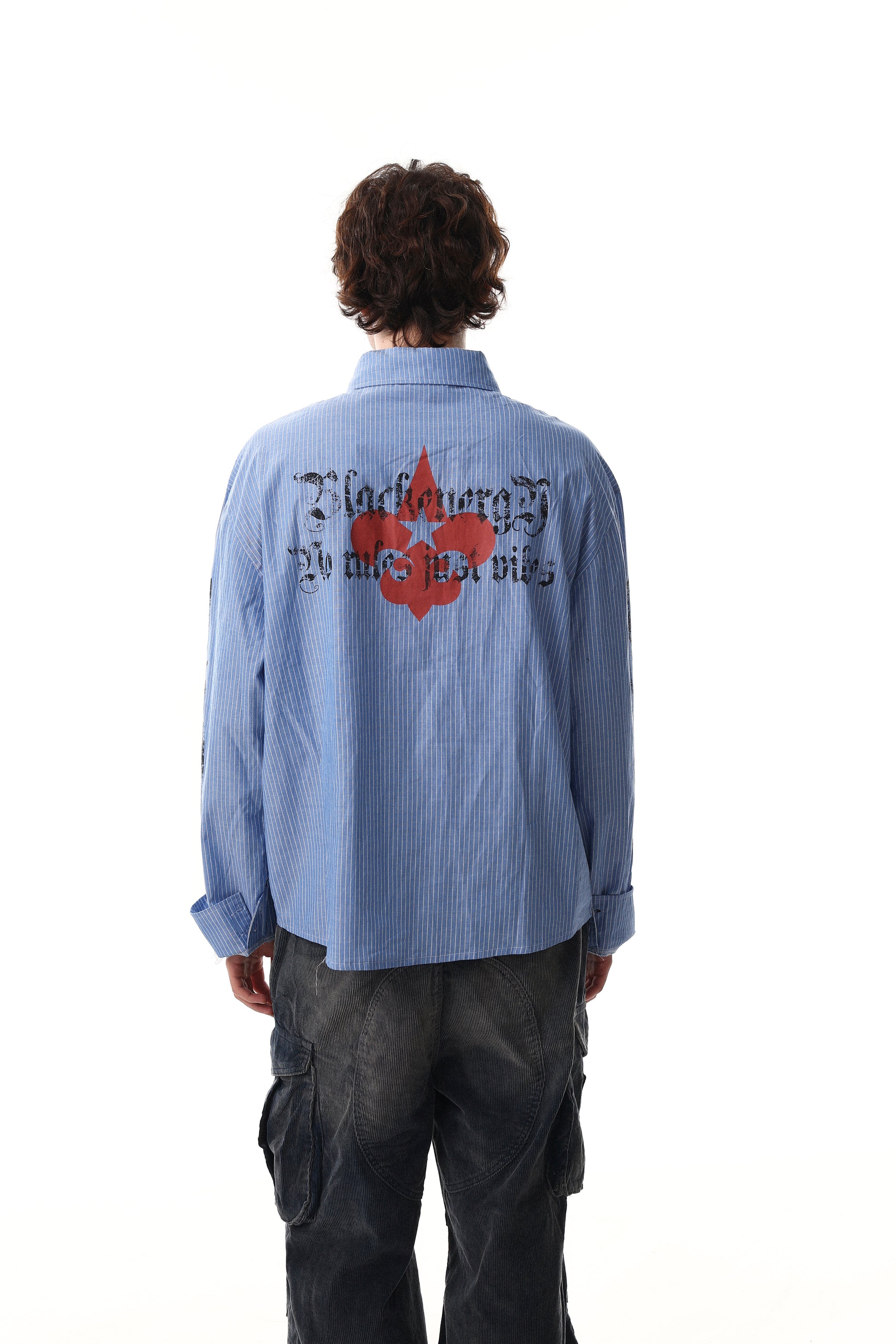 Clothing details: Button-up front closure, vertical stripe pattern, chest pocket detailing, front and back graphic prints, long sleeves with button cuffs, relaxed fit.