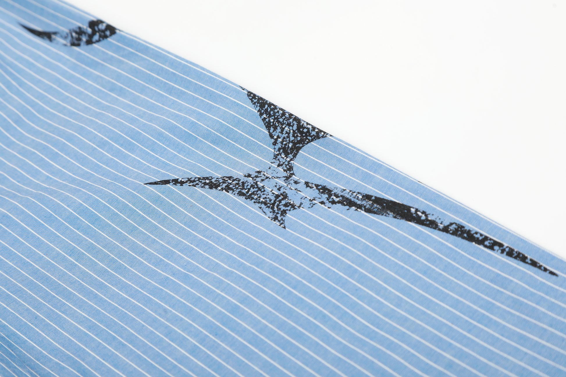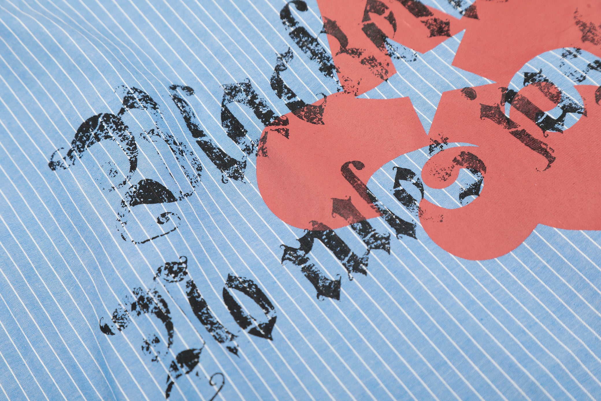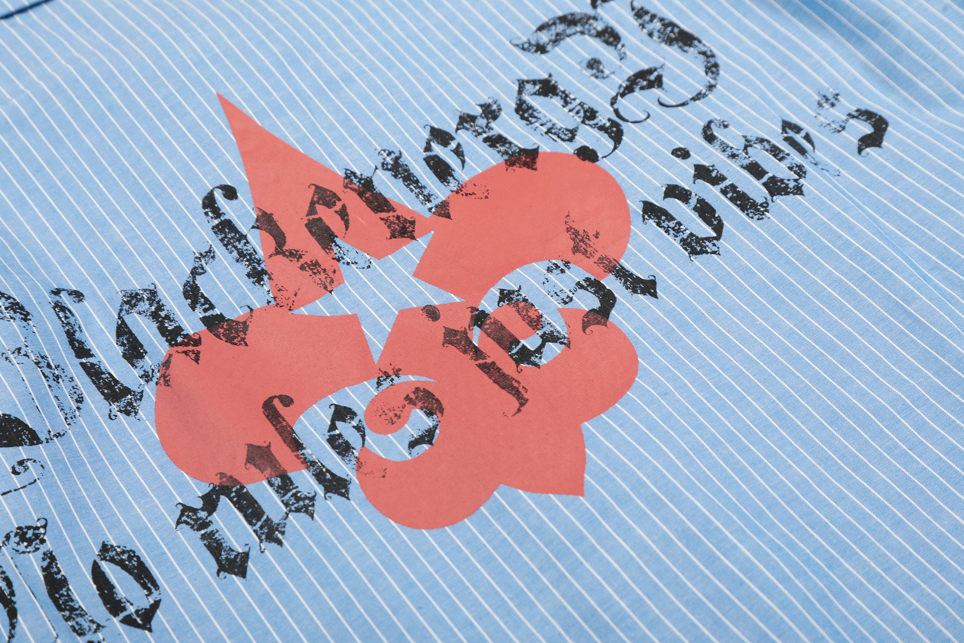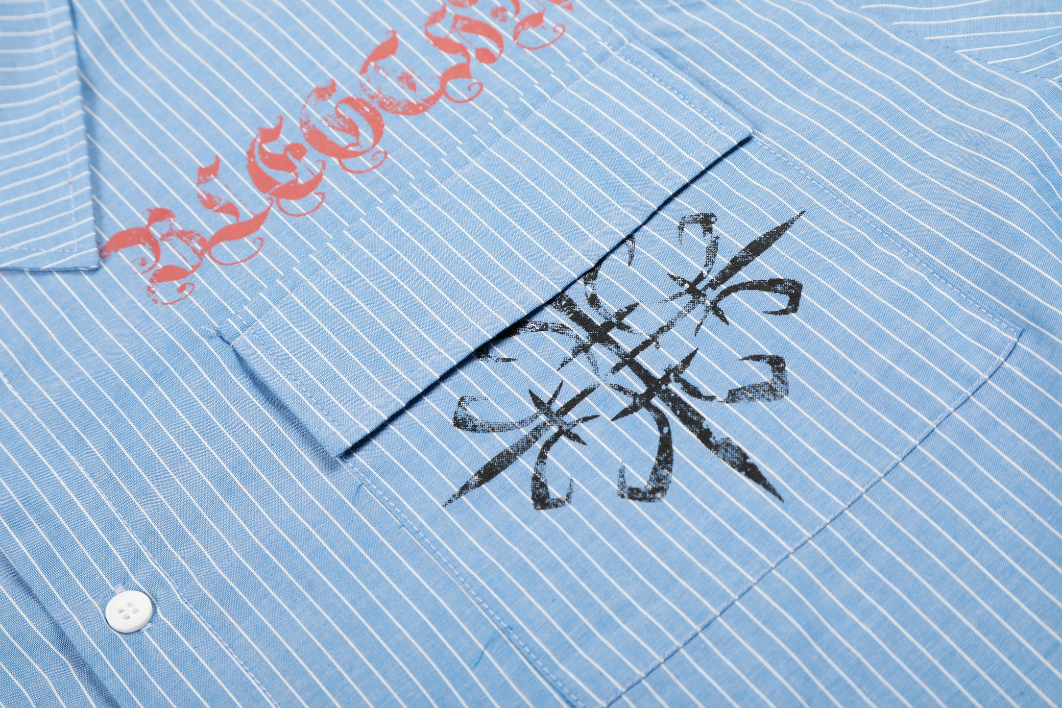 Clothing details: Button-up front closure, vertical stripe pattern, chest pocket detailing, front and back graphic prints, long sleeves with button cuffs, relaxed fit.