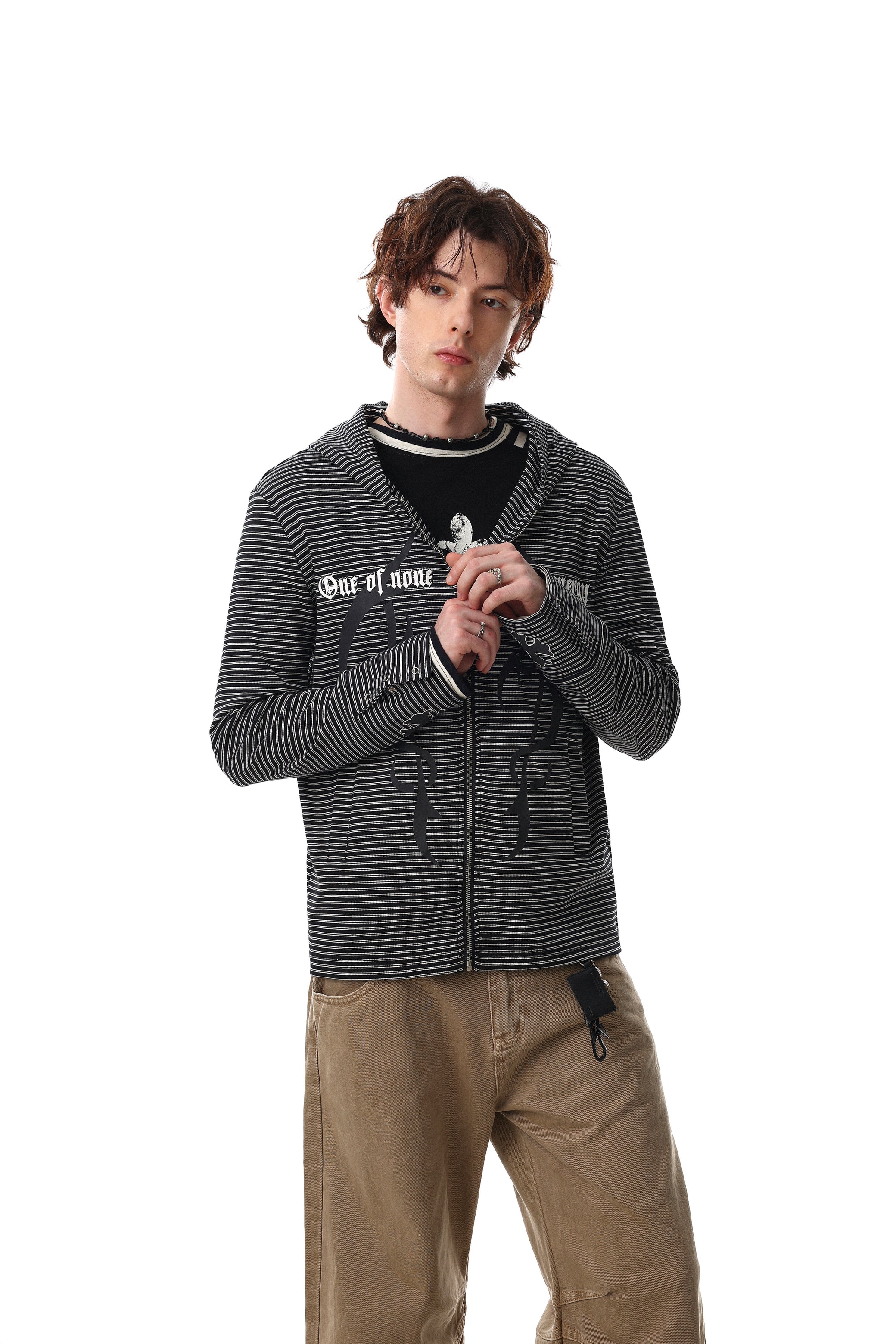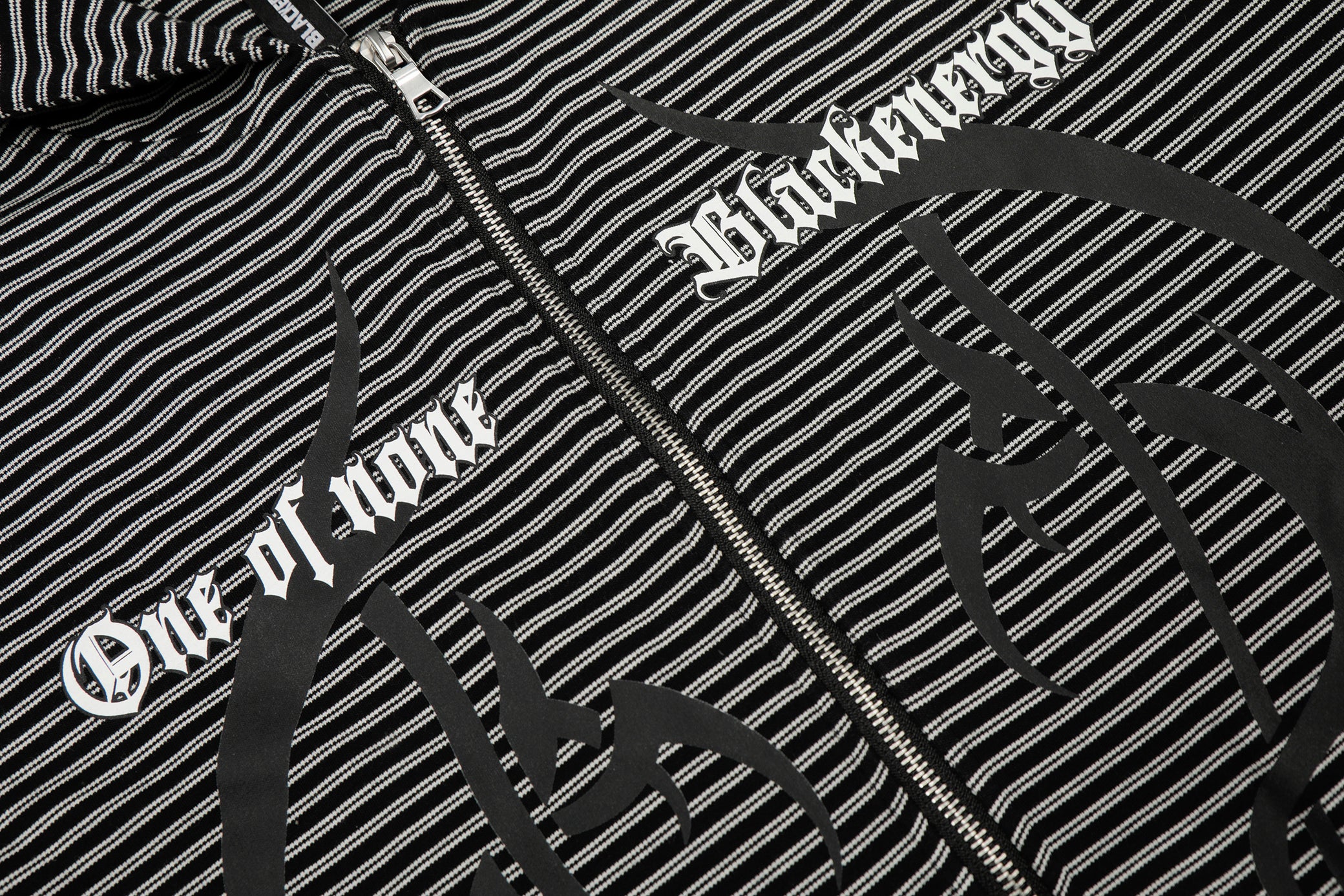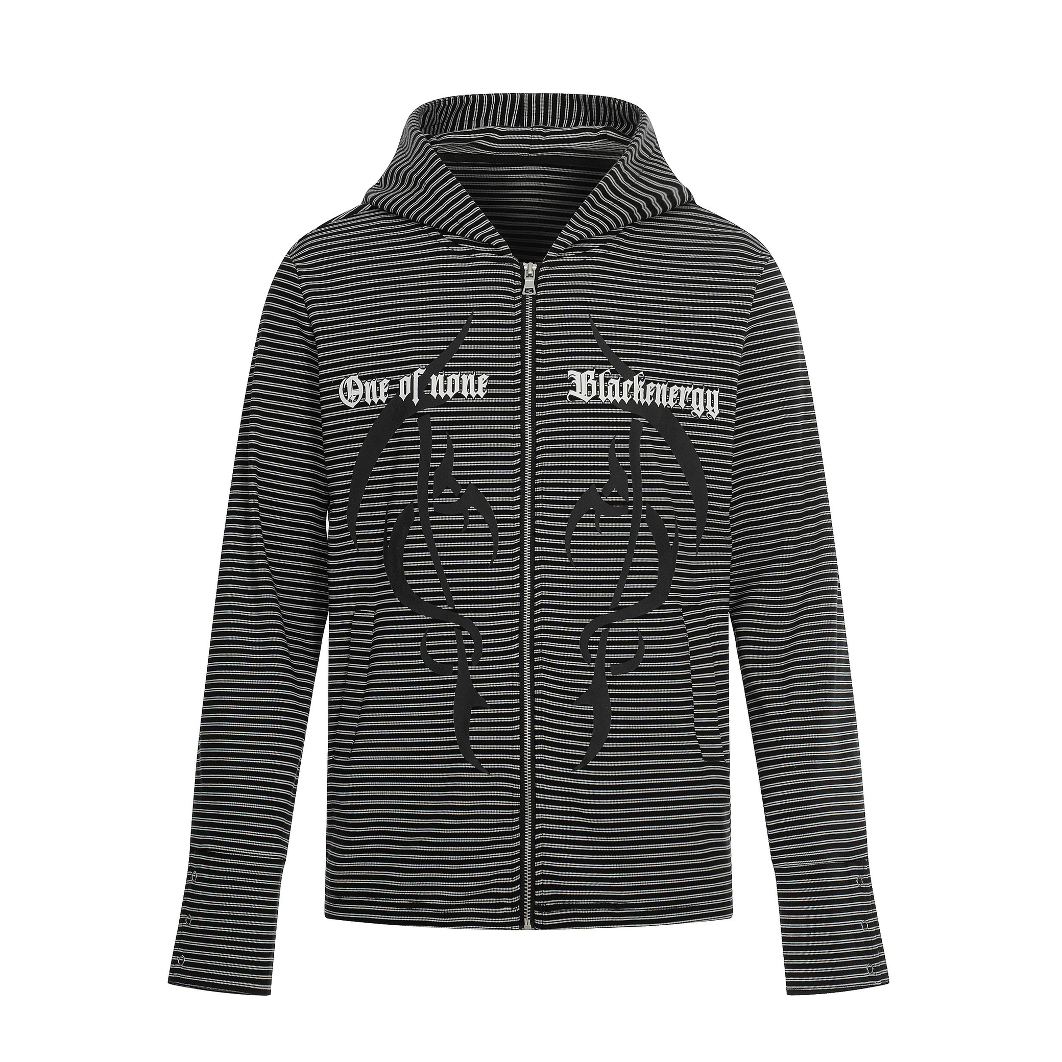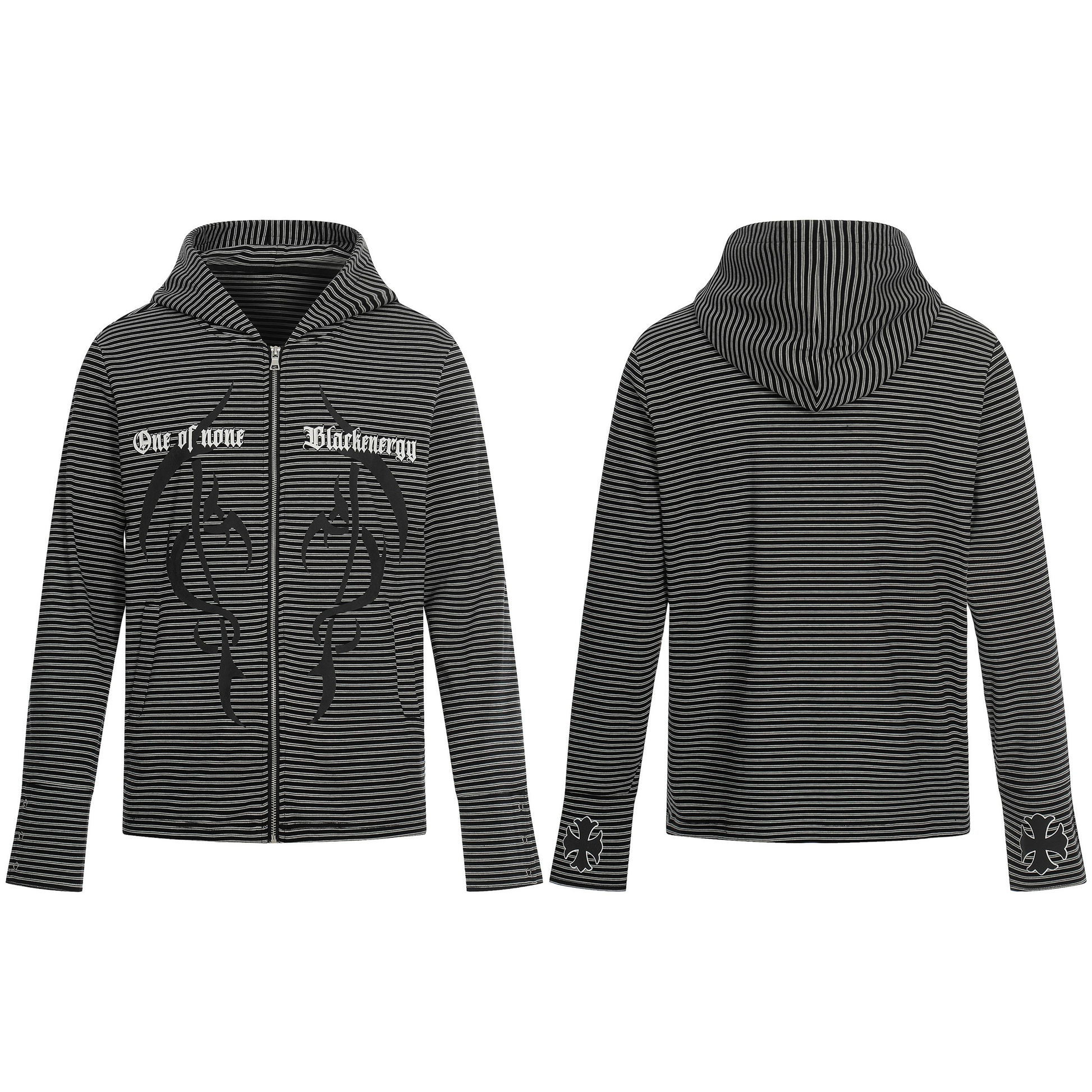 The Omirad Striped Graphic Zip Hoodie features a full zip-up hoodie silhouette with an all-over horizontal stripe pattern and bold symmetrical graphic prints across the chest. Designed for a clean yet expressive streetwear look, this piece balances visual impact with everyday wearability.