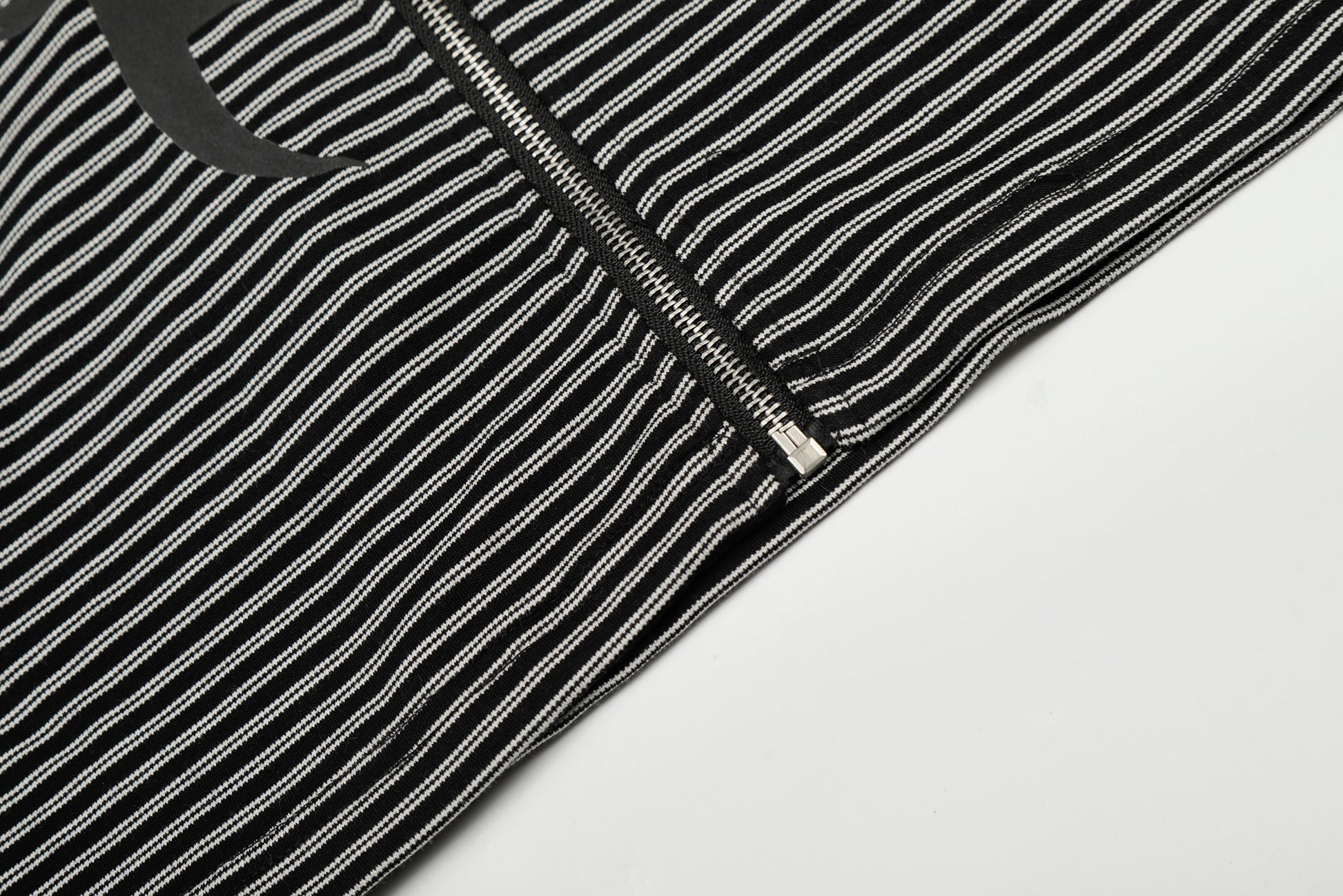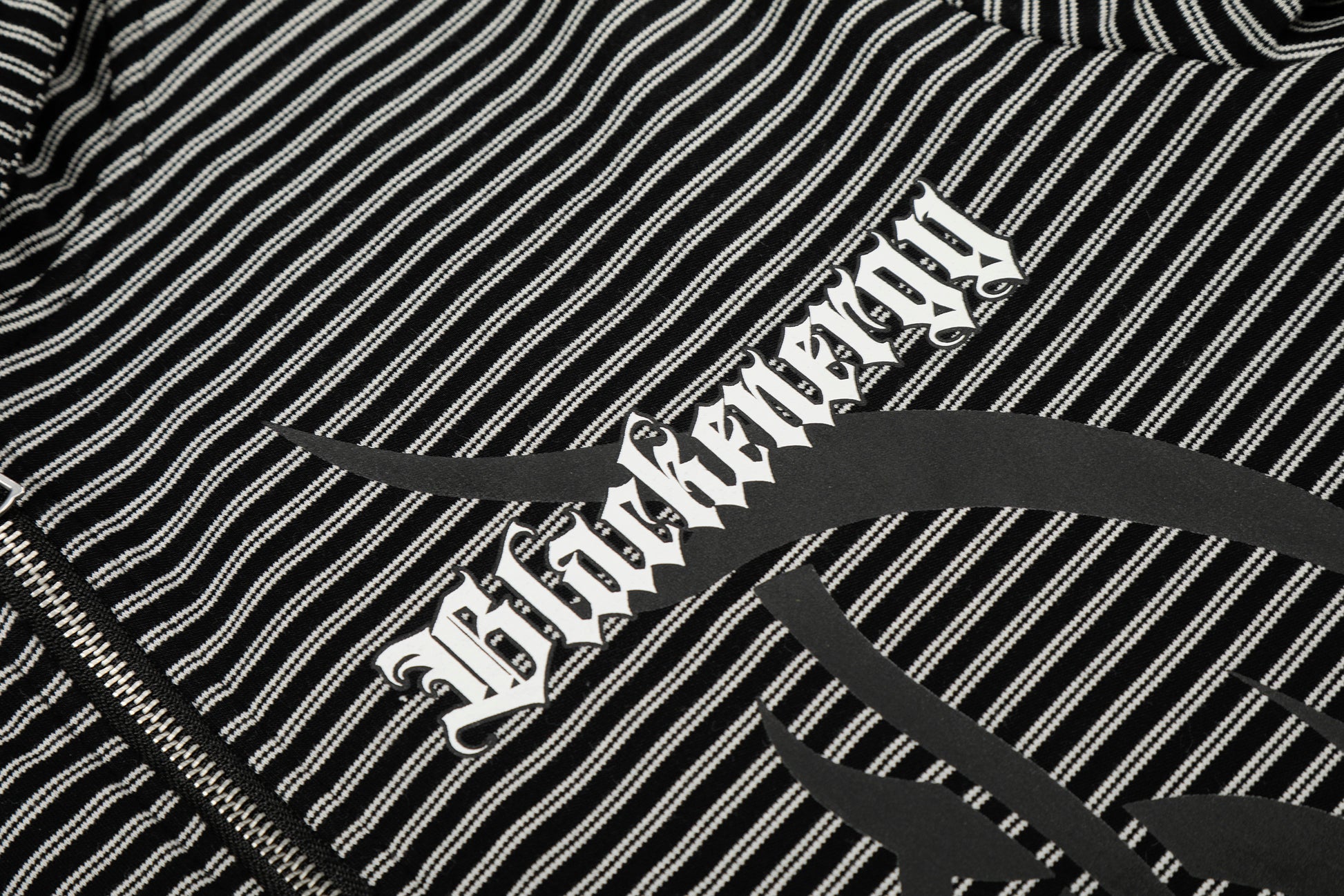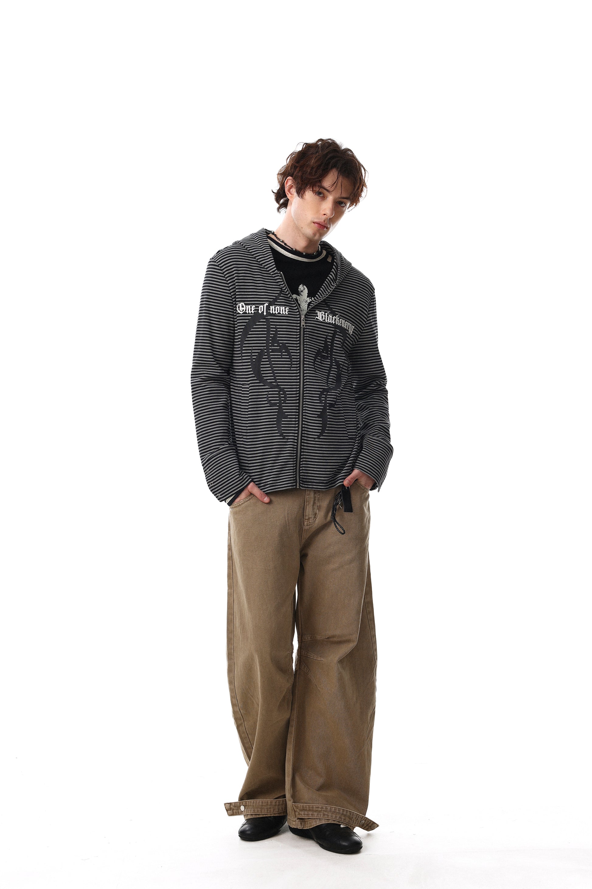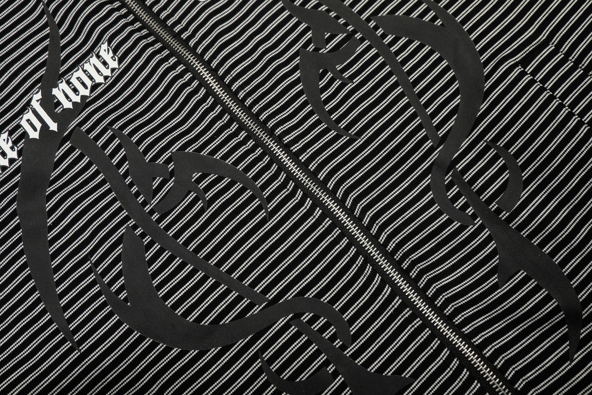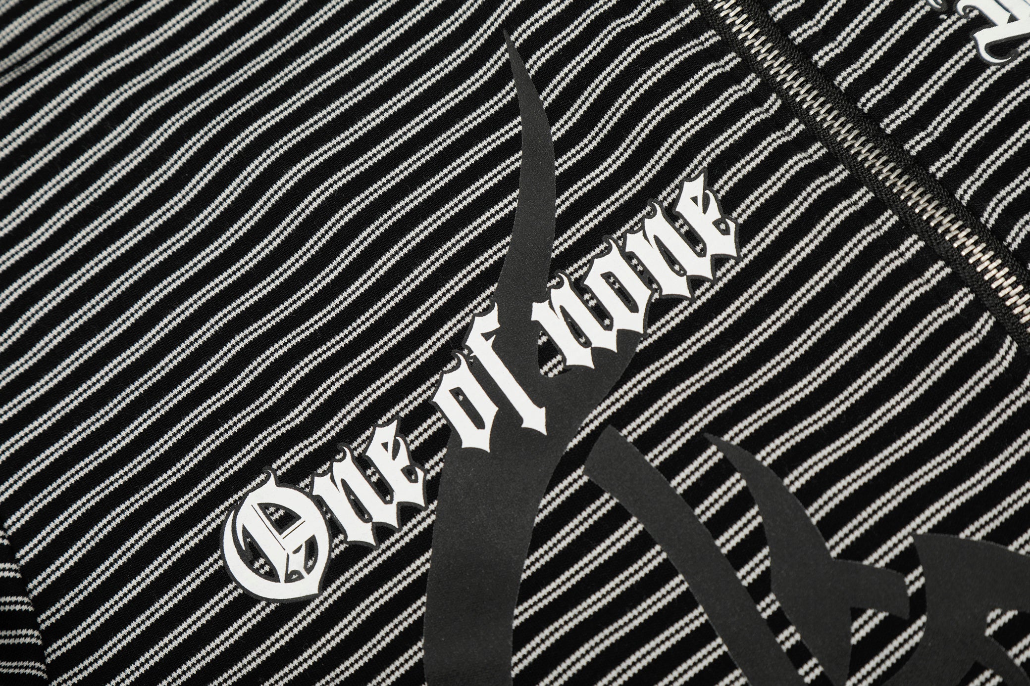 The Omirad Striped Graphic Zip Hoodie features a full zip-up hoodie silhouette with an all-over horizontal stripe pattern and bold symmetrical graphic prints across the chest. Designed for a clean yet expressive streetwear look, this piece balances visual impact with everyday wearability.