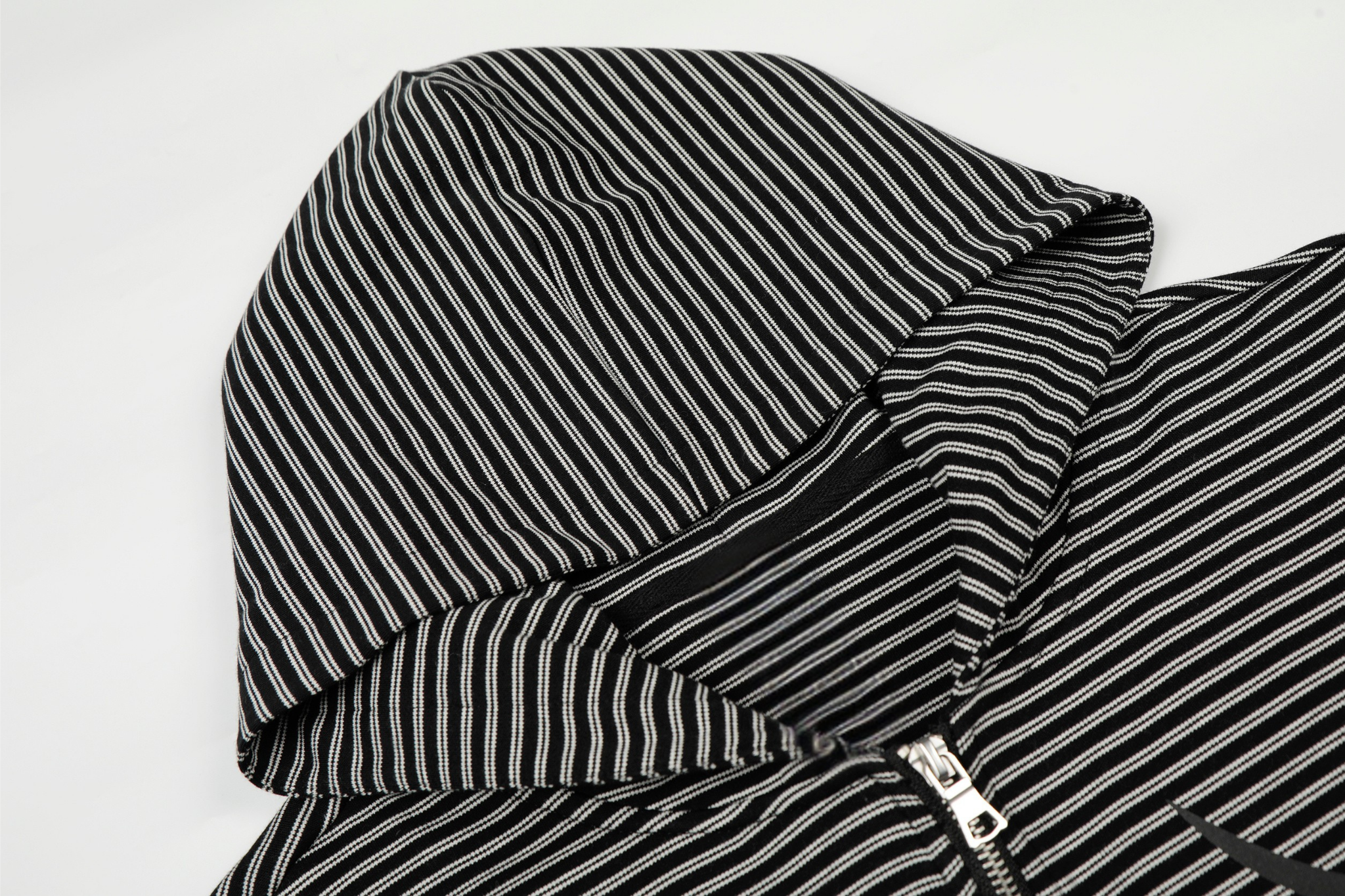 Clothing details: Full zip-front closure, attached hood design, all-over striped fabric, chest graphic prints, sleeve emblem detail, ribbed cuffs and hem, relaxed fit.