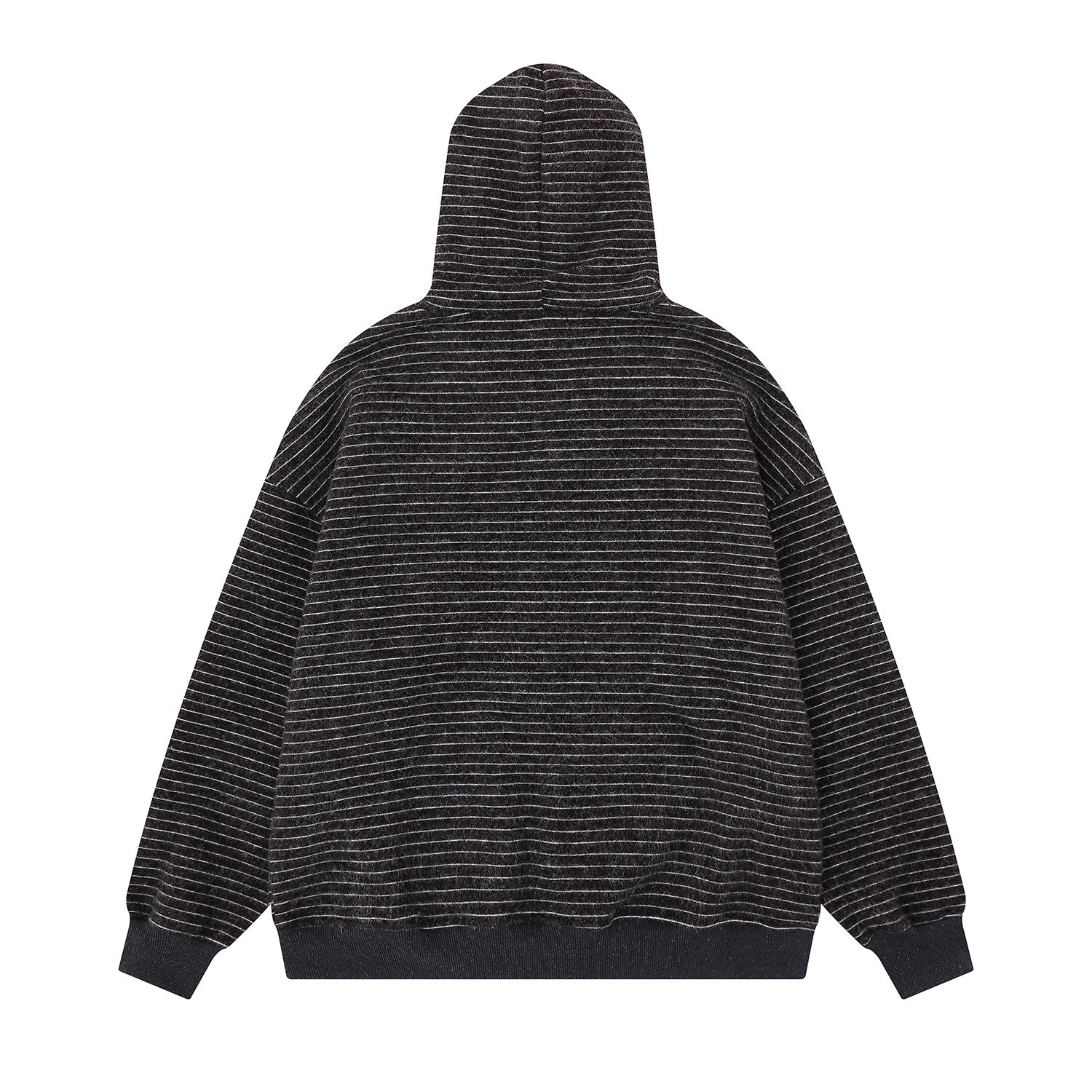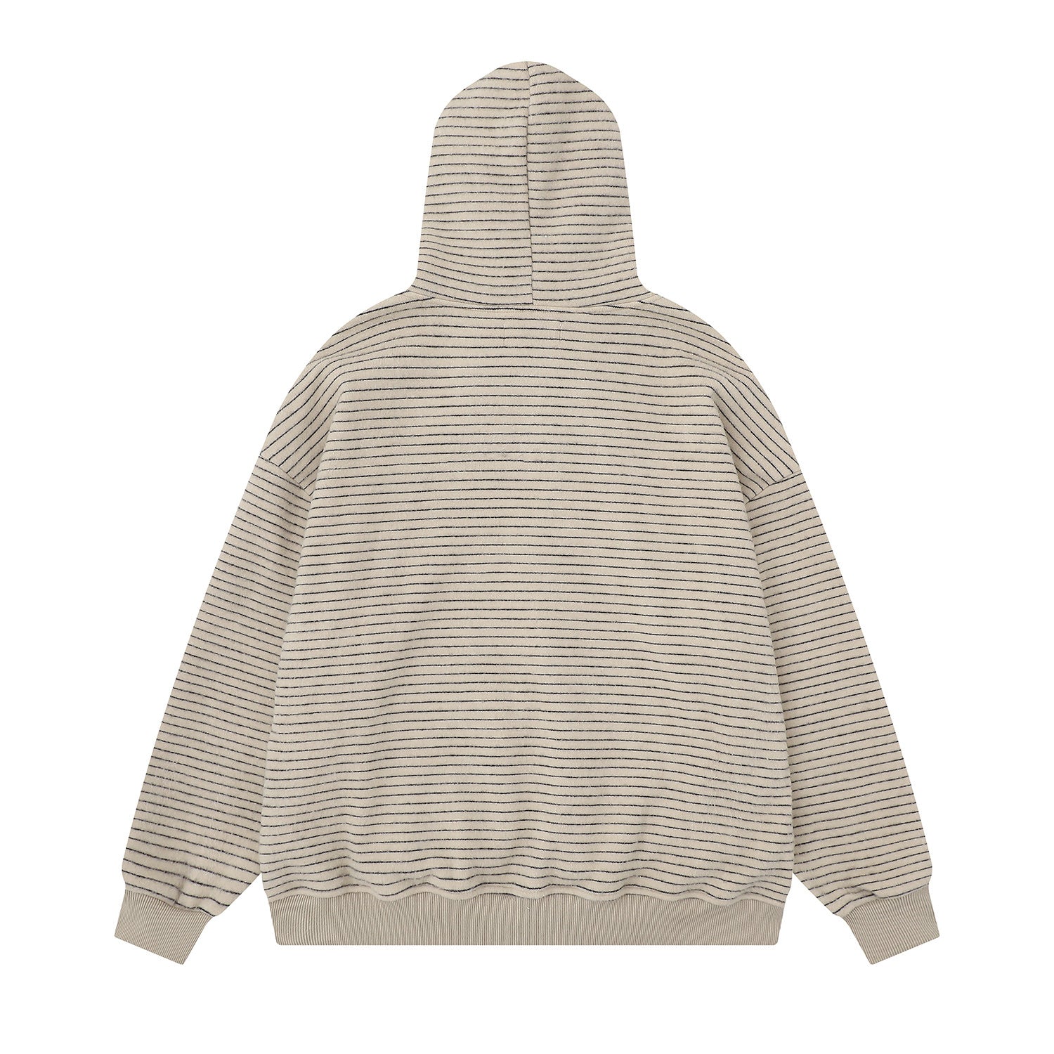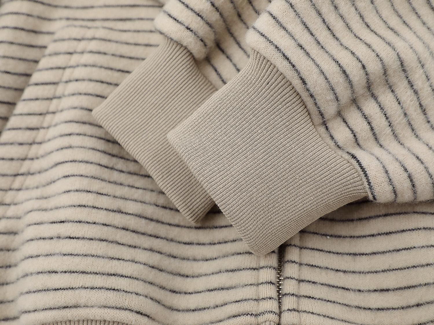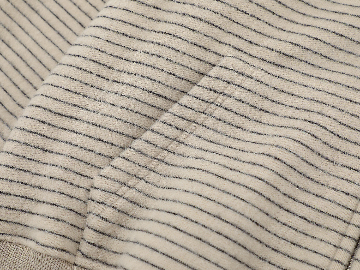 Clothing details: Fine horizontal stripe knit texture, full-zip front closure, adjustable hood, ribbed cuffs and hem, side hand pockets, relaxed street fit, lightweight warmth, neutral color options.