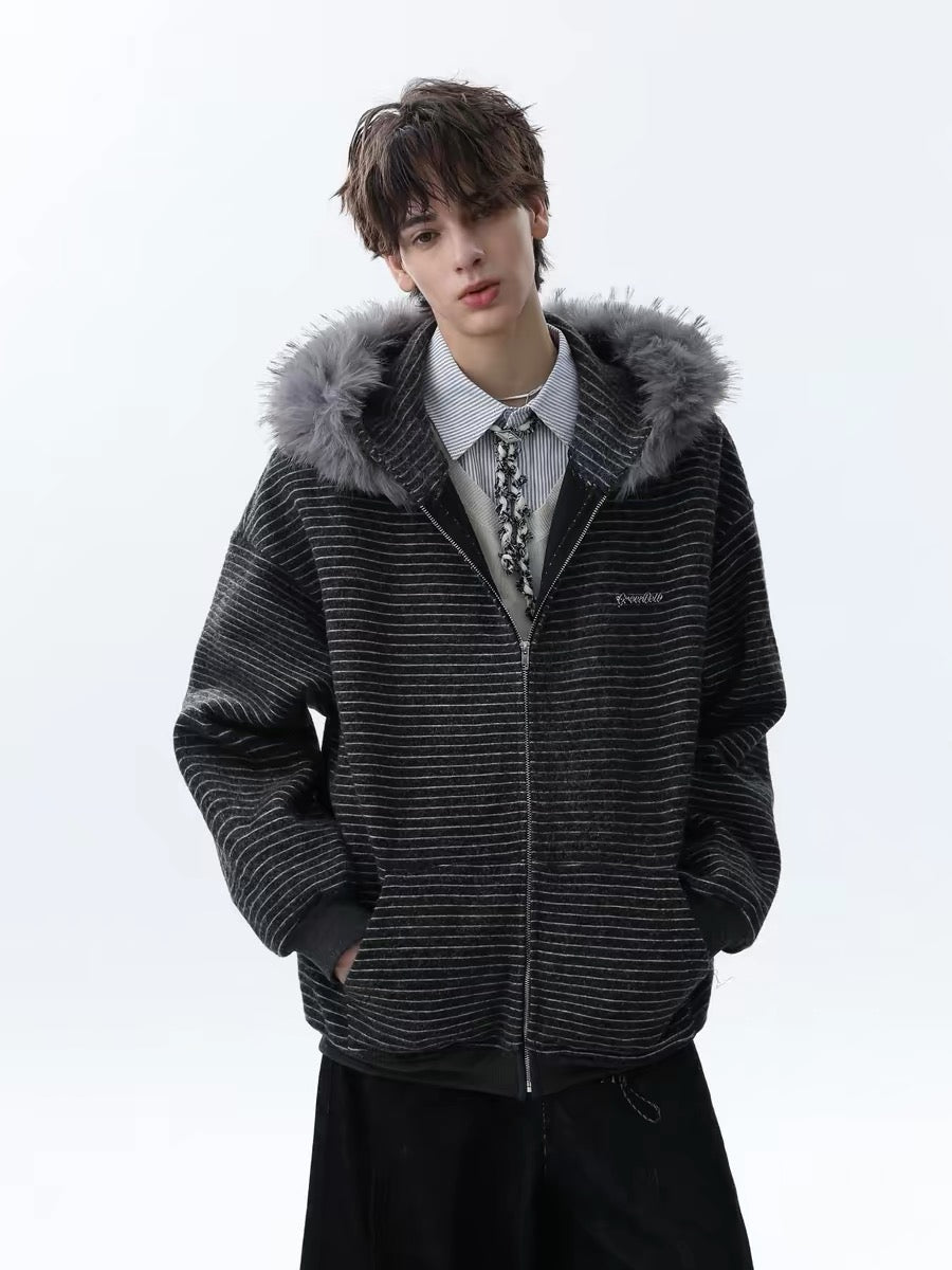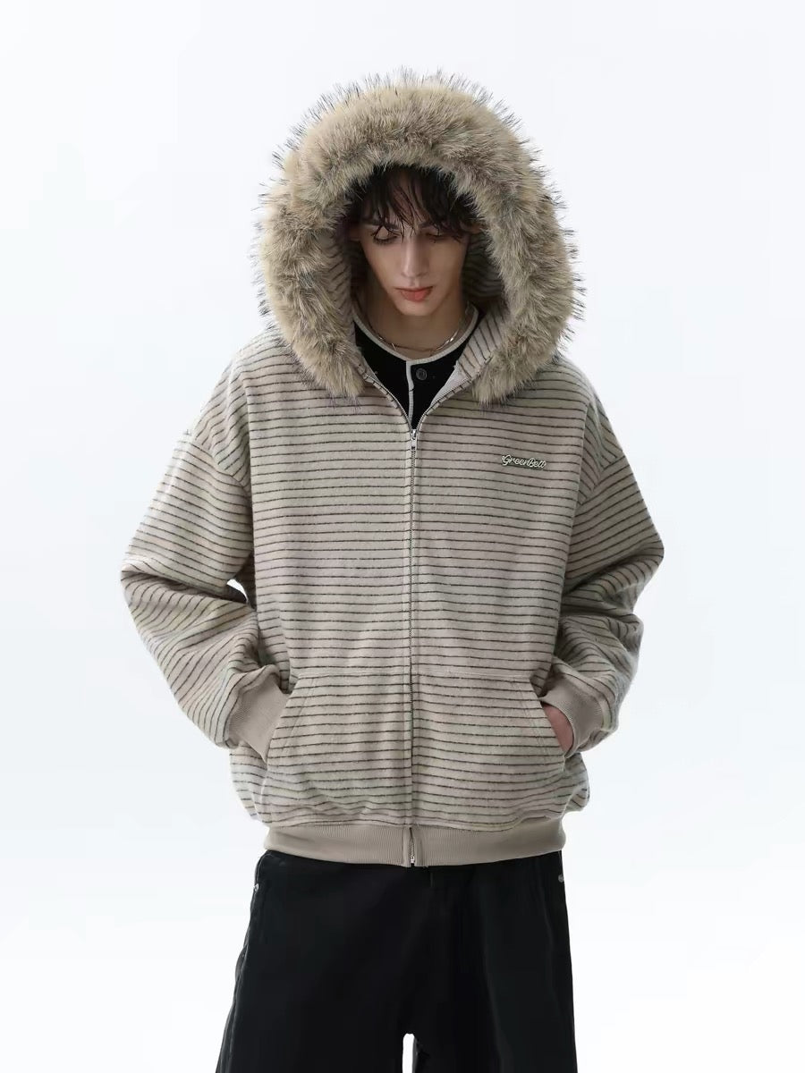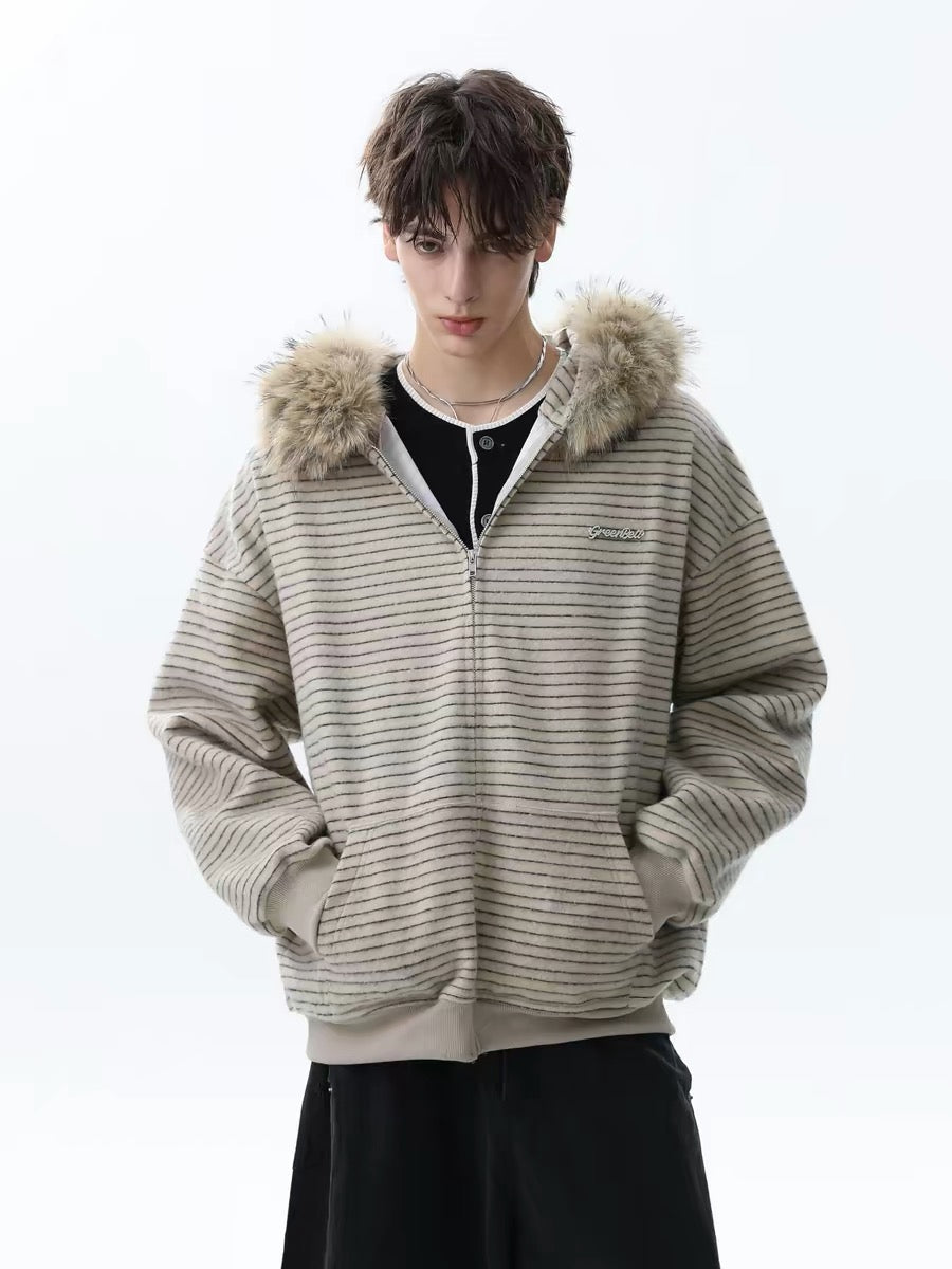 Clothing details: Fine horizontal stripe knit texture, full-zip front closure, adjustable hood, ribbed cuffs and hem, side hand pockets, relaxed street fit, lightweight warmth, neutral color options.