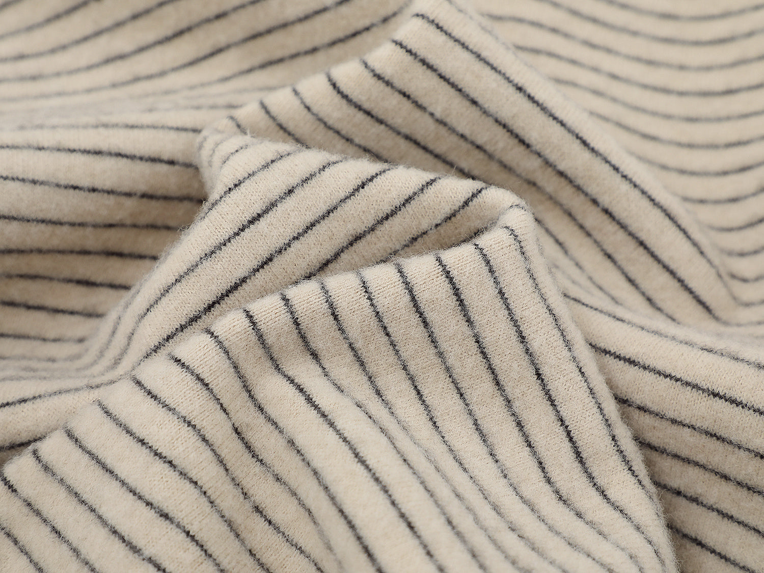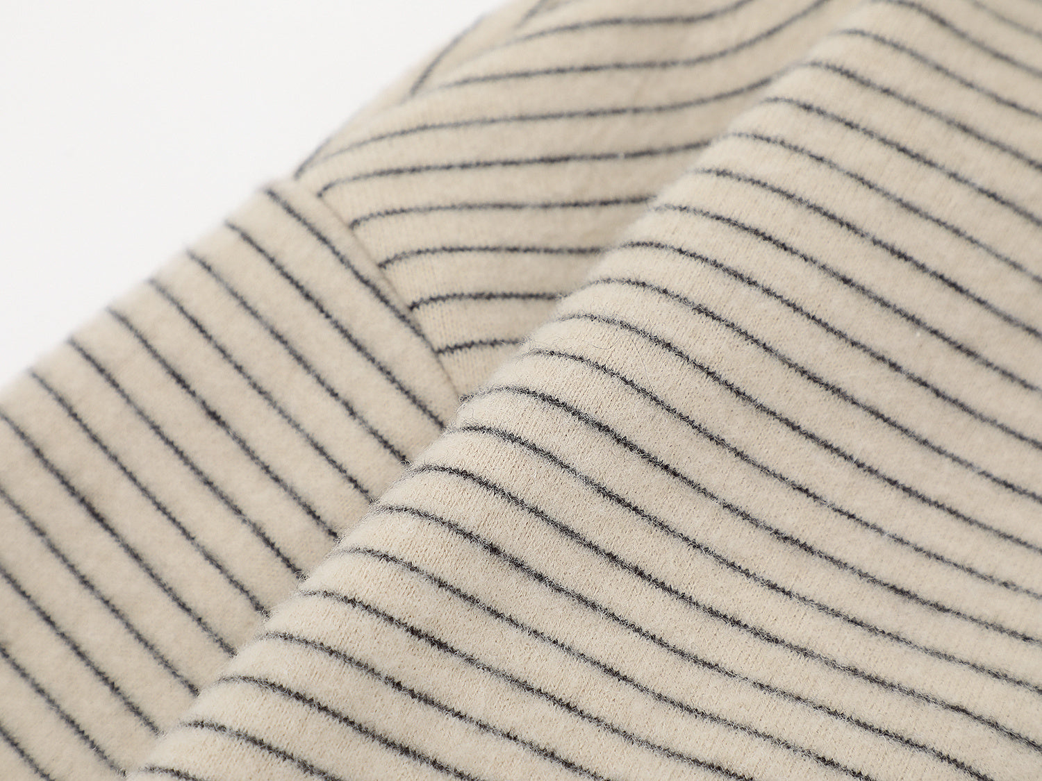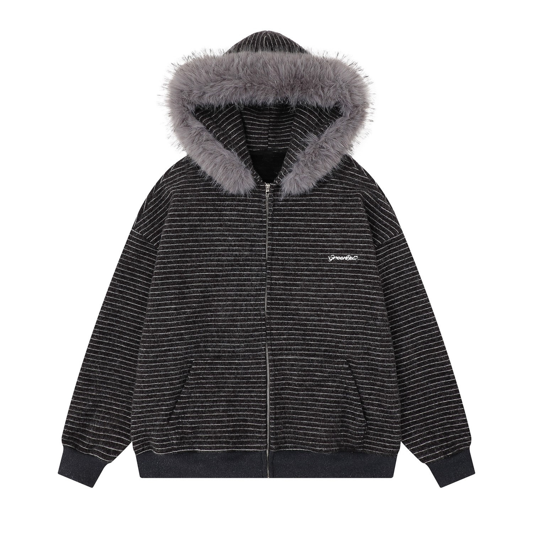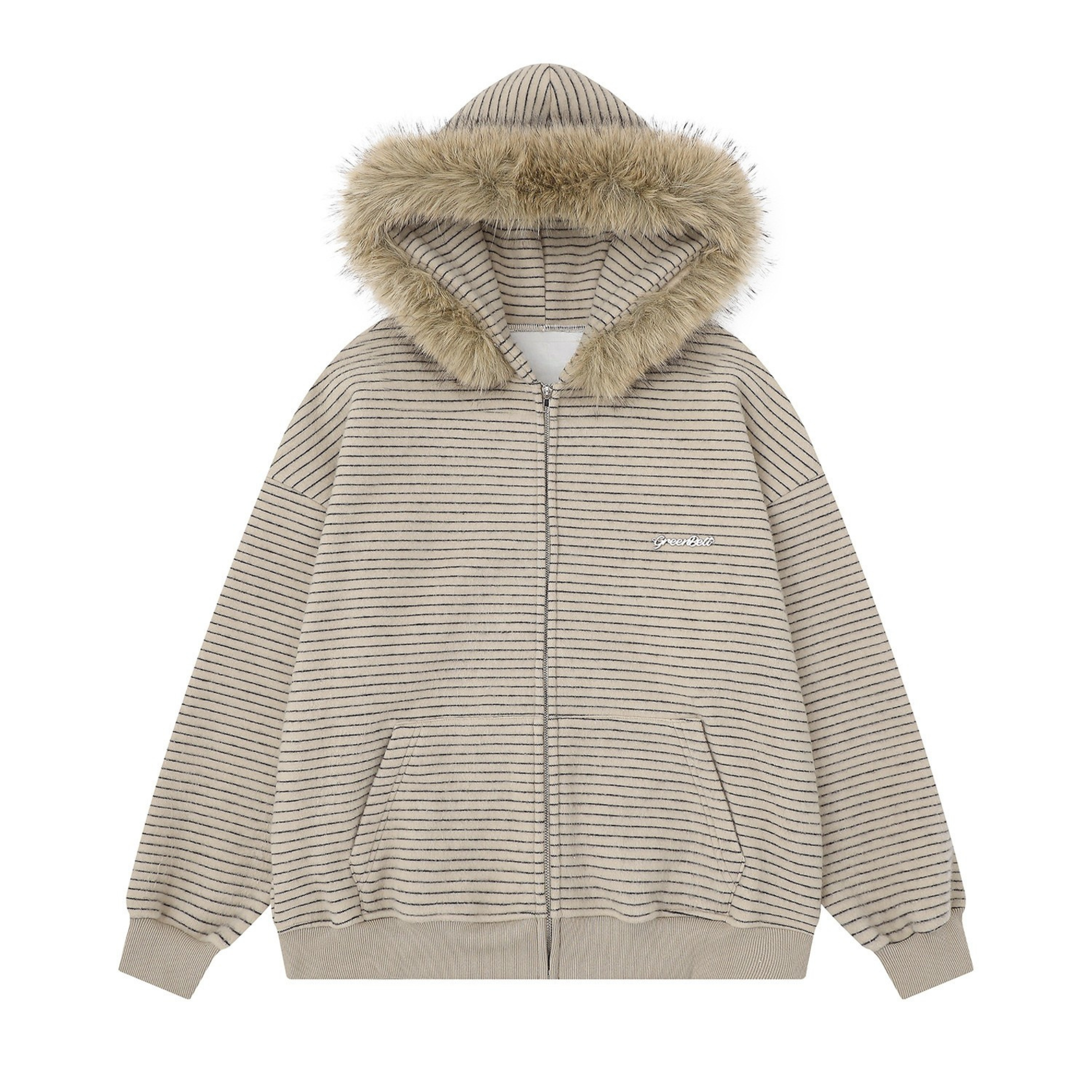 Clothing details: Fine horizontal stripe knit texture, full-zip front closure, adjustable hood, ribbed cuffs and hem, side hand pockets, relaxed street fit, lightweight warmth, neutral color options.