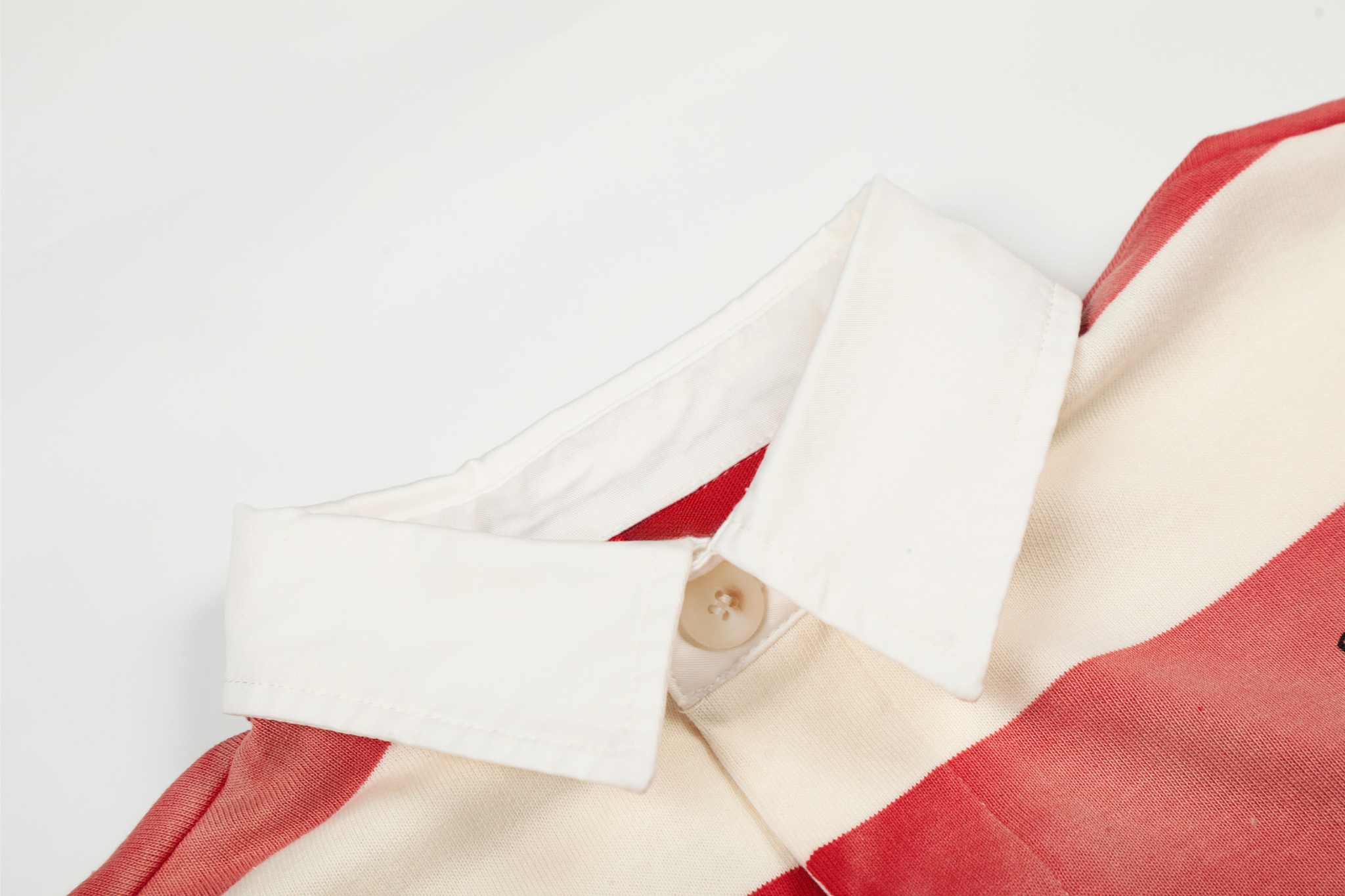Clothing details: Rugby-style collar, long sleeves, all-over stripe pattern, chest graphic detailing, back statement print, button placket, relaxed fit.
