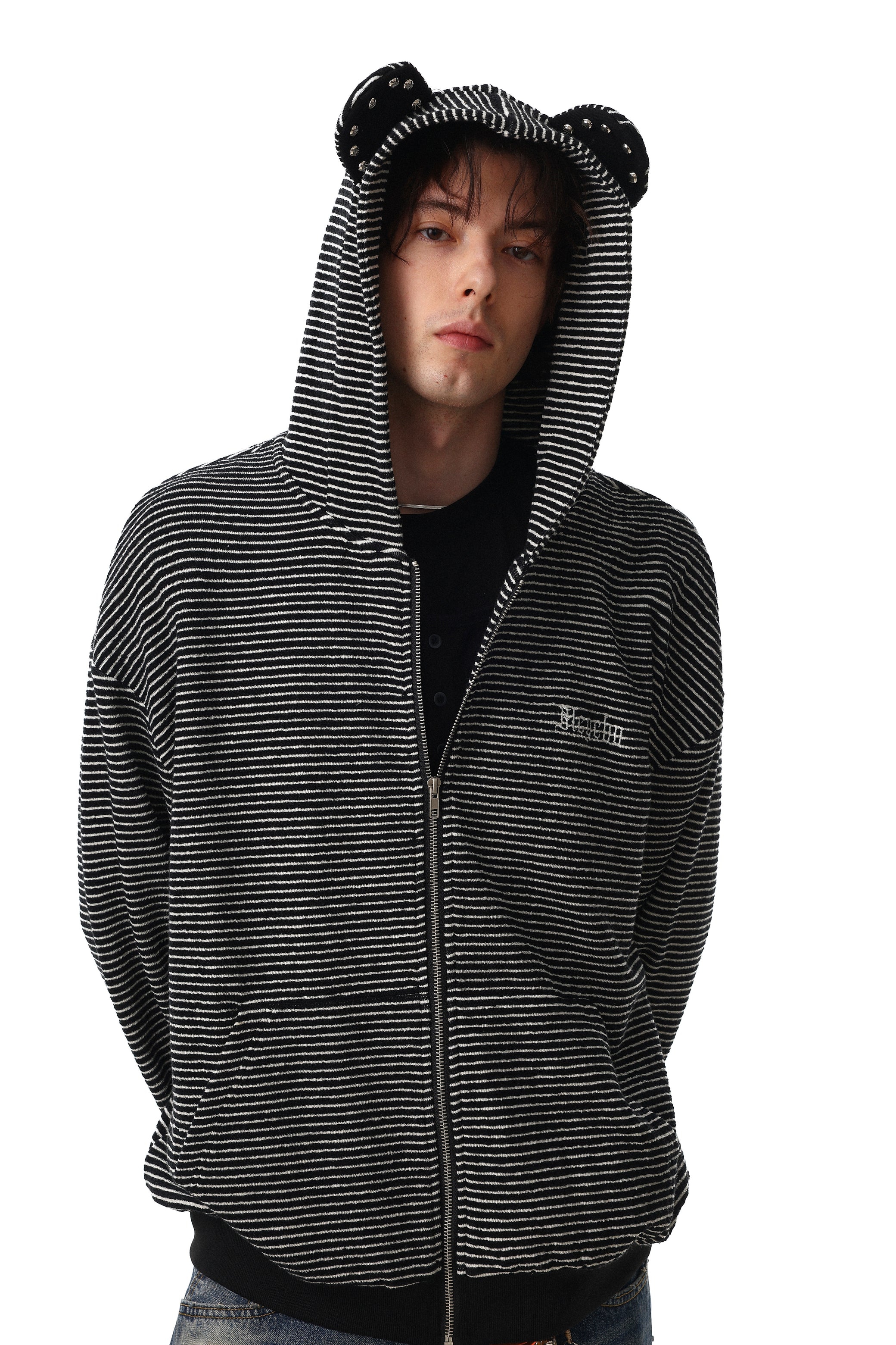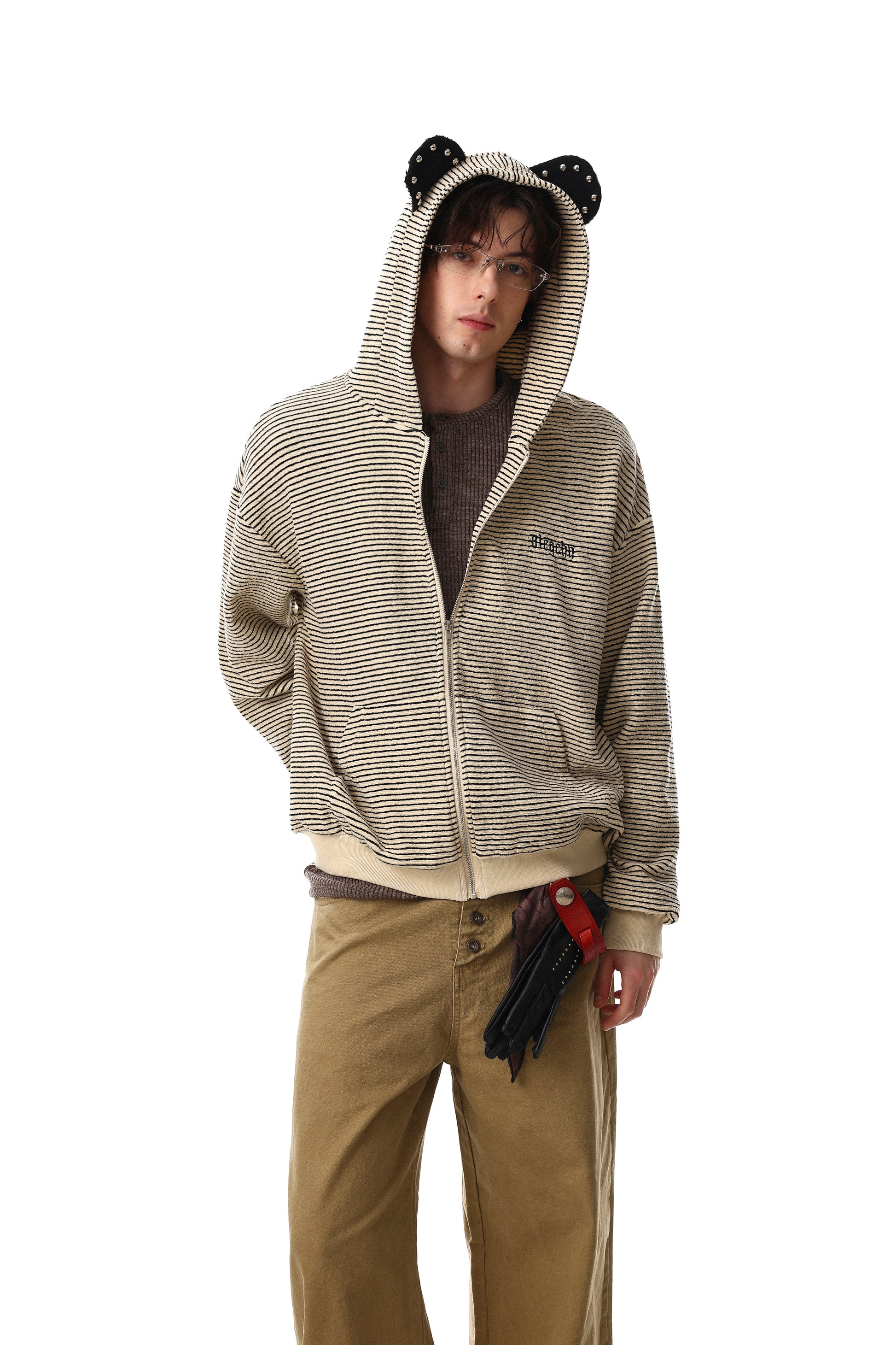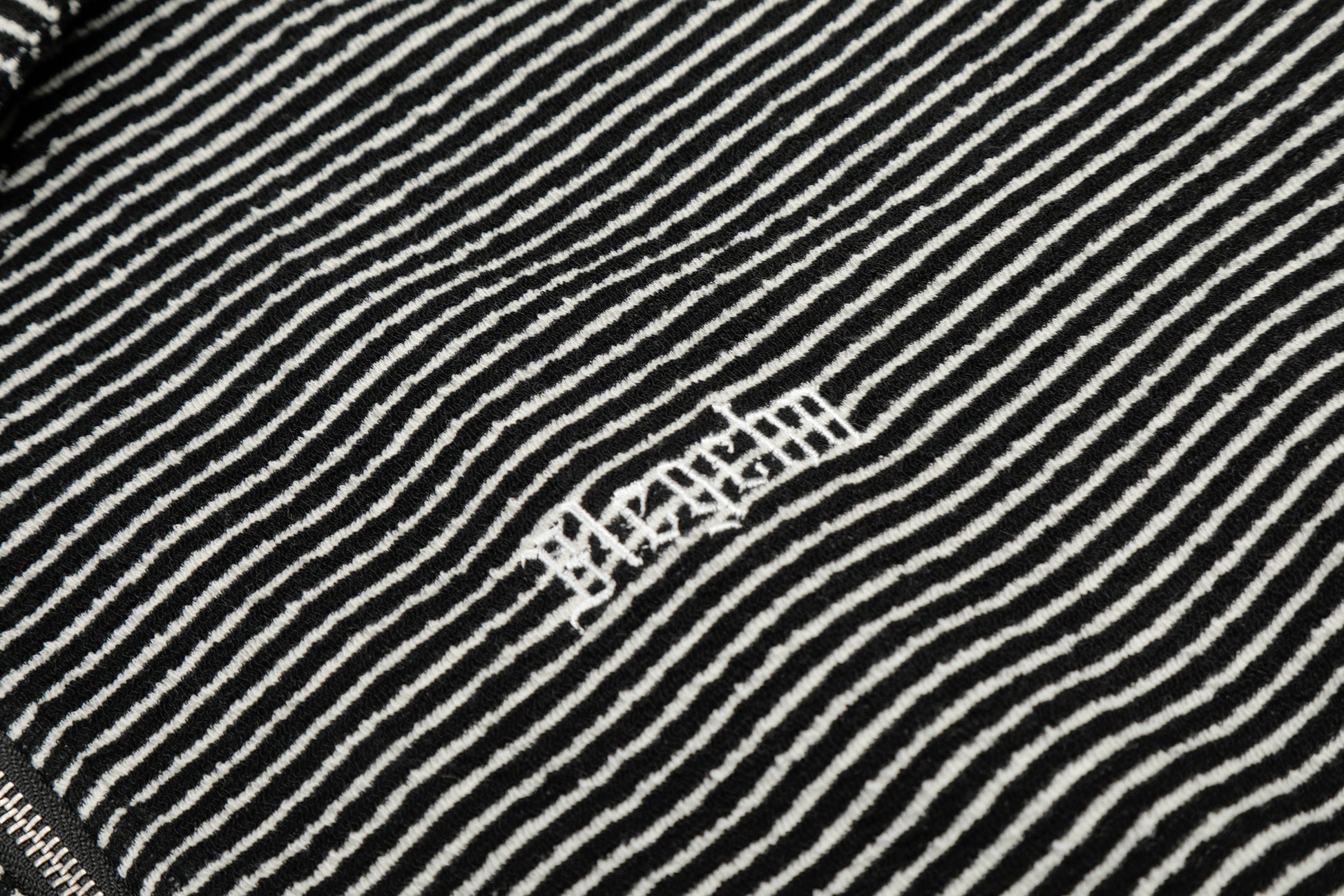 Clothing details: Full zip-front closure, attached hood design, all-over stripe fabric, chest logo detail, front pockets, ribbed cuffs and hem, relaxed fit.